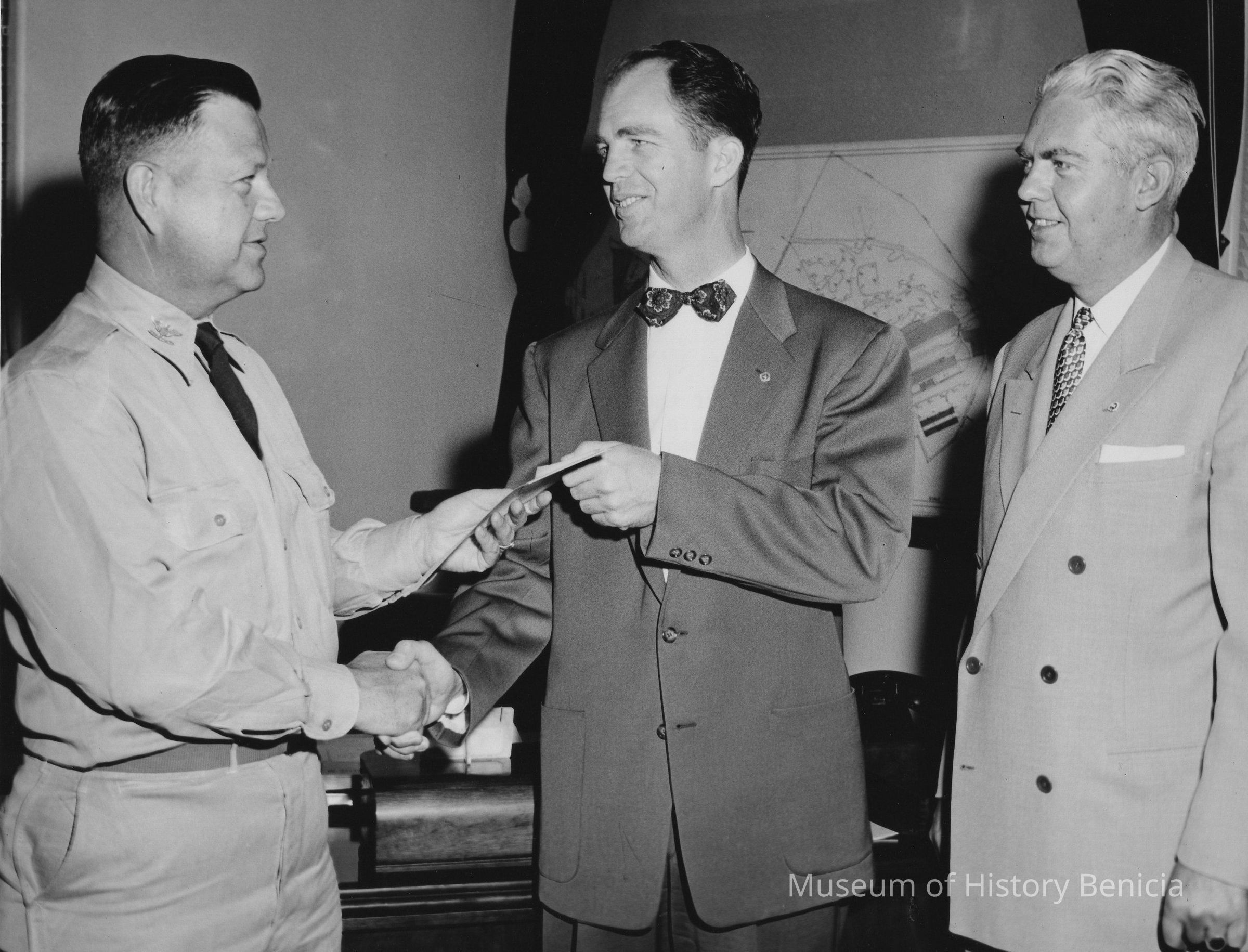 B/W Photograph: man being presented with papers by man in uniform; another man looks on. Map behind. On back: on left, "Walter Kamb" in ink; on right, "Colonel Francis Hall" in ink; and U.S. Army stamp.