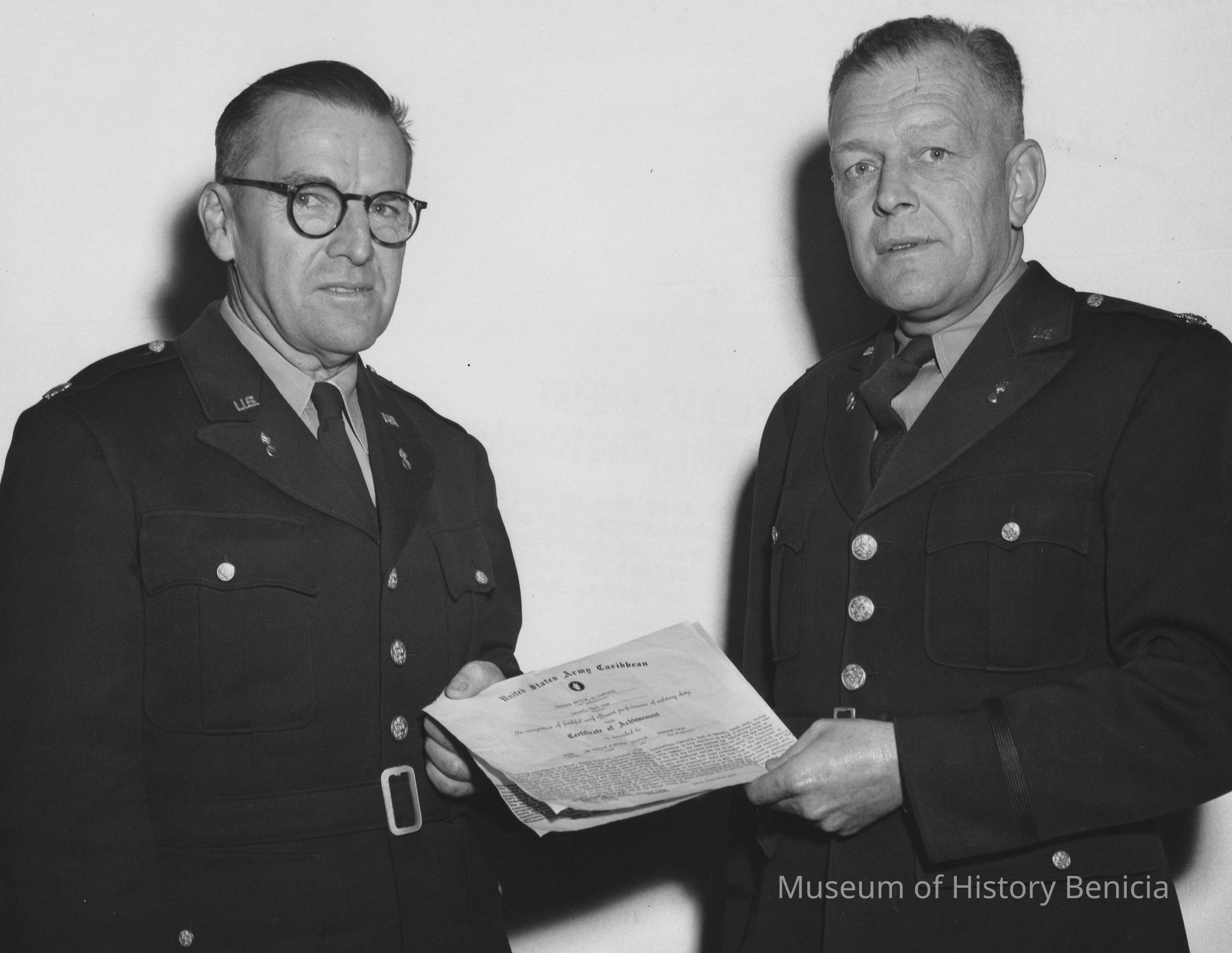 B/W Photograph: two men in uniform holding "United States Army Caribbean... Certificate of Achievement". On back: at left, "Colonel J. Paul Lawther, Commanding Officer, B.A." in ink; "04071-368-1 / AM-56"; and U.S. Army stamp.
