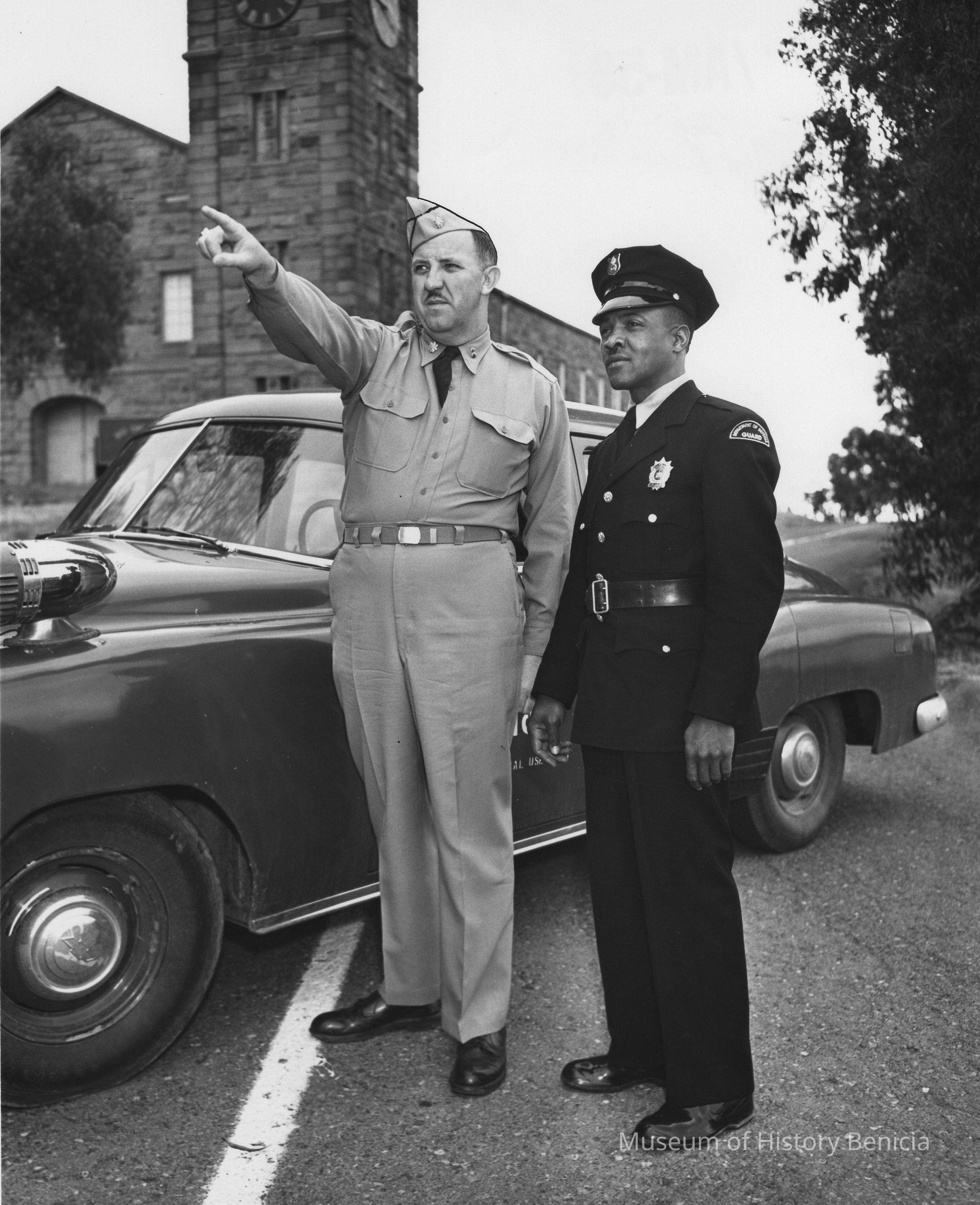 B/W Photograph: In front of Clock Tower: Man in uniform pointing in direction of Commandant's for man with "Dept. of Defense Guard" patch on left shoulder. Car behind them. On back: "04071-451-1 / AM-56" and U.S. Army stamp.