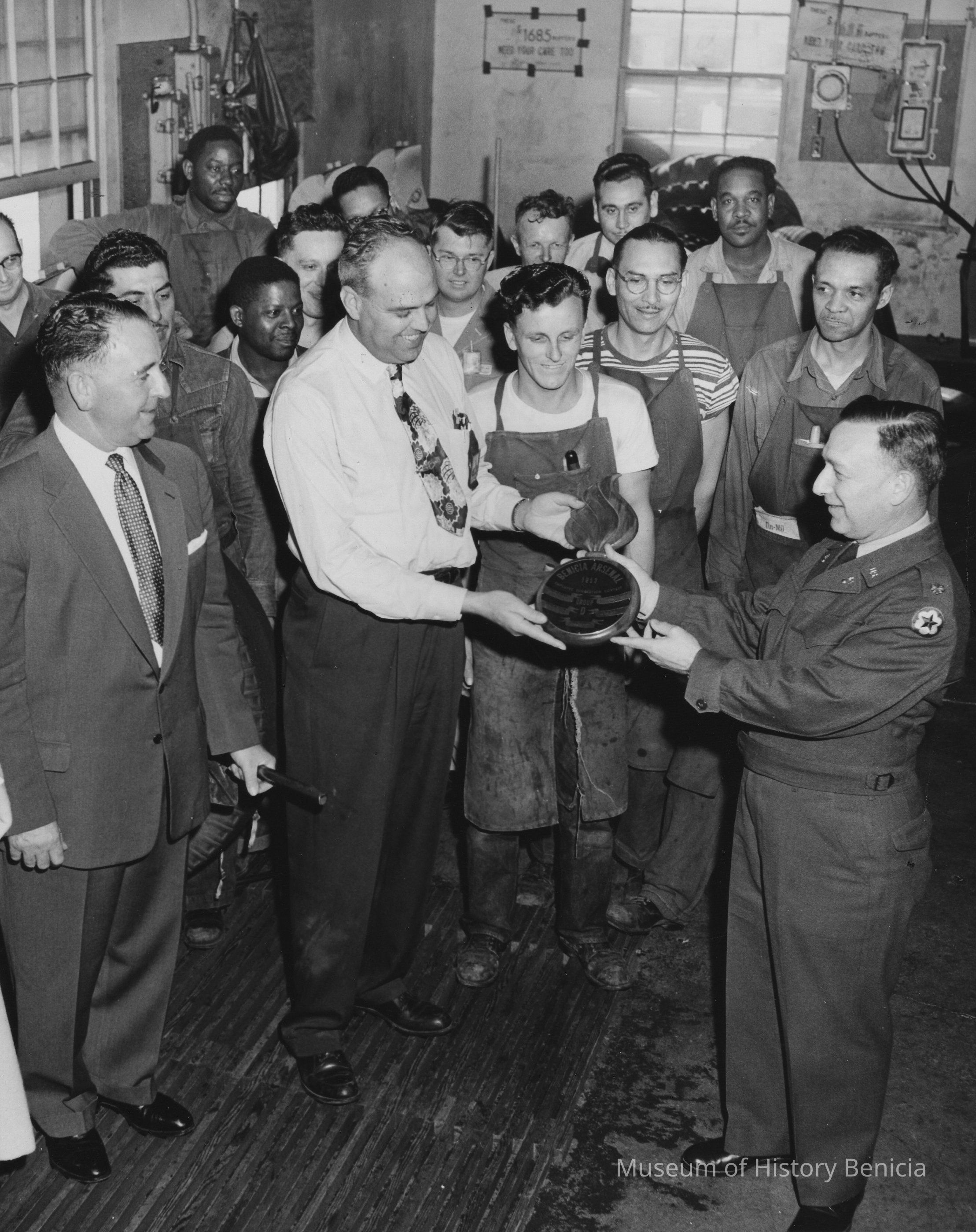 B/W Photograph: two men holding Benicia Arsenal plaque (in the shape of a flaming bomb) dated 1953. Group of men behind. On back: on upper left corner, a circled 2 in ink; and the U.S. Army stamp.Collection