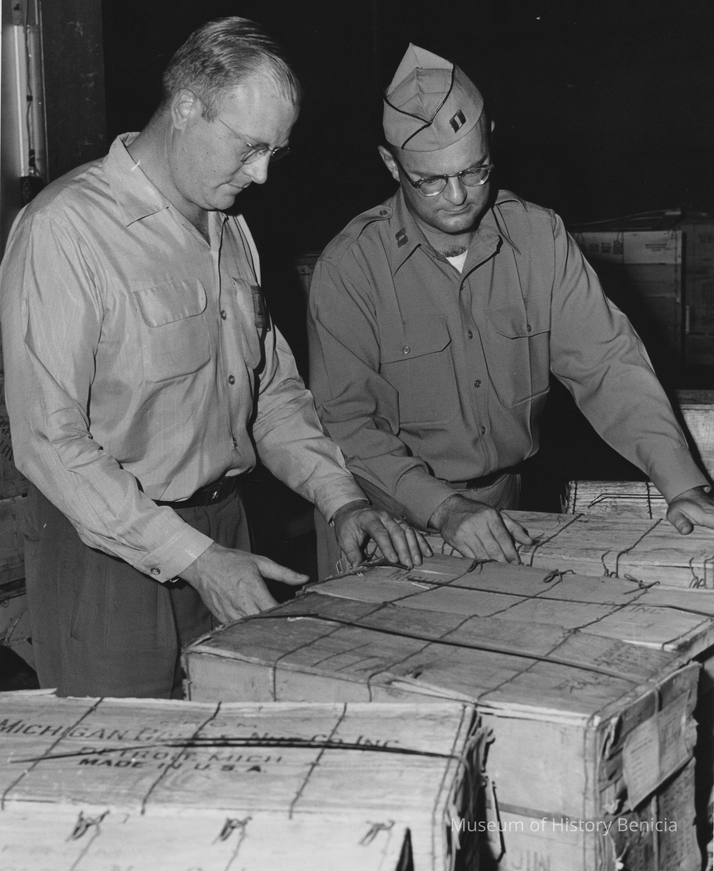 B/W Photograph: two men, one uniformed (insignia indicate he is a Captain), with boxes. U.S. Army photo stamp on back.Collection