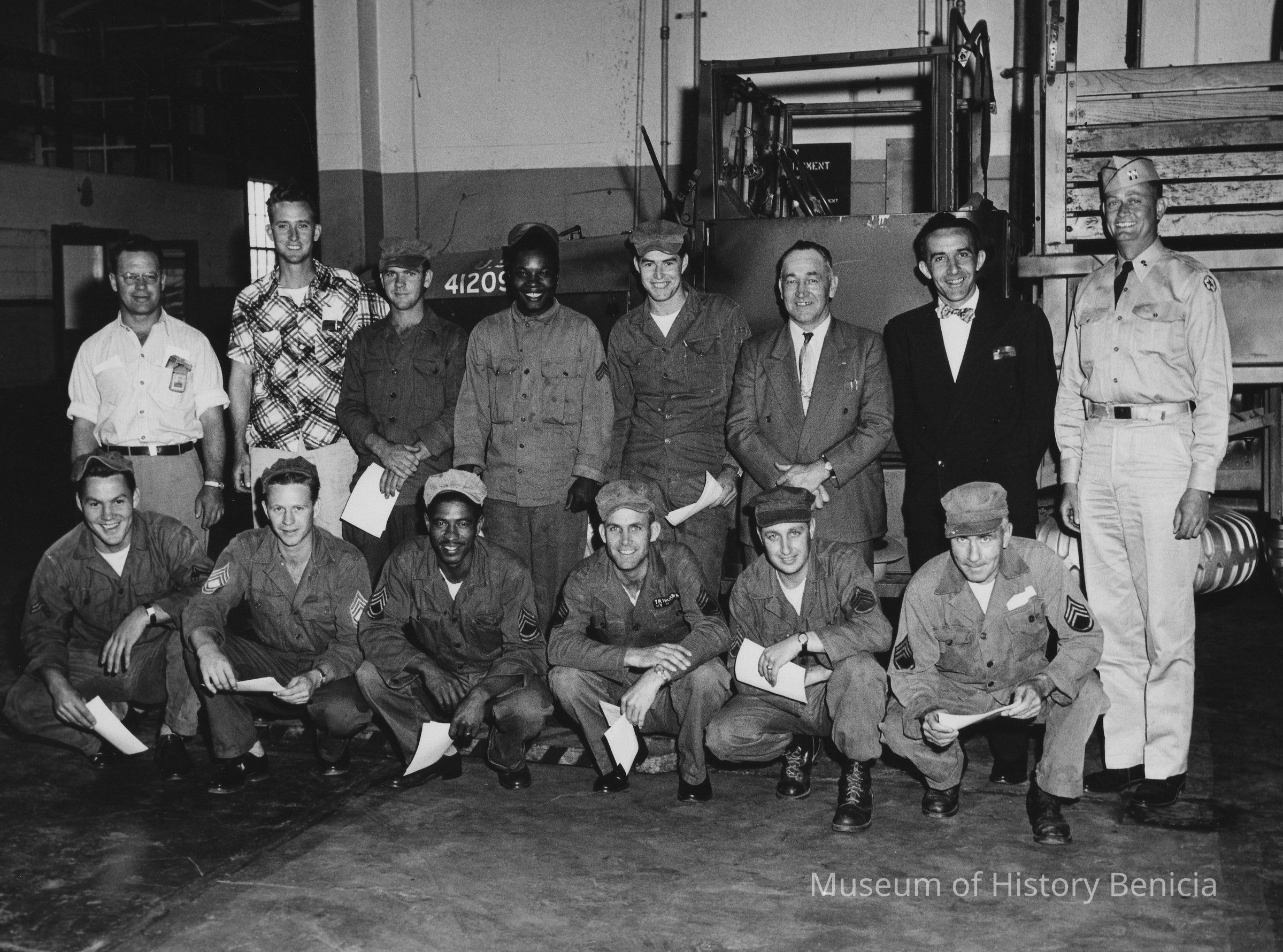 B/W Photograph: two rows of men, many are in uniform (privates and sergeants), an officer stands at the right, most holding certificates. "Benicia Arsenal" written on back in ink.Collection
