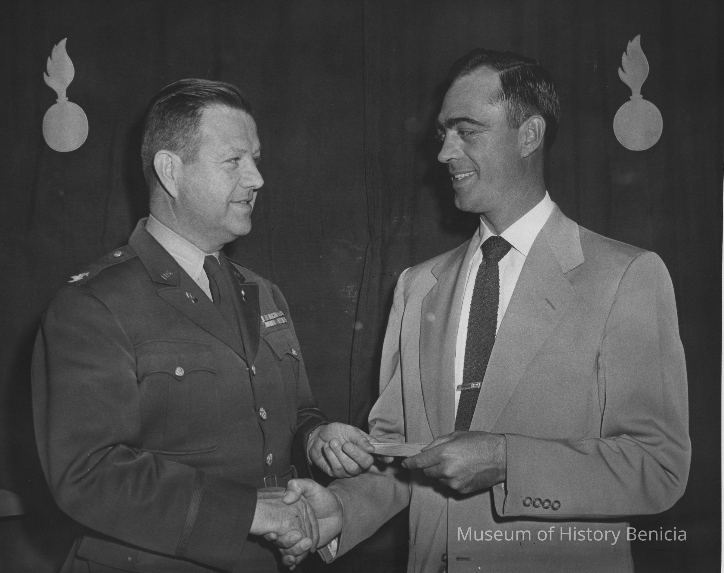 B/W Photograph: Col. Francis Hall shaking hands, holding a check, with man in suit. Behind is a curtain with flaming bombs. "Col. Francis Hall" written on back in ink.Collection