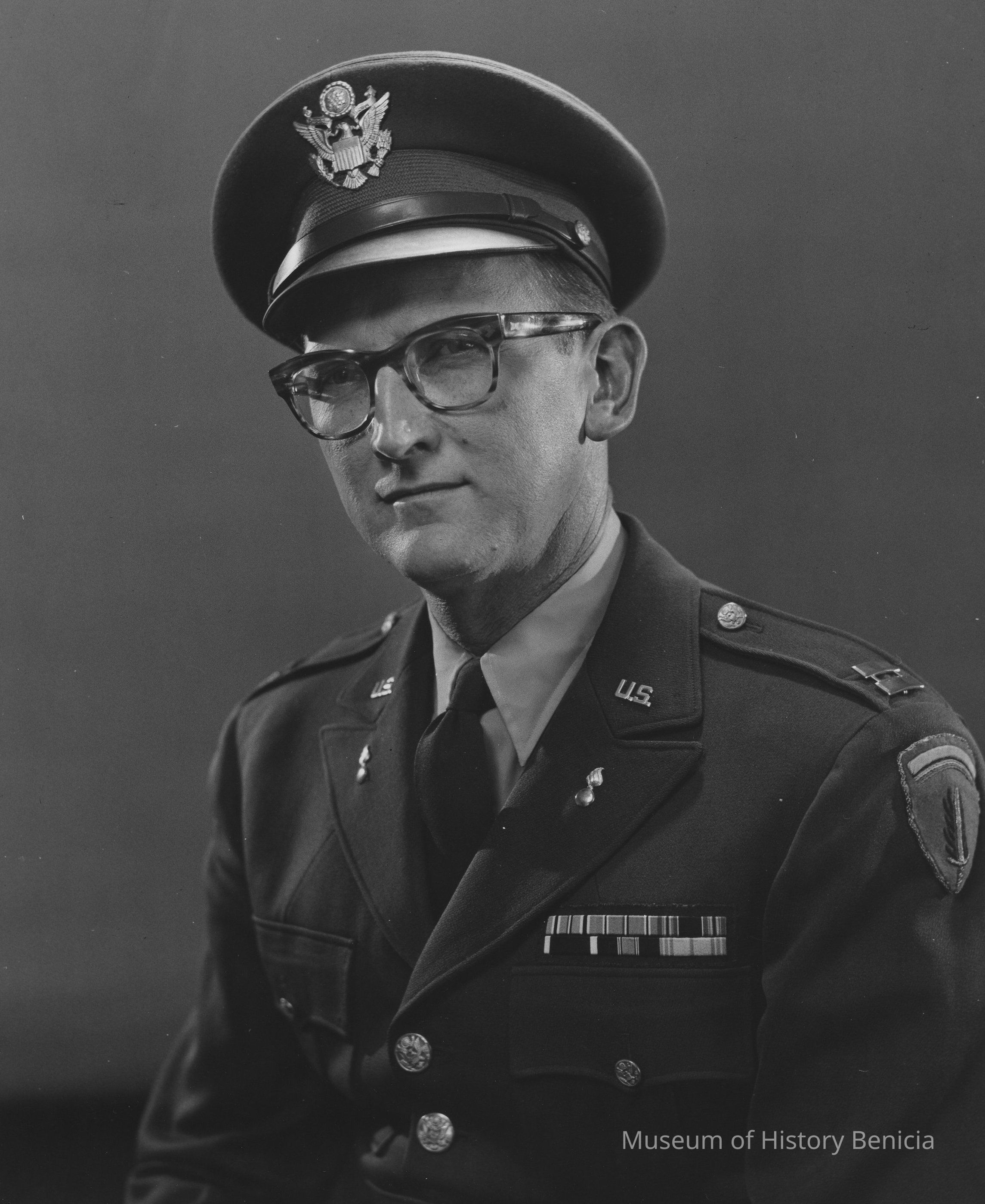 B/W Photograph: 3/4 bust view of middle aged man in dark uniform, cap, and eyeglasses. U.S. Army photo stamp on back, and "04071-233-1 / AM-55" and "11-8-55 Capt. Ralph R. Dillon, at Benicia Arsenal" in green ink.Collection