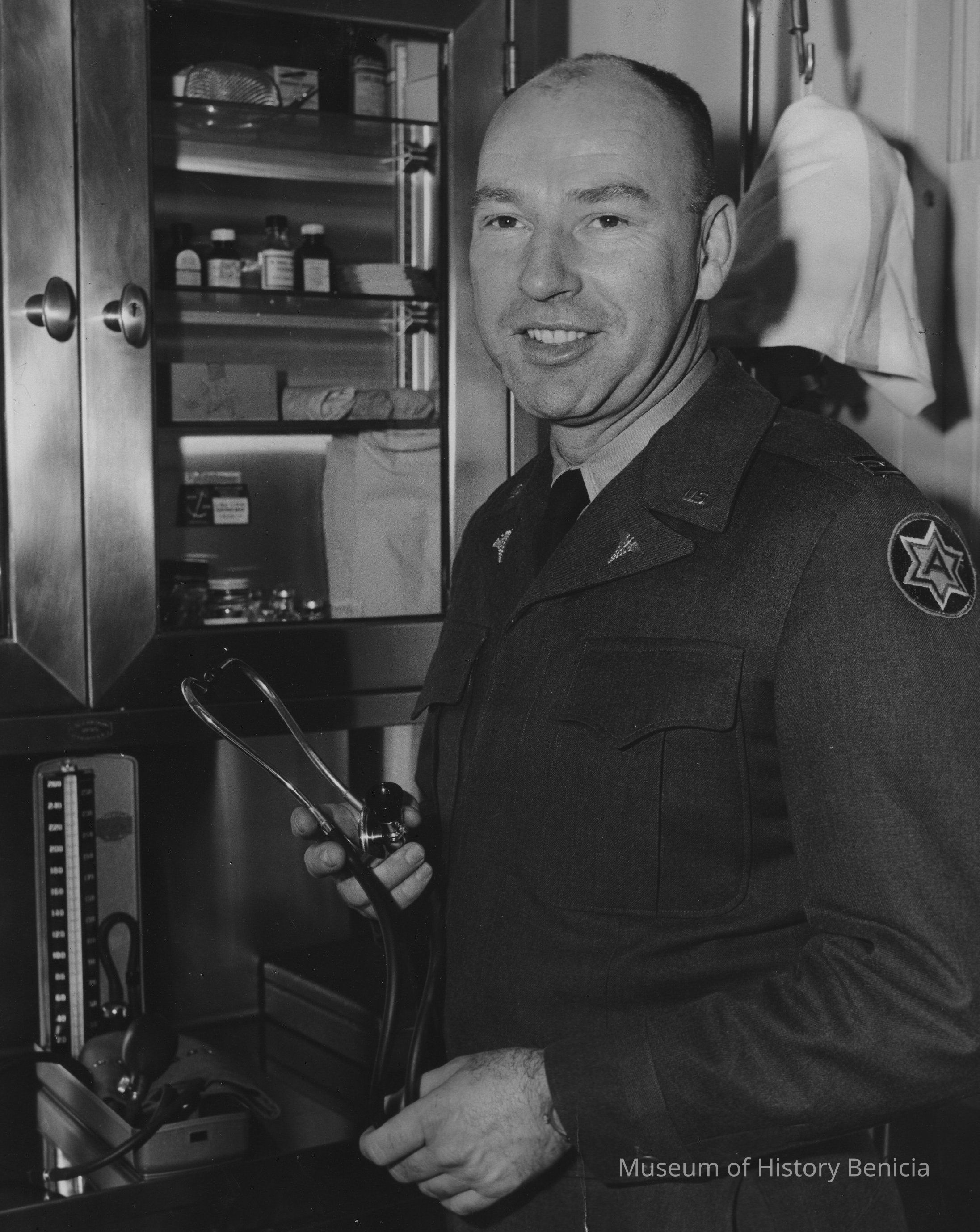B/W Photograph: 3/4 half length view of mid aged man in dark uniform with thinning dark hair, holding stethoscope in medical office. U.S. Army photo stamp and "Capt Robert E. Williams in pencil on back.