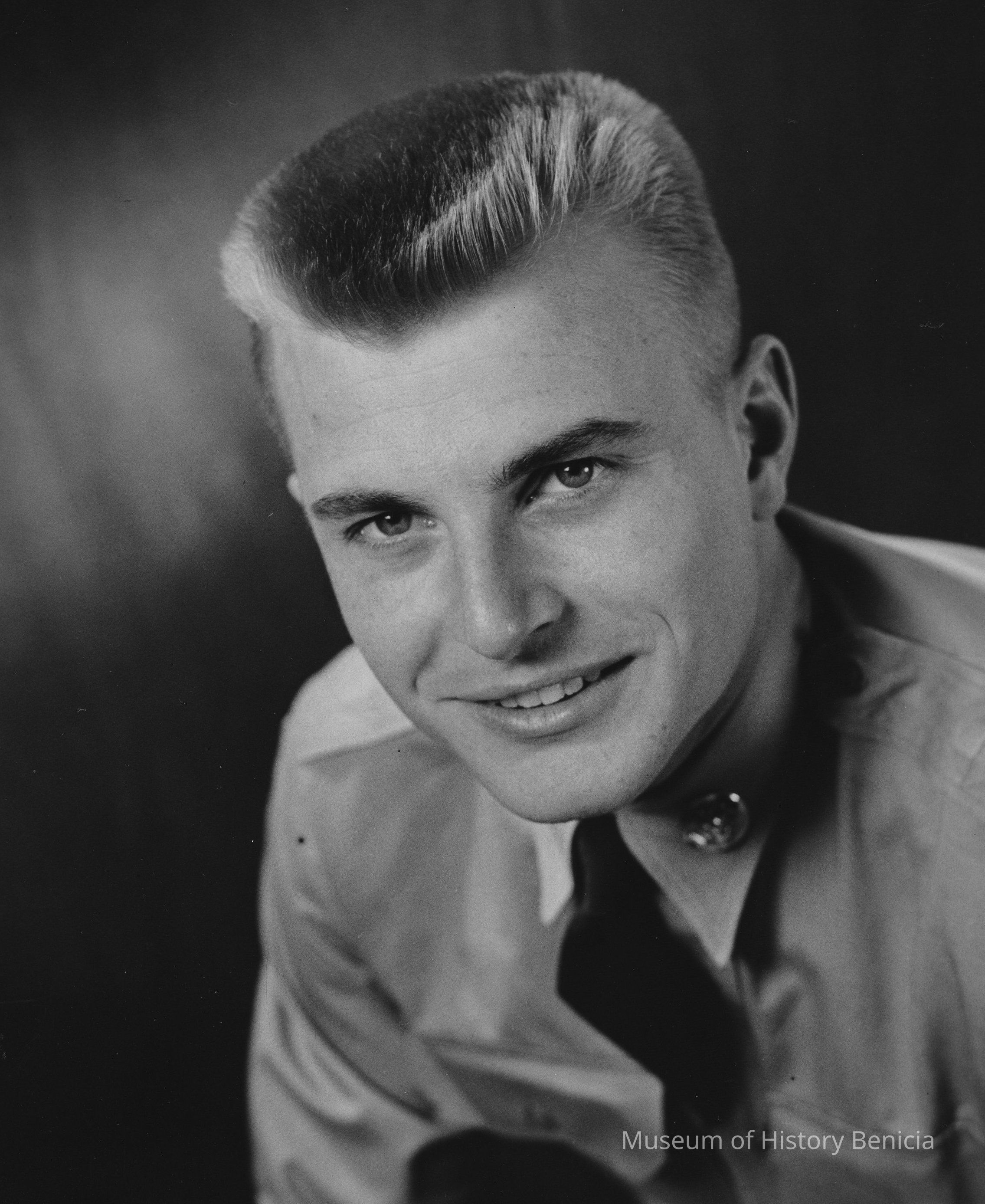 B/W photograph: 3/4 bust view of young man in uniform shirt with light hair. Typed copy glued on back: ".Public information Office, Benicia Arsenal, 26 Oct 1954, with pic, cowell, immediate release. Benicia Arsenal's Technical service Unit 9307, comprised entirely of college graduates, received a new member this week with the arrival of Pvt. Edwin J. Stofel, assigned to the arsenal xxx following basic training at Fort Ord. Pvt Stofel received his master degree in mechanical engineering last June from California Institute of Technology after which he went immediately into the service. He is a resident of Glendale, California."Collection