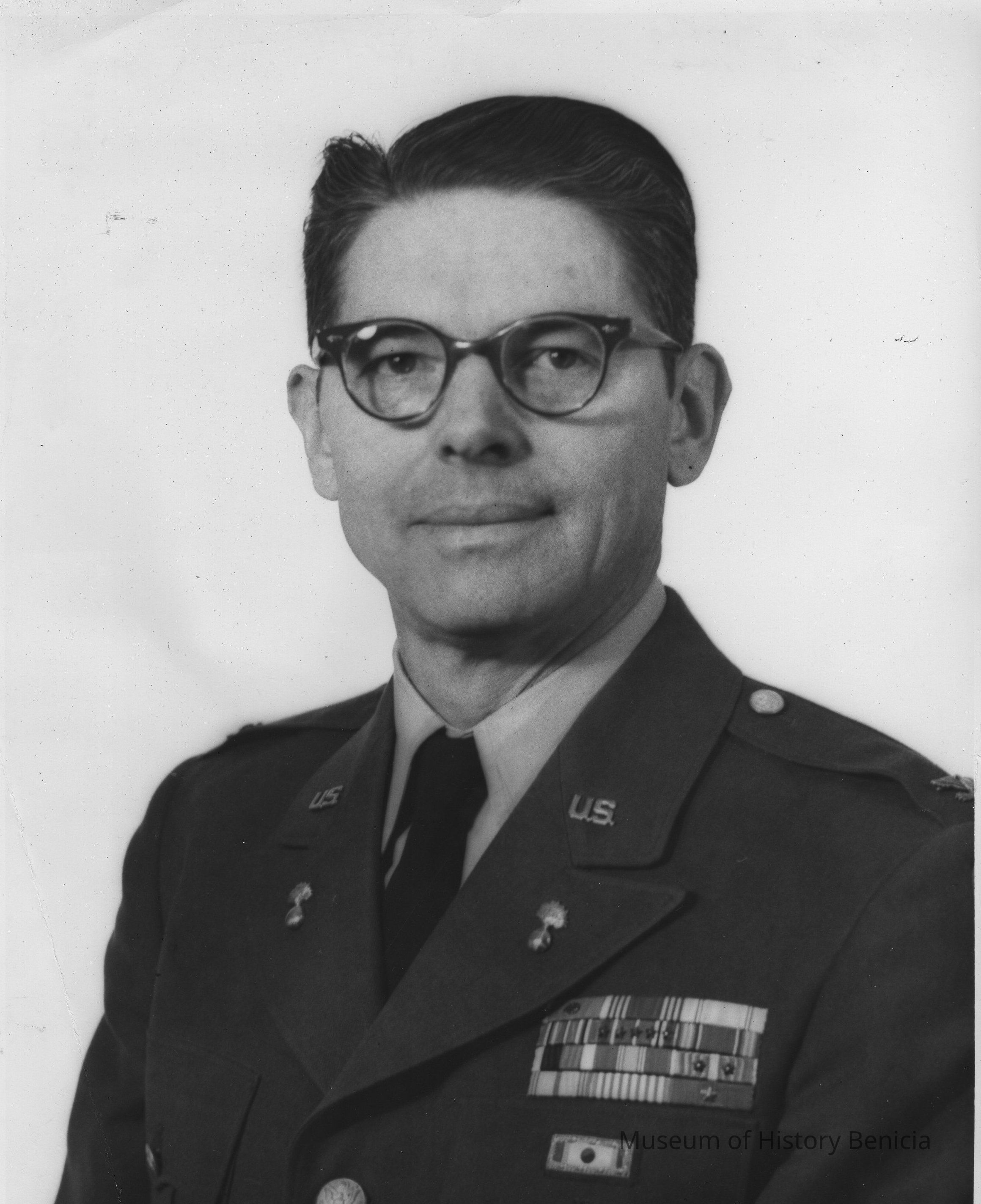 B/W Photograph: front bust view of middle aged man in dark uniform, eyeglasses, dark hair and eyes. This is Col, Wilton Briggs Moats. U.S. Army Photo stamp on back and "04071-04-15 / ORD-58" and "Col. Moats" in ink.Collection