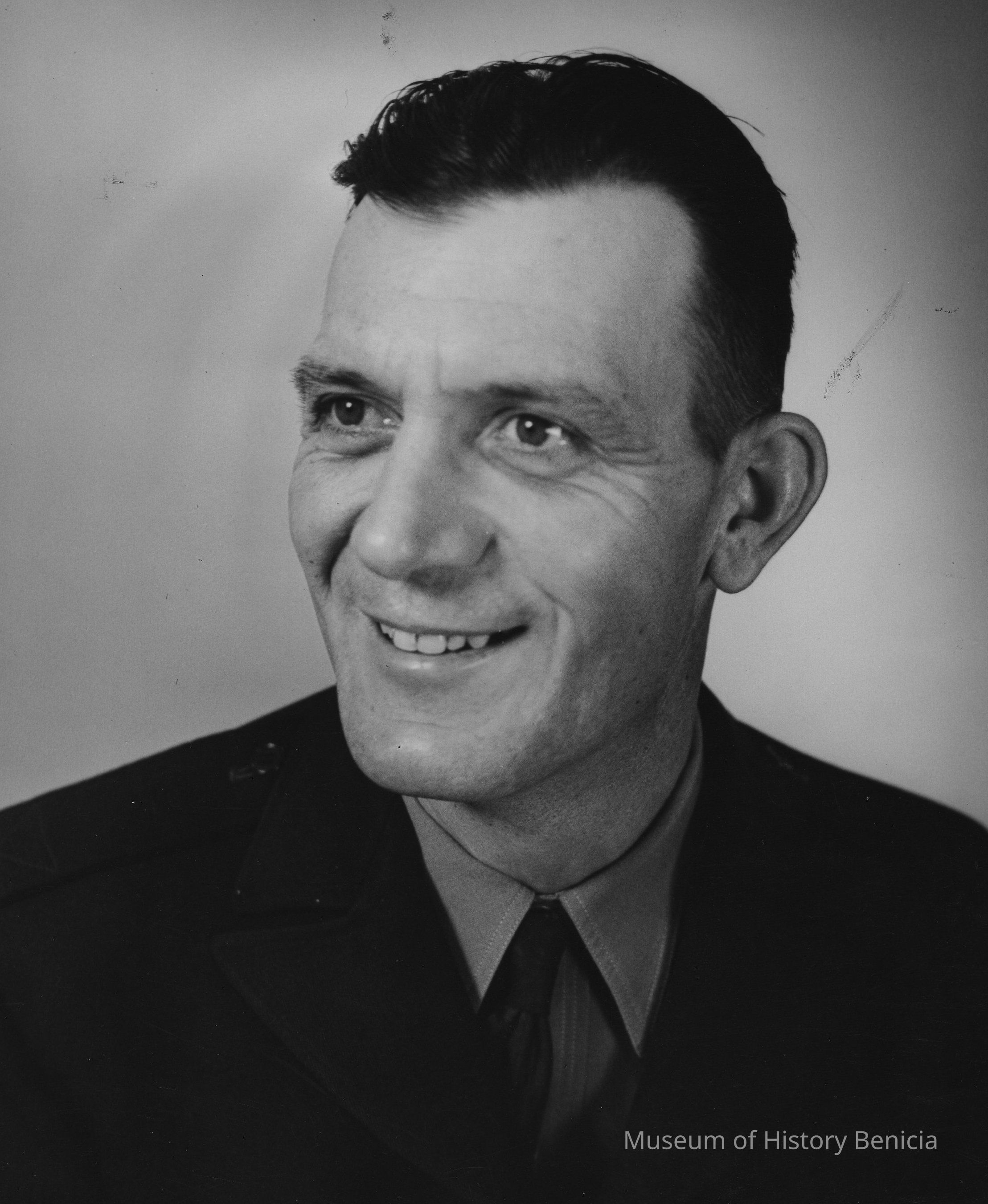 B/W Photograph: head shot of smiling, unidentified middle aged man with dark hair, wearing dark coat and tie. U.S. Army photo stamp on back.Collection