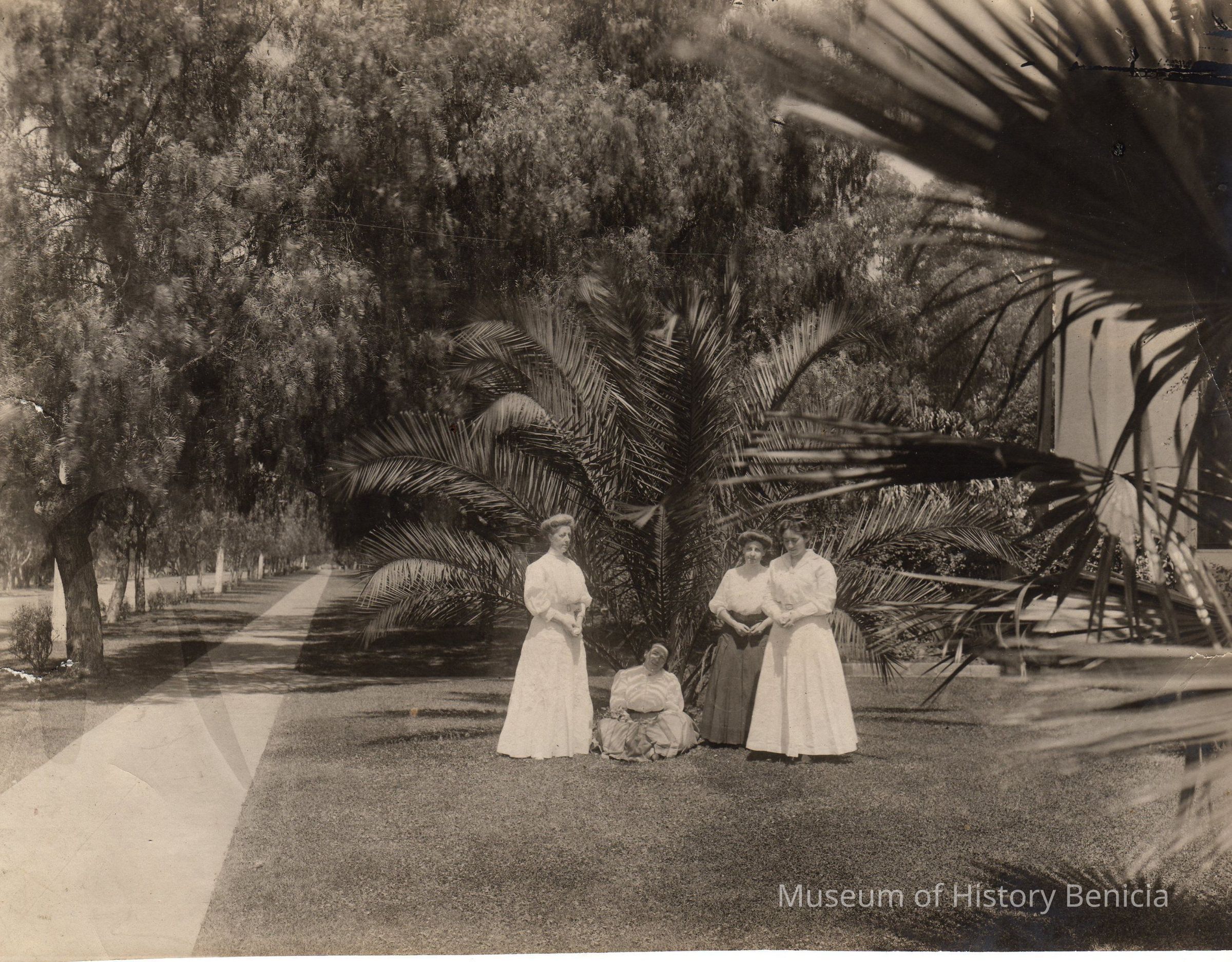 B/W photograph four unidentified women pose in front of Lieutenants' Quarters .