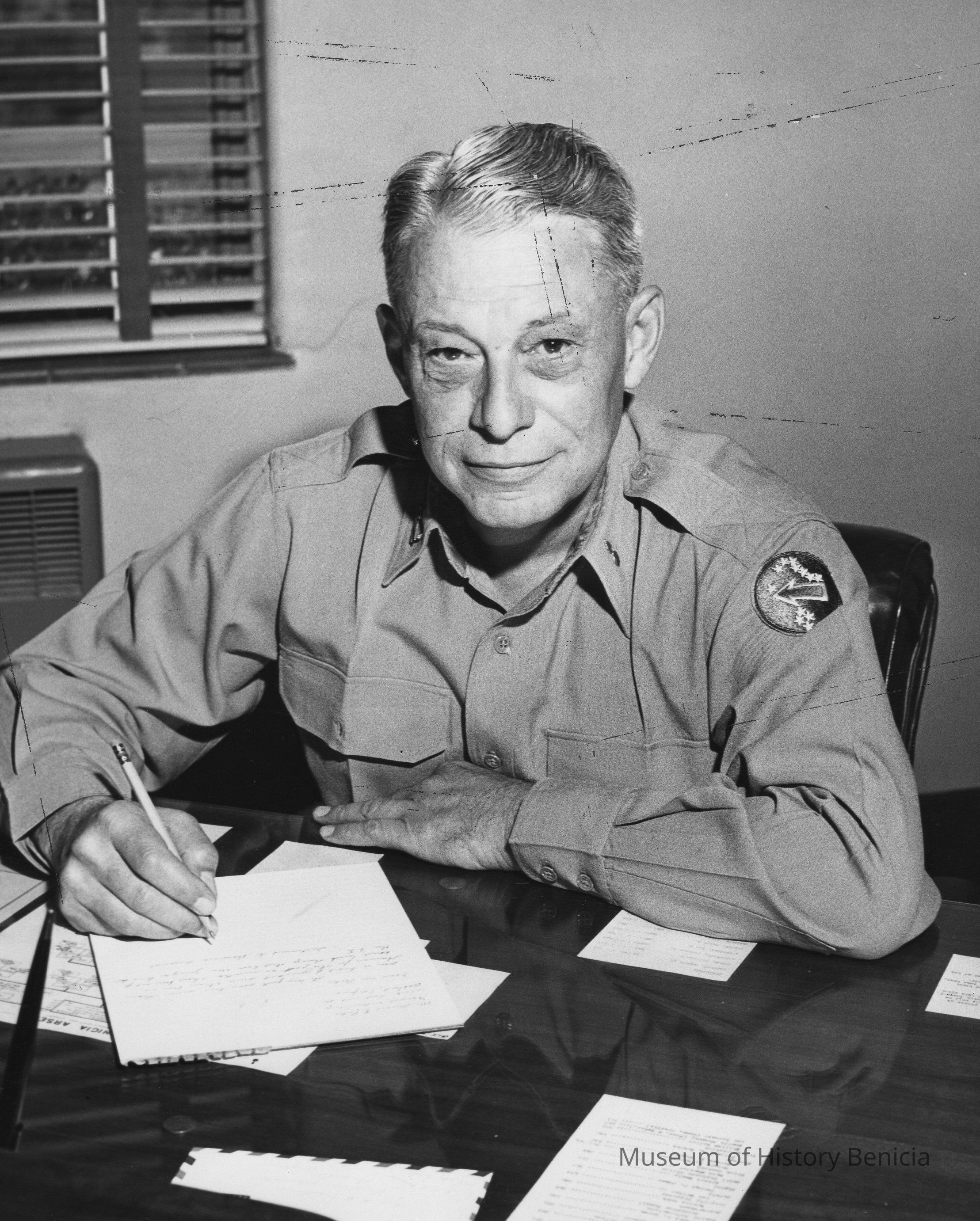 B/W photograph: an unidentified, gray-haired, older man seated at desk in office. On back: U.S. Army photo stamp and "04071-615-1/ORD-56".