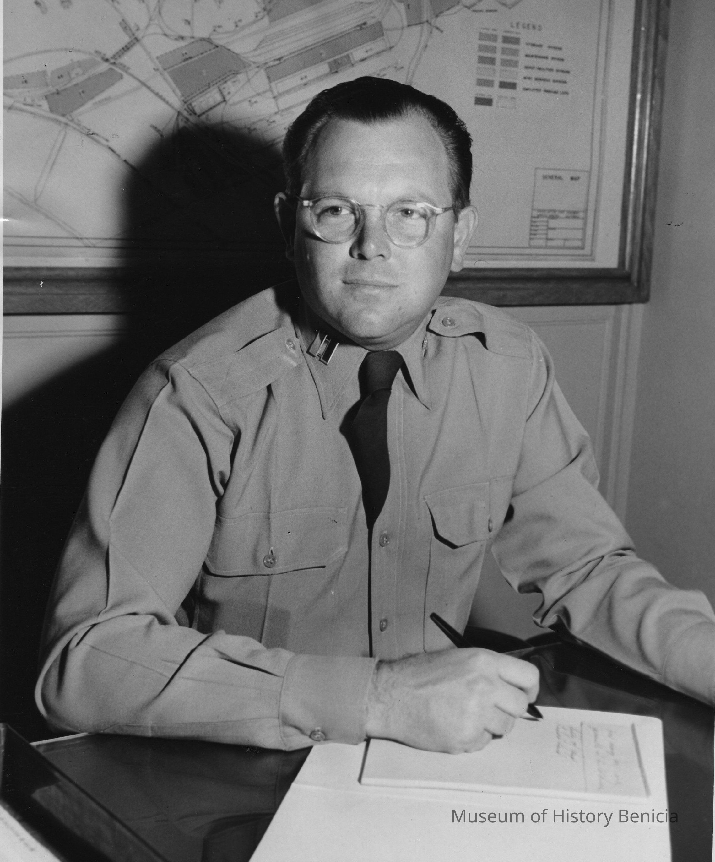 B/W Photograph: an unidentified, dark-haired man in glasses and army uniform, sitting at table with tablet and pen, map behind. U.S. Army photo stamp on back.