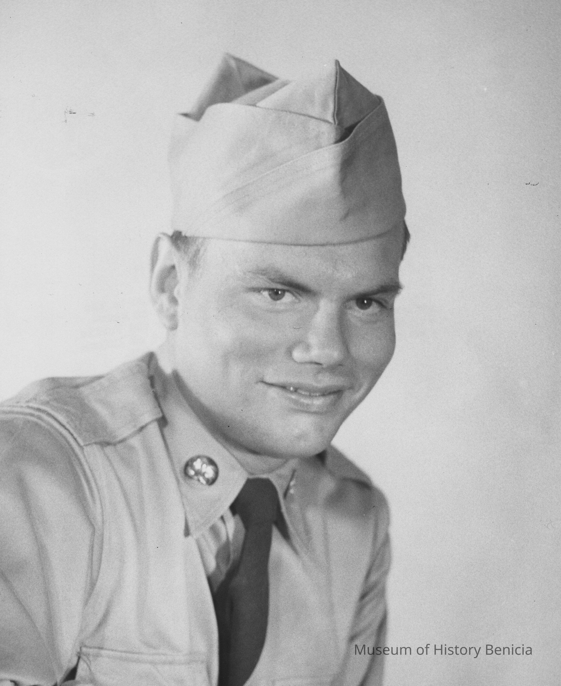 B/W Photograph: head and shoulders shot of an unidentified, young man in army uniform and cap. U.S. Army photo stamp on back.