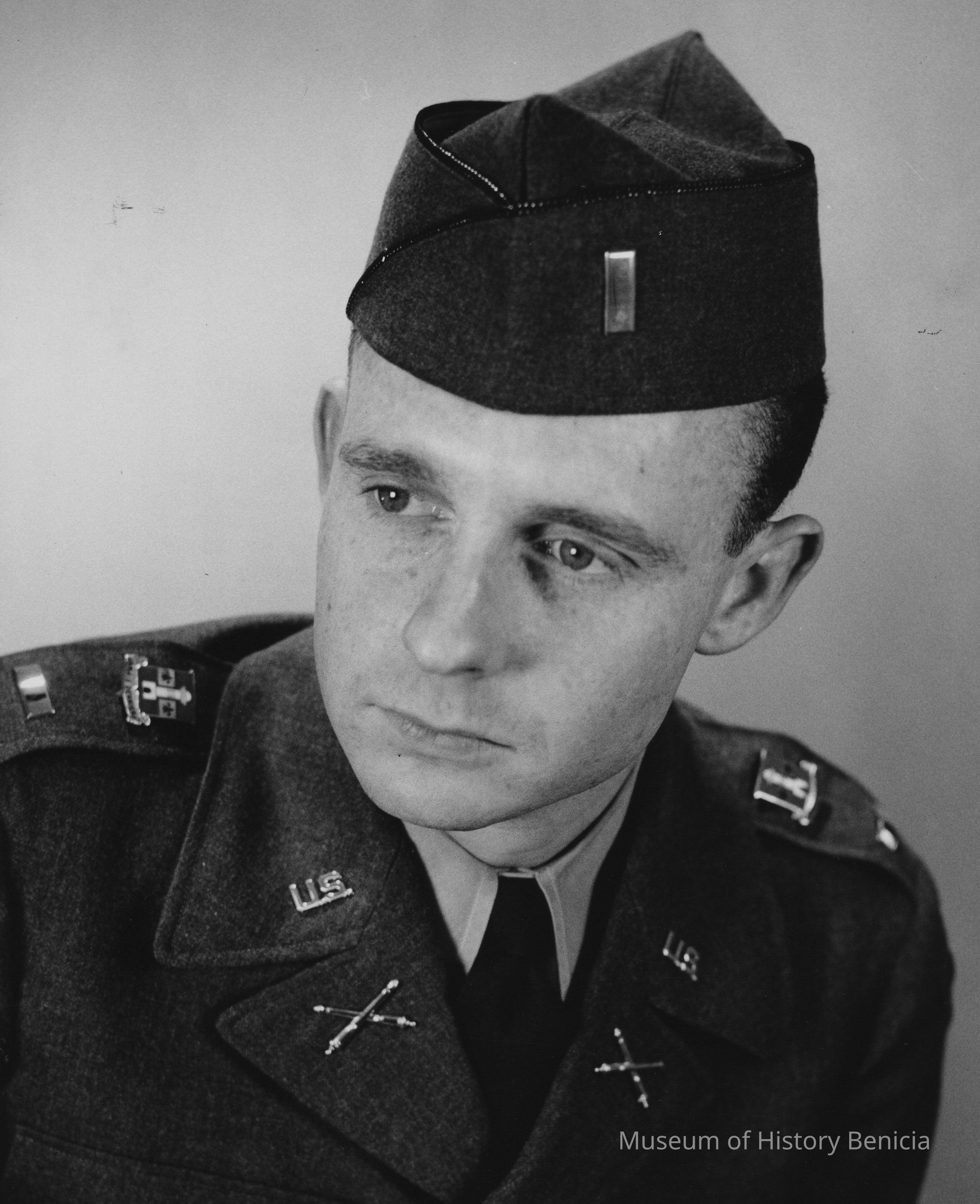 B/W Photograph: head and shoulders shot of an unidentified man in army uniform and cap. U.S. Army photo stamp on back.