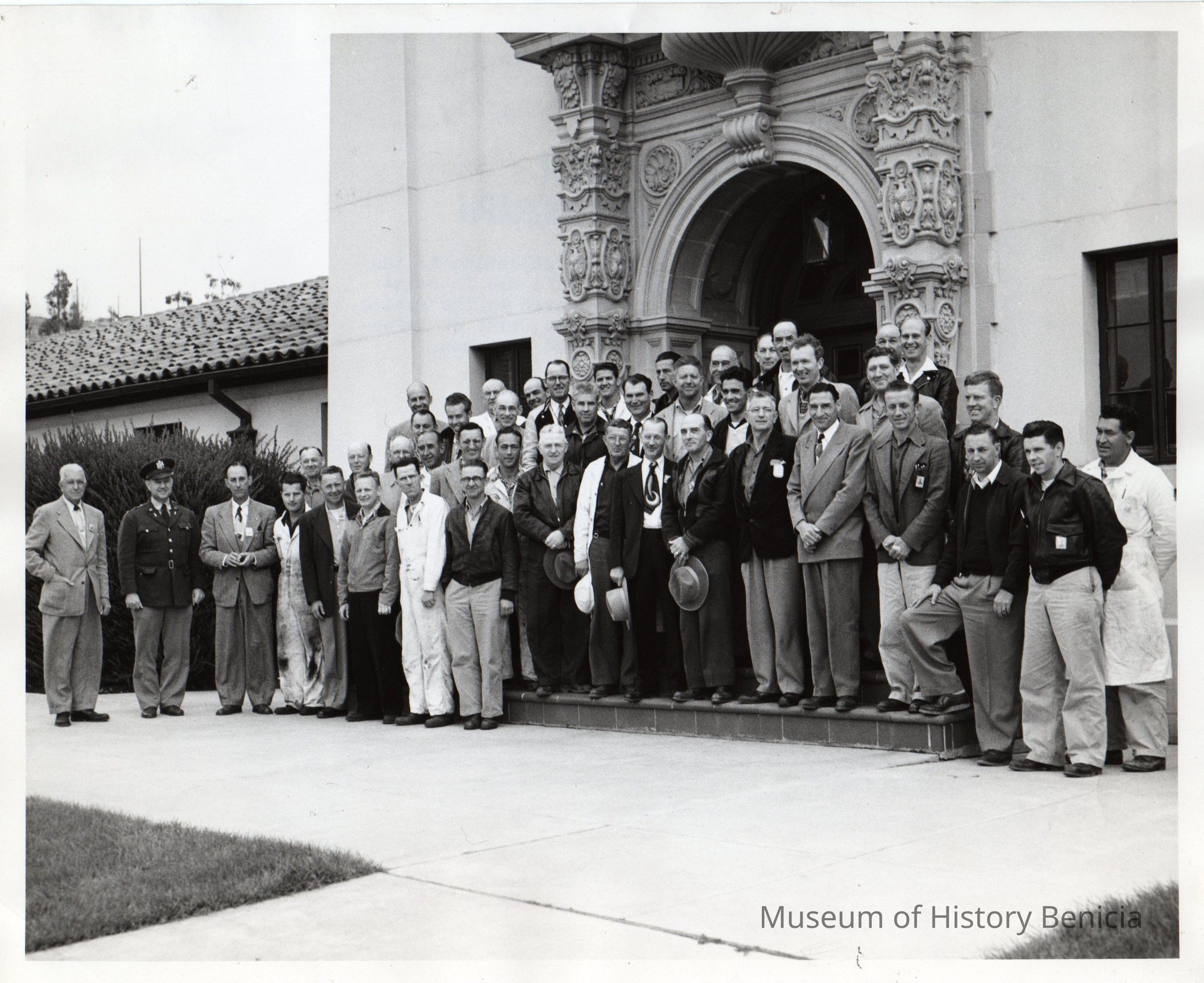 B/W Photograph: large group of employees on steps in front of building with ornate door (Arsenal Administration Building at Military and Adams). One uniformed man at the left. On back: "Inspection Awards" in red pencil; the U.S. Army photo stamp; and "04070-134-1/AM-53".Collection