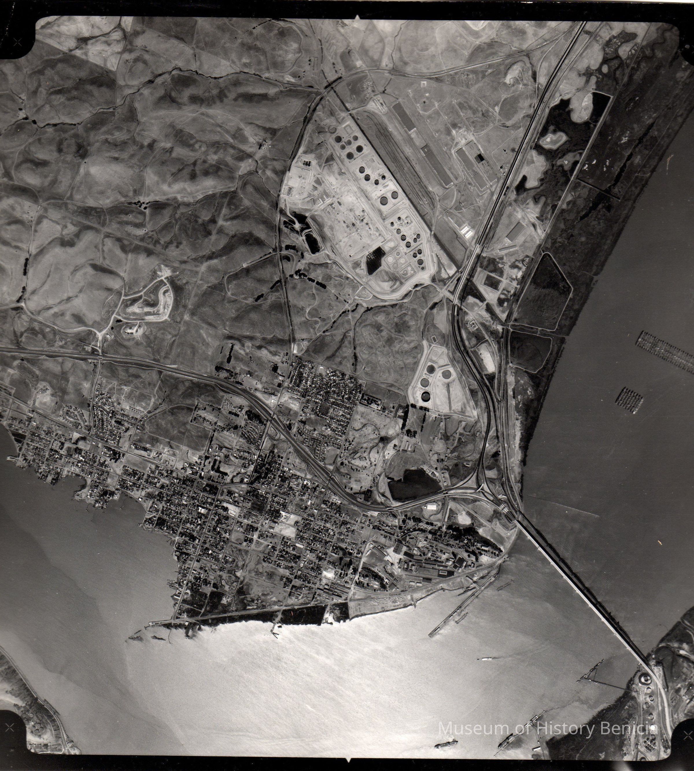 Black and white aerial view of Benicia, Arsenal, bridges, and mothball fleet.