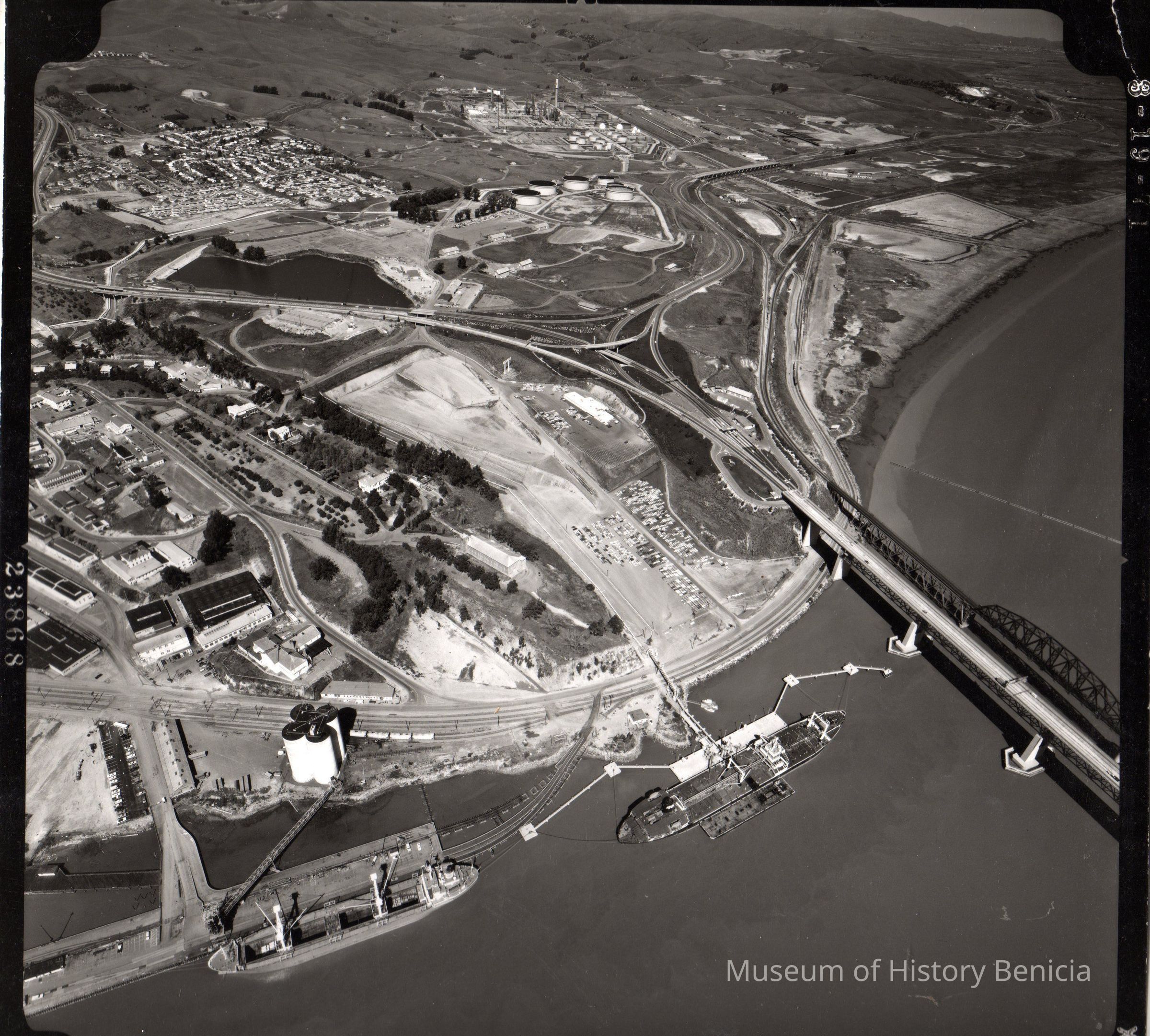 Close-up of ship loading area, Arsenal buildings, Exxon, and Camel Barns. Black and white photo.