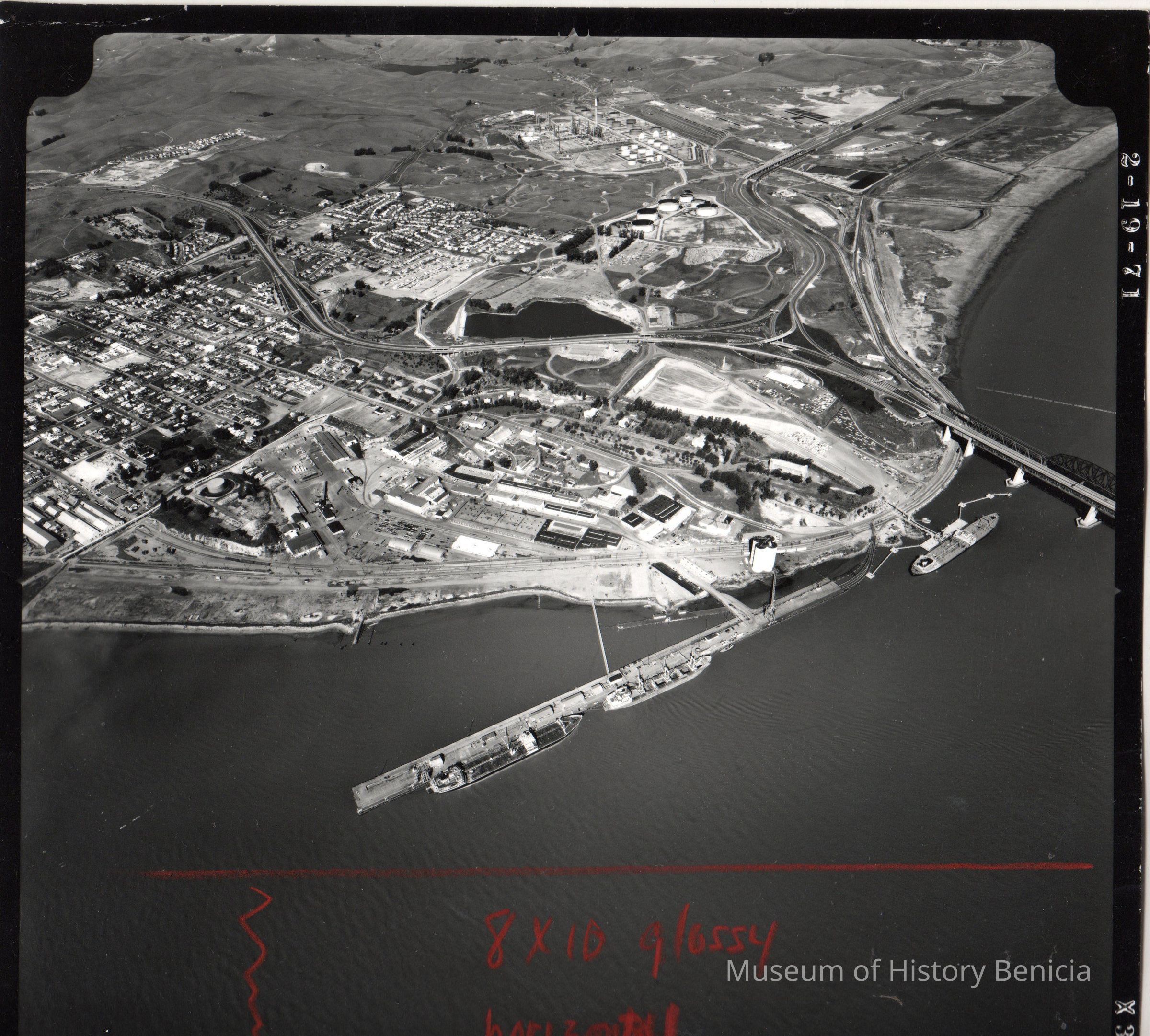B/W aerial photo: Arsenal, dock area, and Mothball Fleet, looking north.