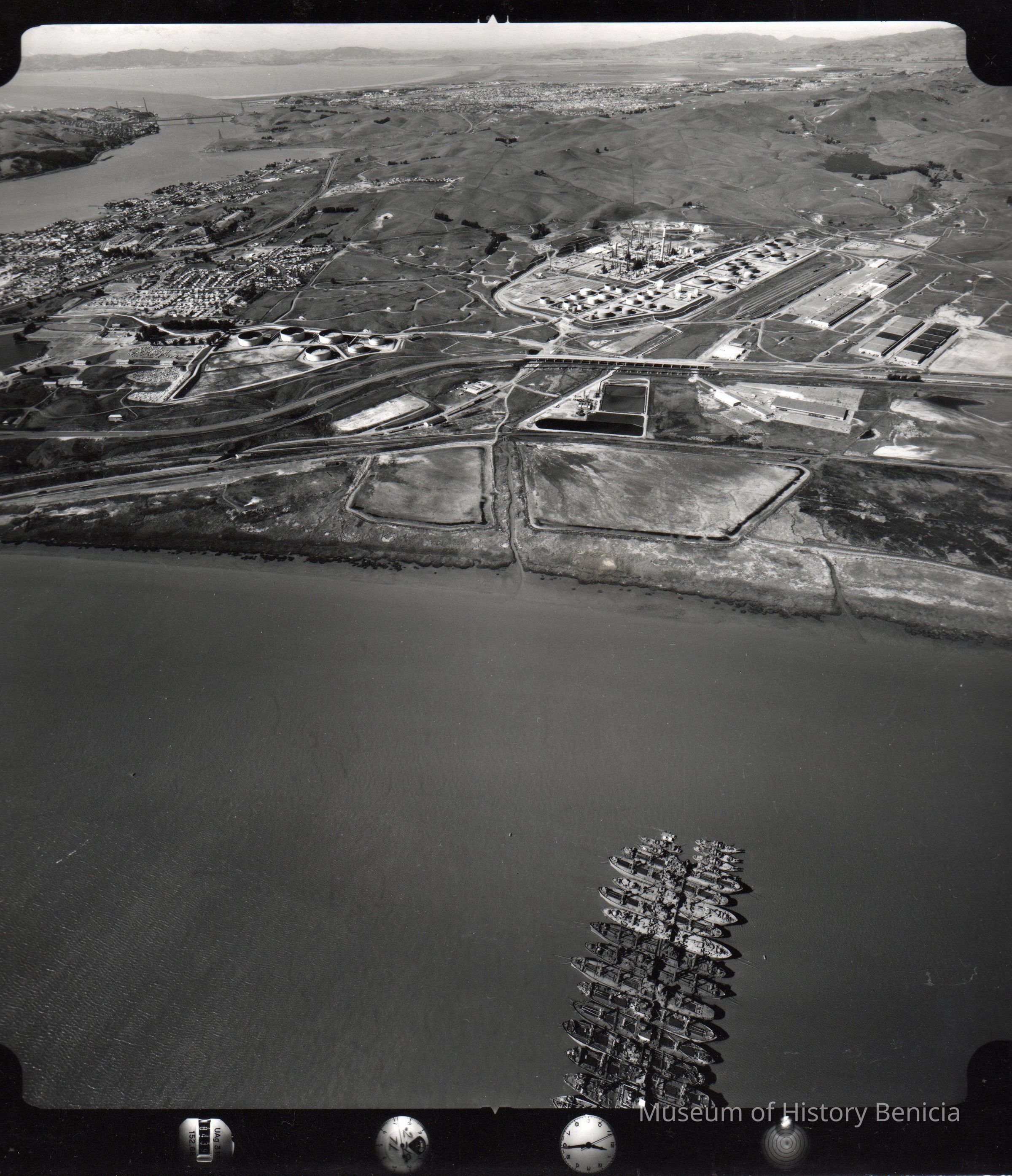 Black and white aerial view showing Mothball Fleet, Benicia, Exxon, Carquinez Bridge, Vallejo and Crockett.