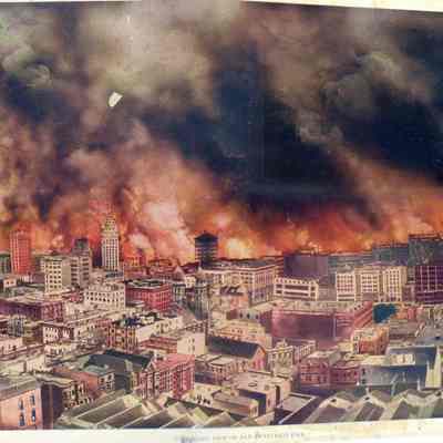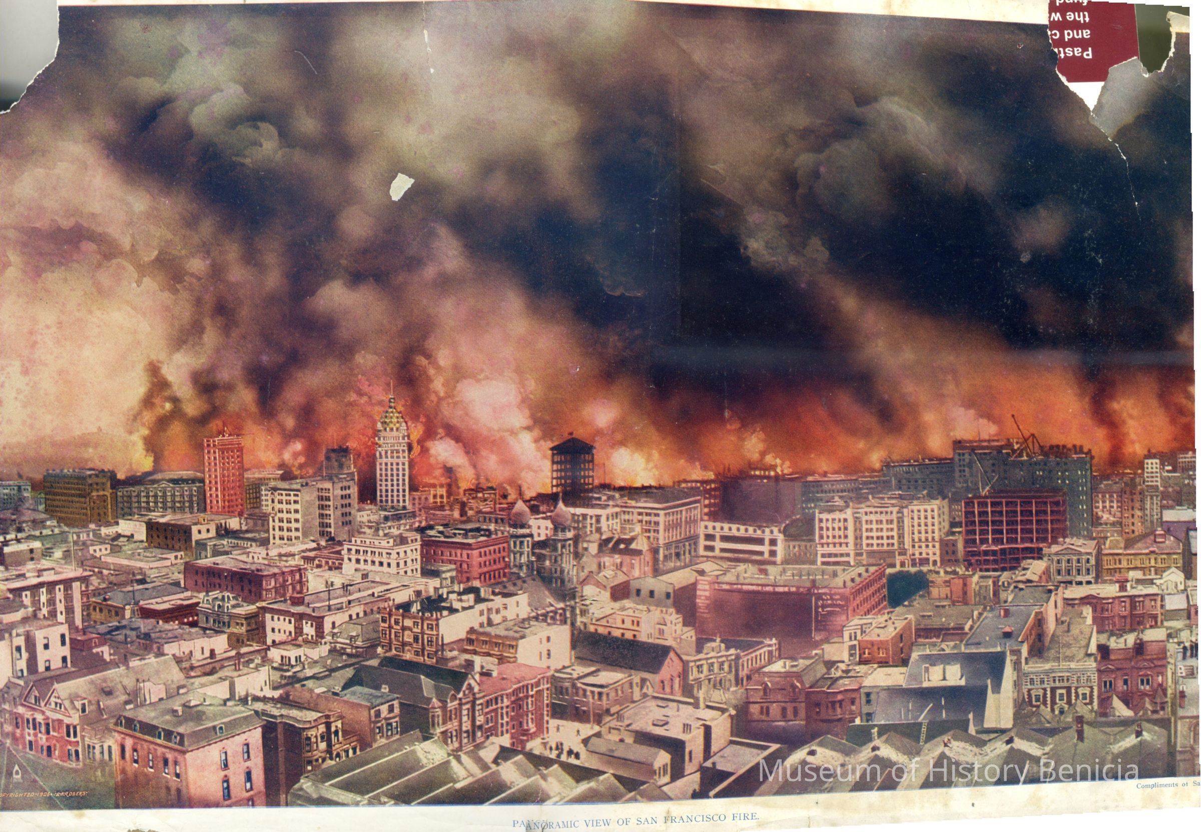 This is from the San Francisco Call in 1906. It shows a colorized version of a photo of San Francisco fires after the 1906 earthquake. The Call building can be seen in the center of the scene. In several places people can be seen on rooftops watching the advancing fire.Collection