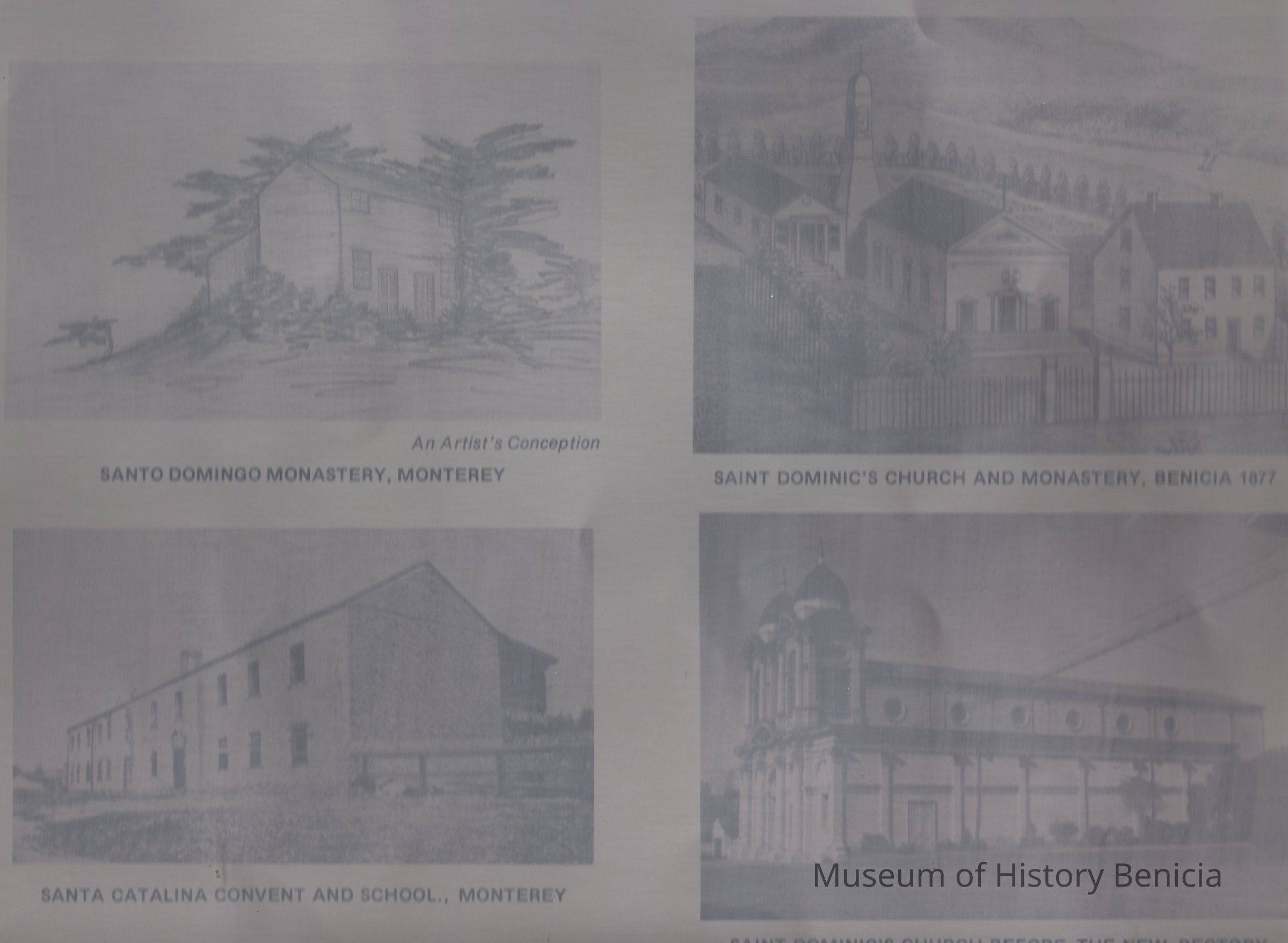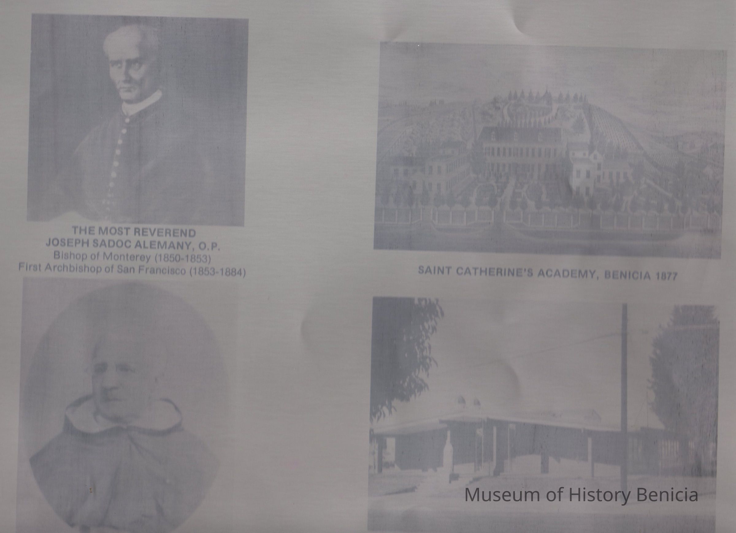 Print proofs on thin metal (four on two sheets) of 8 photos used in the booklet "A Dominican Heritage". The Most Reverent Joseph Sadoc Alemany O.P., The Very Reverent Francis Sadoc Vilarrasa, O.P., St Catherine's Academy Benicia 1877, St Dominic's School Benicia 1979, Santo Domingo Monastery, Monterey, Santa Catalina Convent and School, Monterey, St Dominic's Church and Monestery Benicia 1877, St Dominic's Church before the new Rectory.Collection