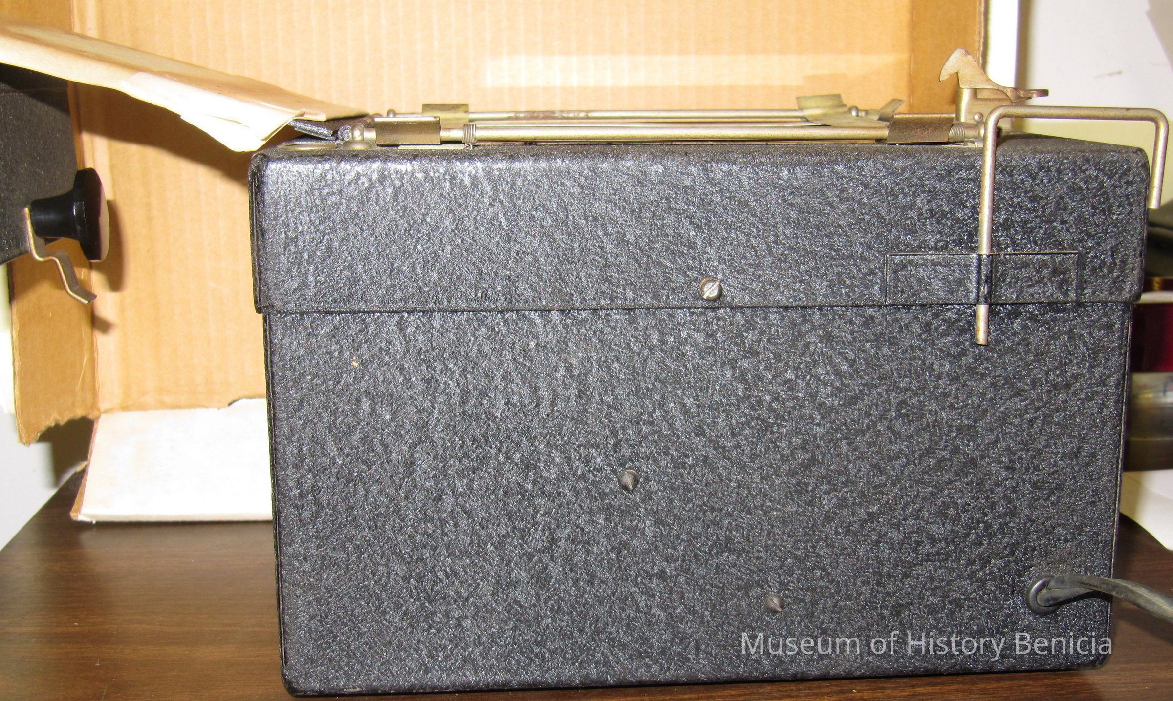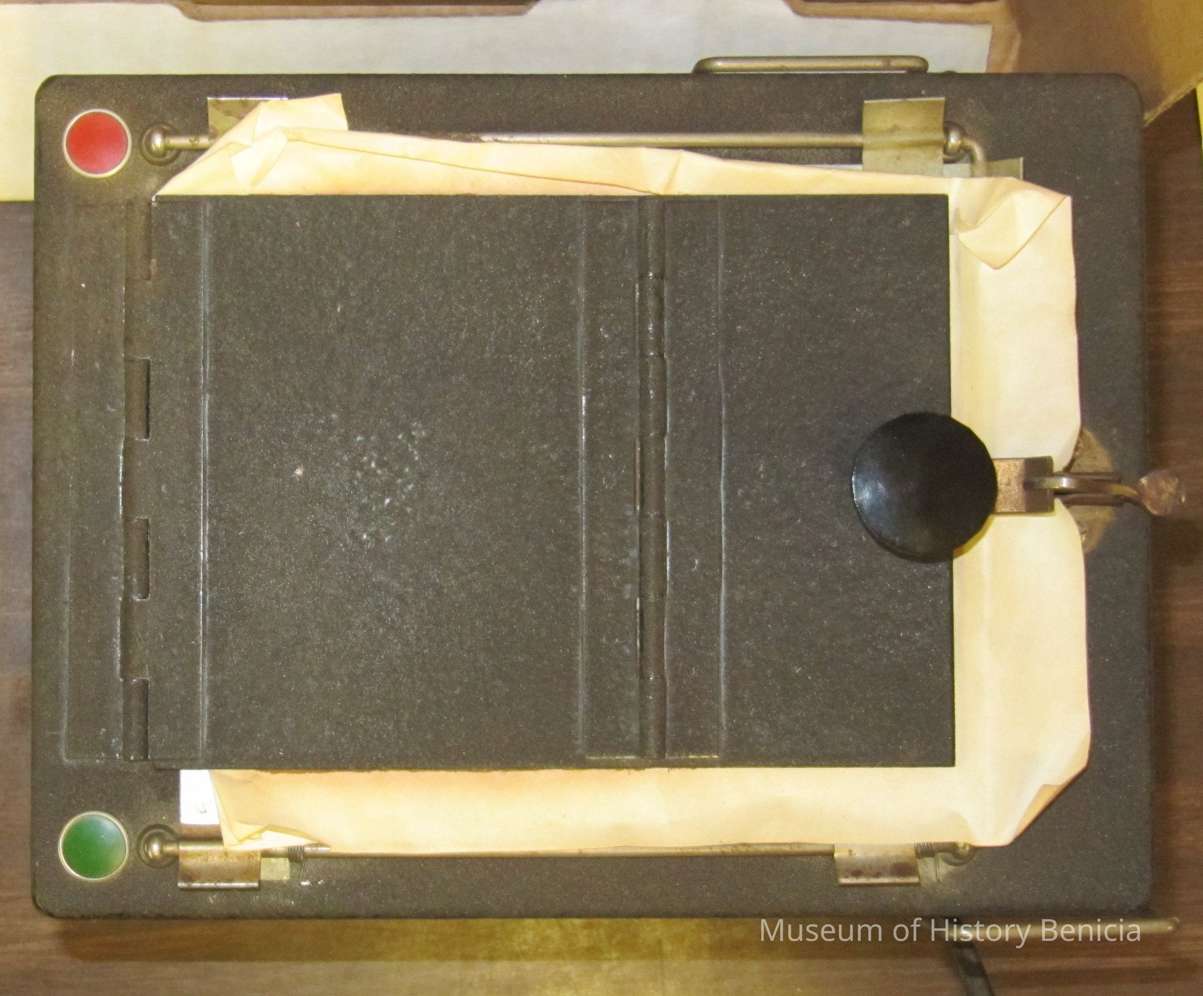 This is a metal box with a lid that opens up to allow placing the negative and printing paper. There is a switch on the side to turn the light on and off. The side says Jackson. It is the Jackson Electrical Equipment Co of Dayton, Ohio. The printing screen is 4" x 4.75".Collection