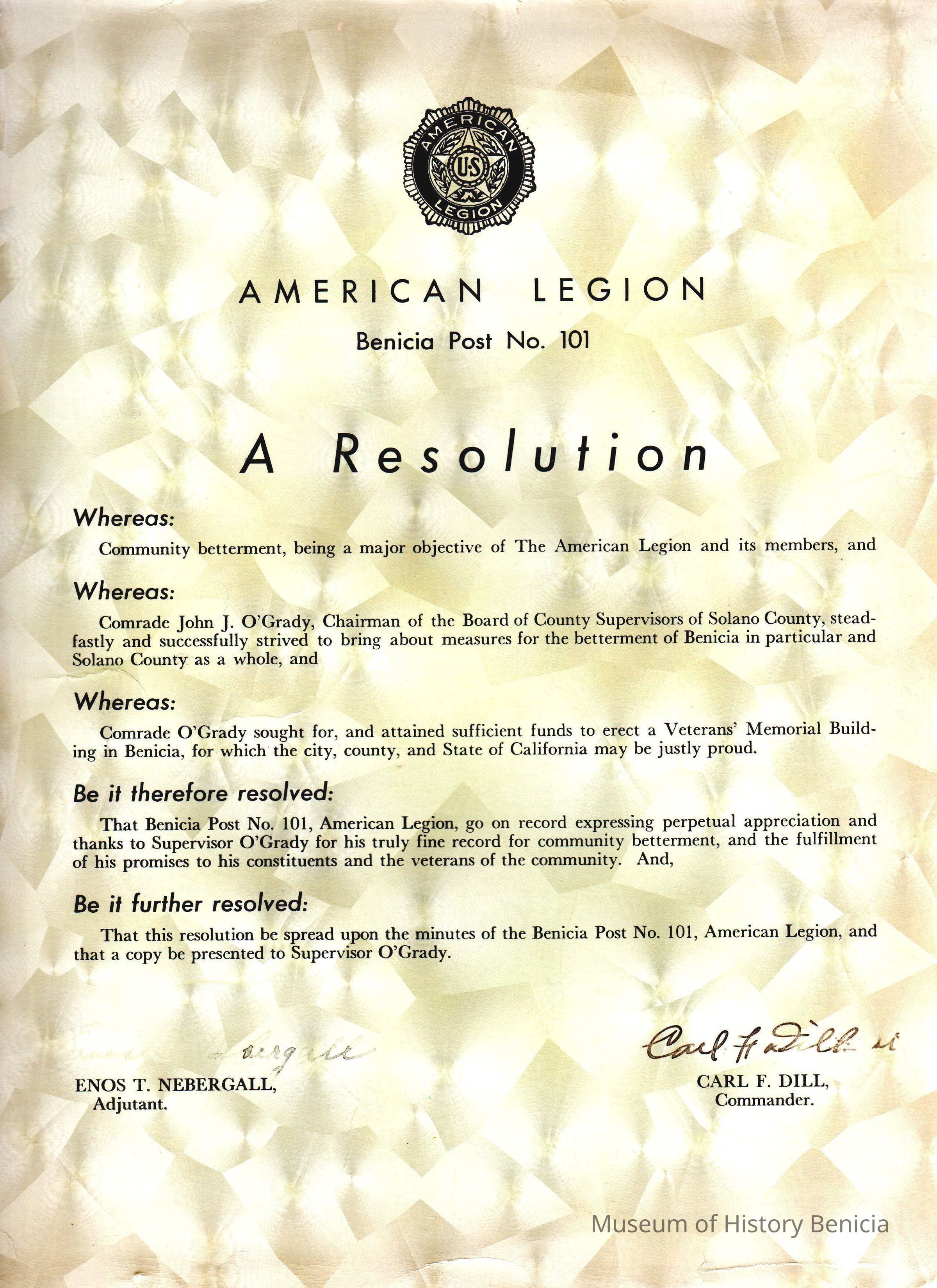 American Legion Resolution thanking John J O'Grady for his contributions to erect a Veteran's Memorial Building in Benicia.