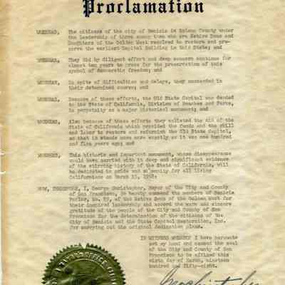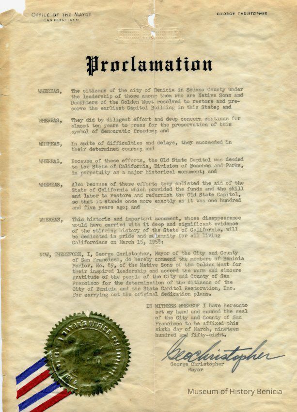 A proclamation from the mayor of San Francisco commending the citizens of Benicia and the Native Sons of the Golden West for restoring the State Capitol. It is signed by George Christopher, Mayor San Francisco. It isn't dated but mentions the celebration to be held on March 15, 1958.