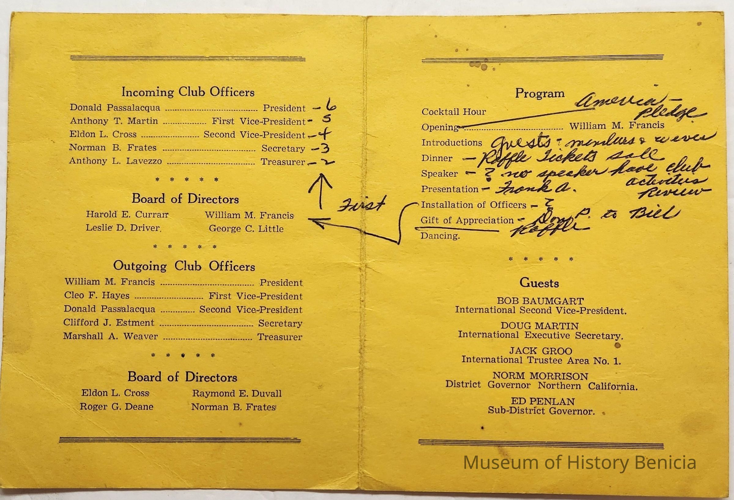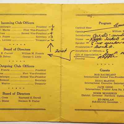Program from Benicia 20-30 Club Installation July 1955; black text on gold paper