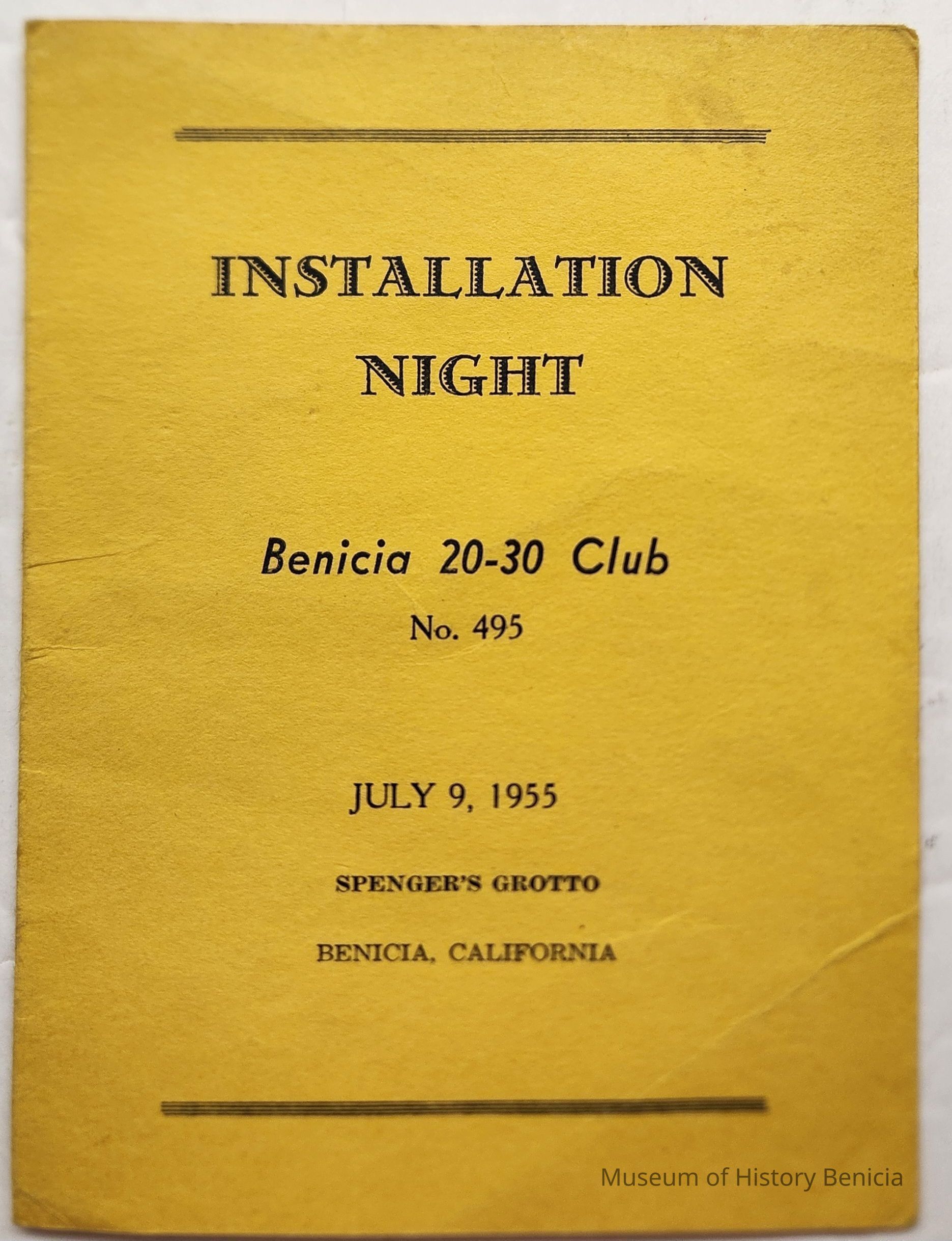 Front Cover: Installation Night / Benicia 20-30 Club No. 495 / July 9, 1955 / Spenger's Grotto / Benicia, California
