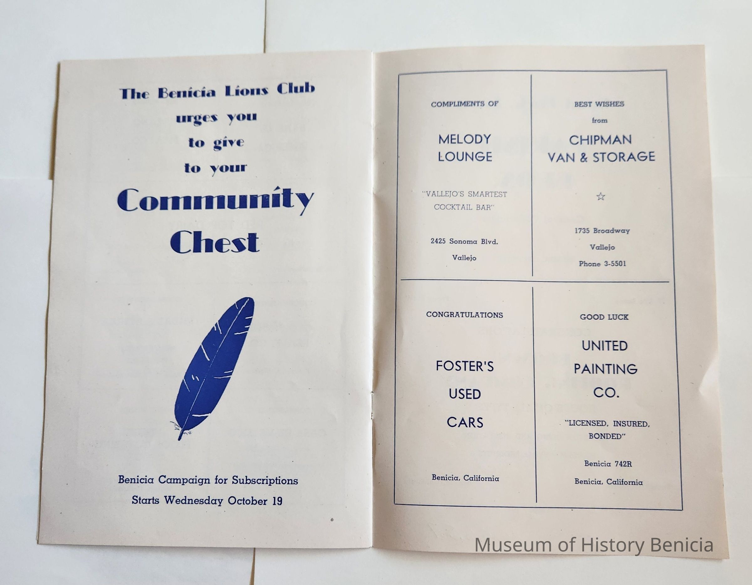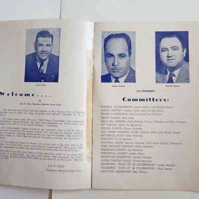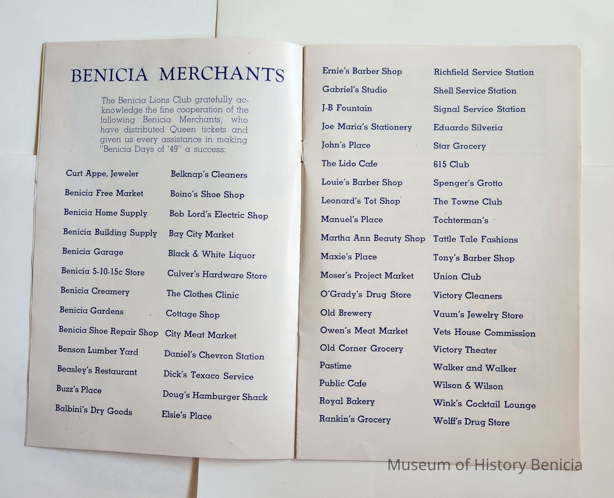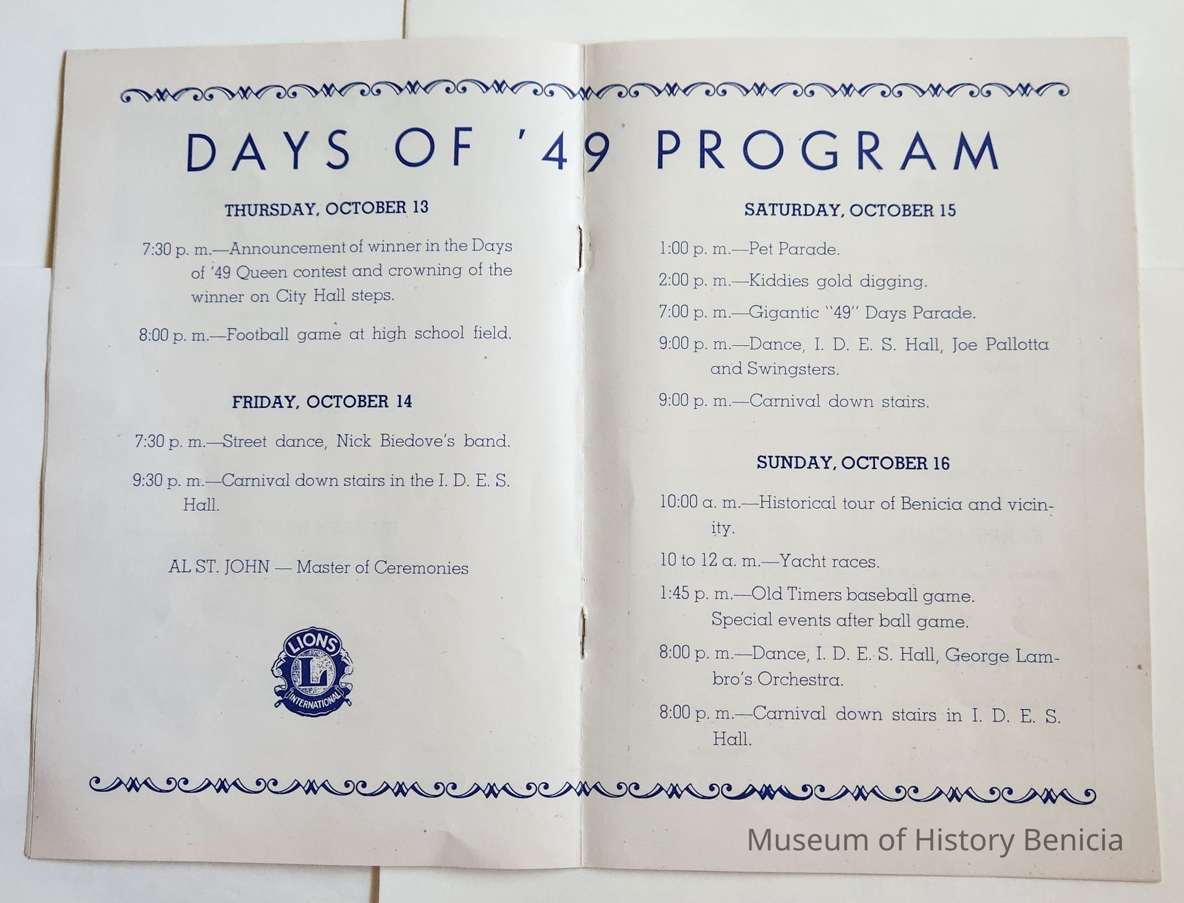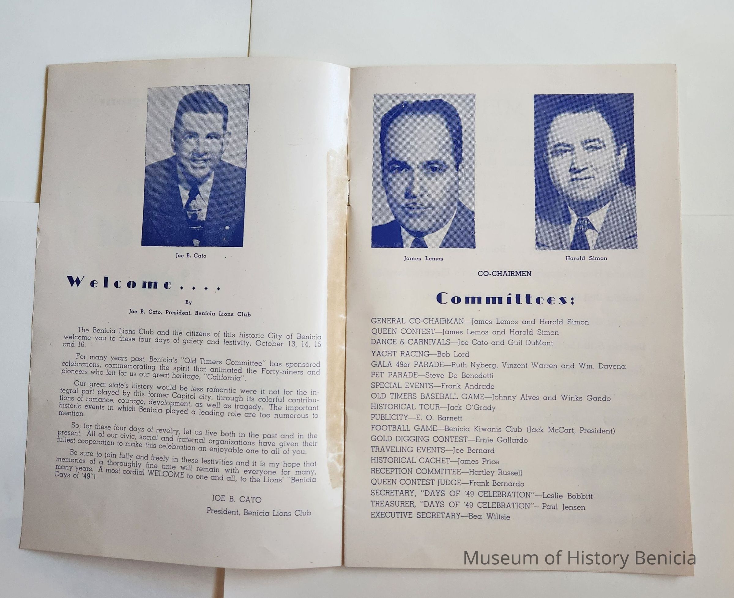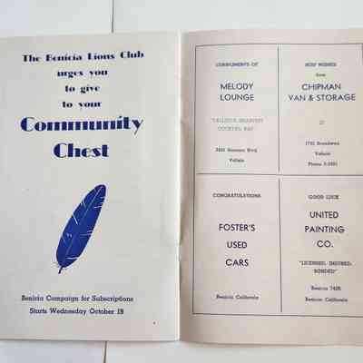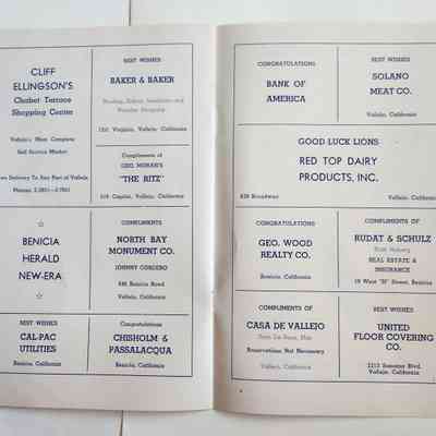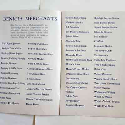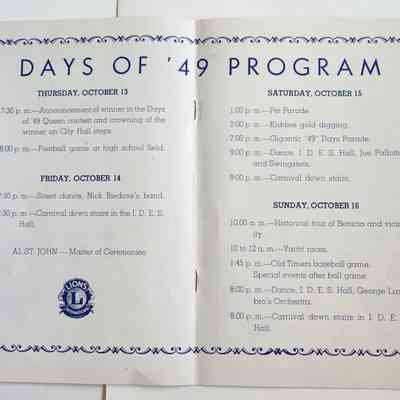 Inside: Welcome from the President of the Lions Club; a list of Committee Chair people; photosof Joe Cato, James Lemos and Harold Simon; list of Benicia Merchants; 7 pages of ads from local businesses; JV football game Thursday at the high school field; complete program for all four days; roster of teams playing baseball on Sunday. 13 pages, blue ink on slick white paper; gold section on front only.Collection