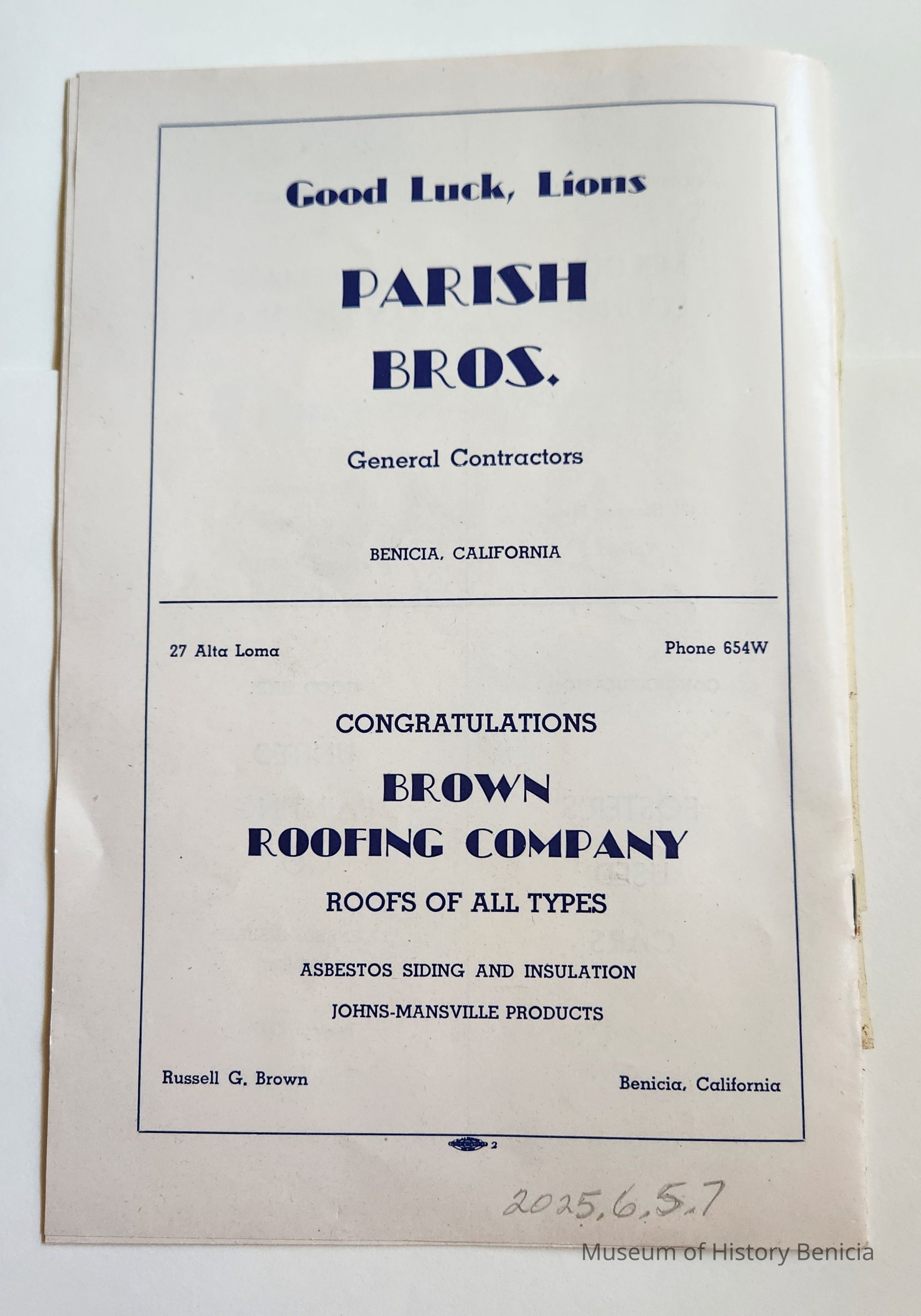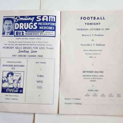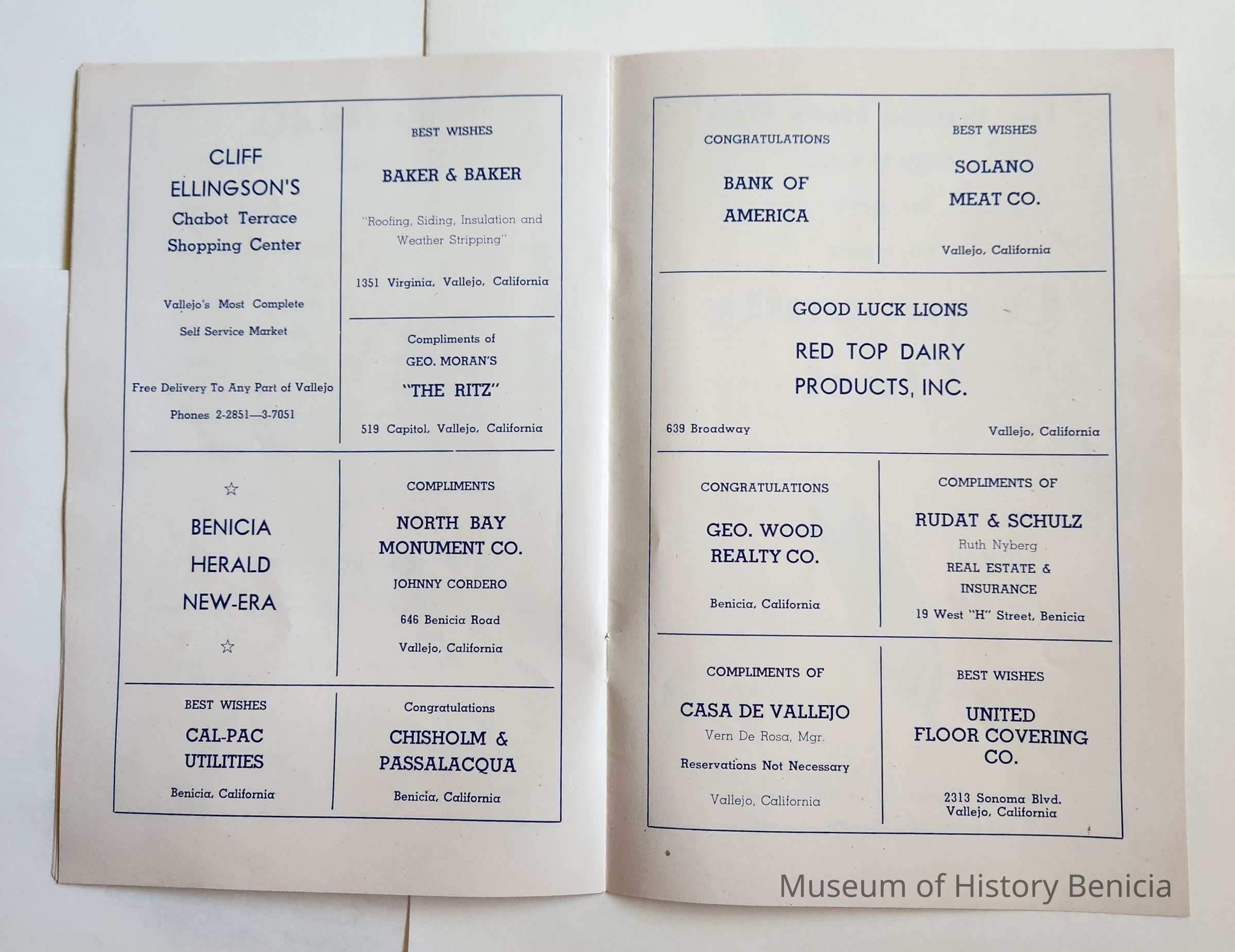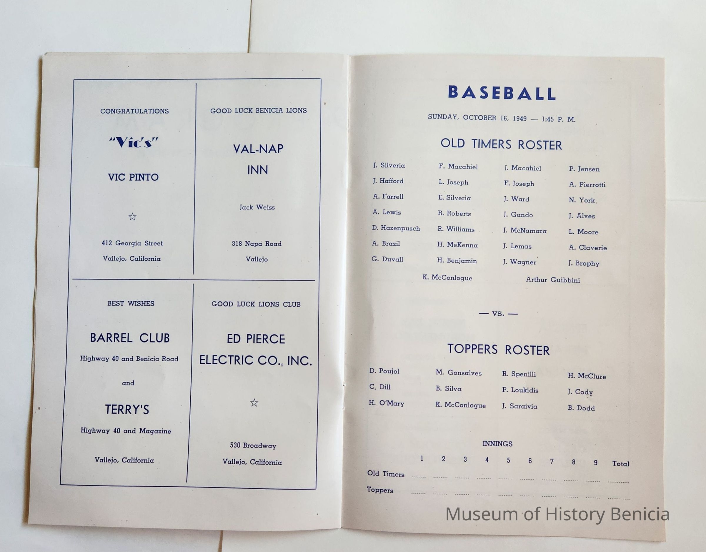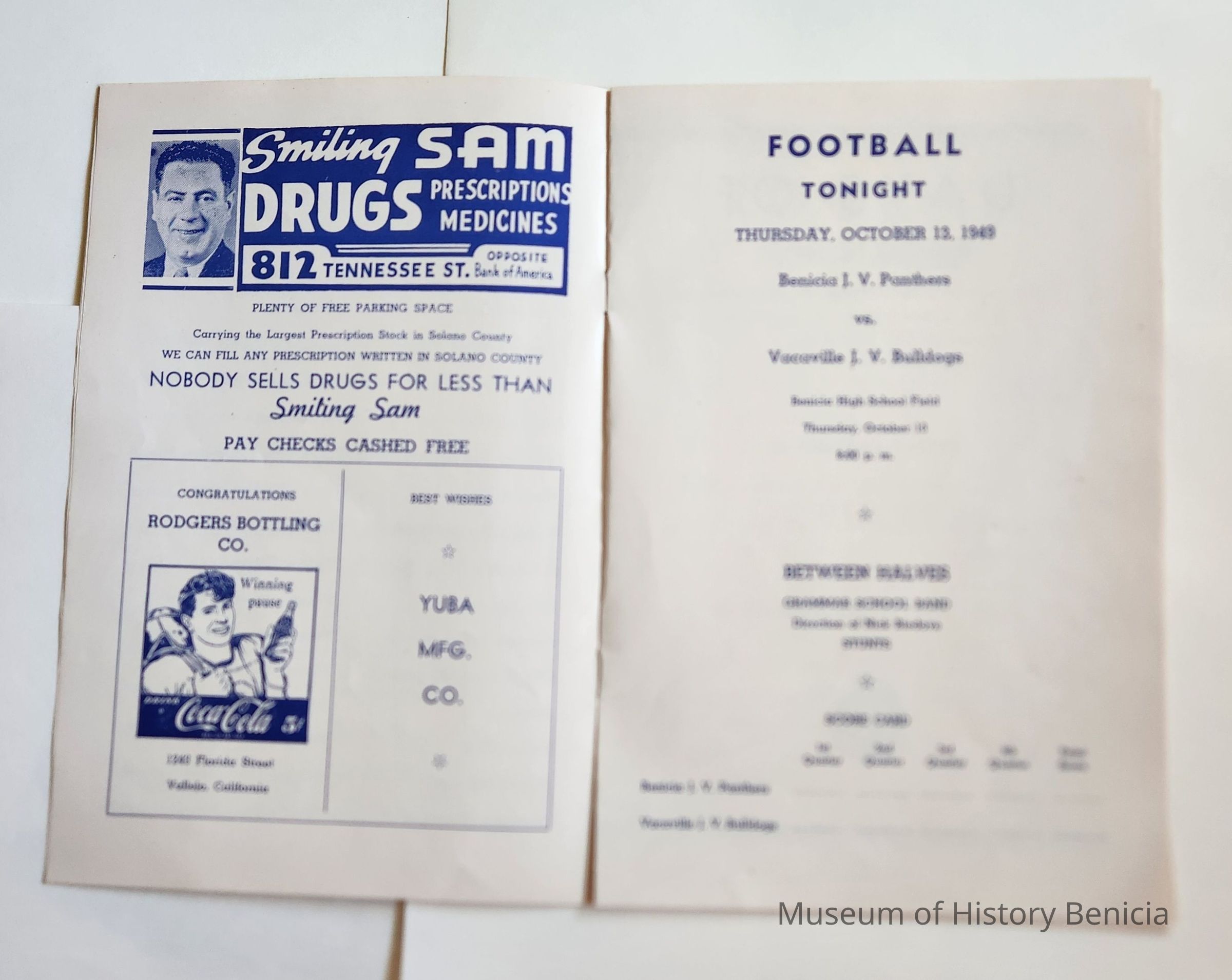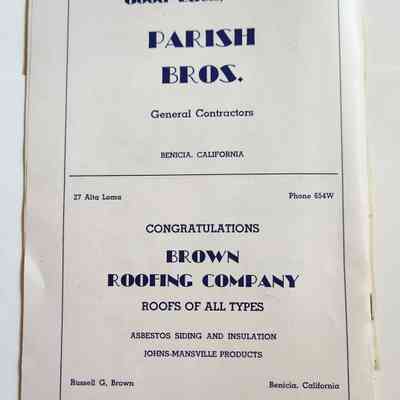 Inside: Welcome from the President of the Lions Club; a list of Committee Chair people; photosof Joe Cato, James Lemos and Harold Simon; list of Benicia Merchants; 7 pages of ads from local businesses; JV football game Thursday at the high school field; complete program for all four days; roster of teams playing baseball on Sunday. 13 pages, blue ink on slick white paper; gold section on front only.Collection