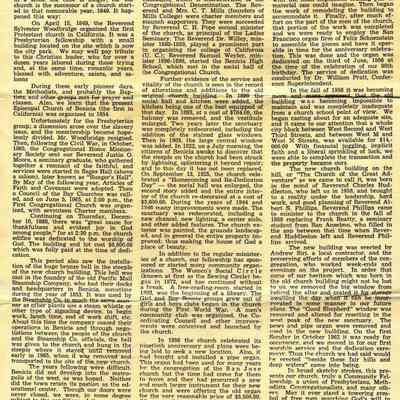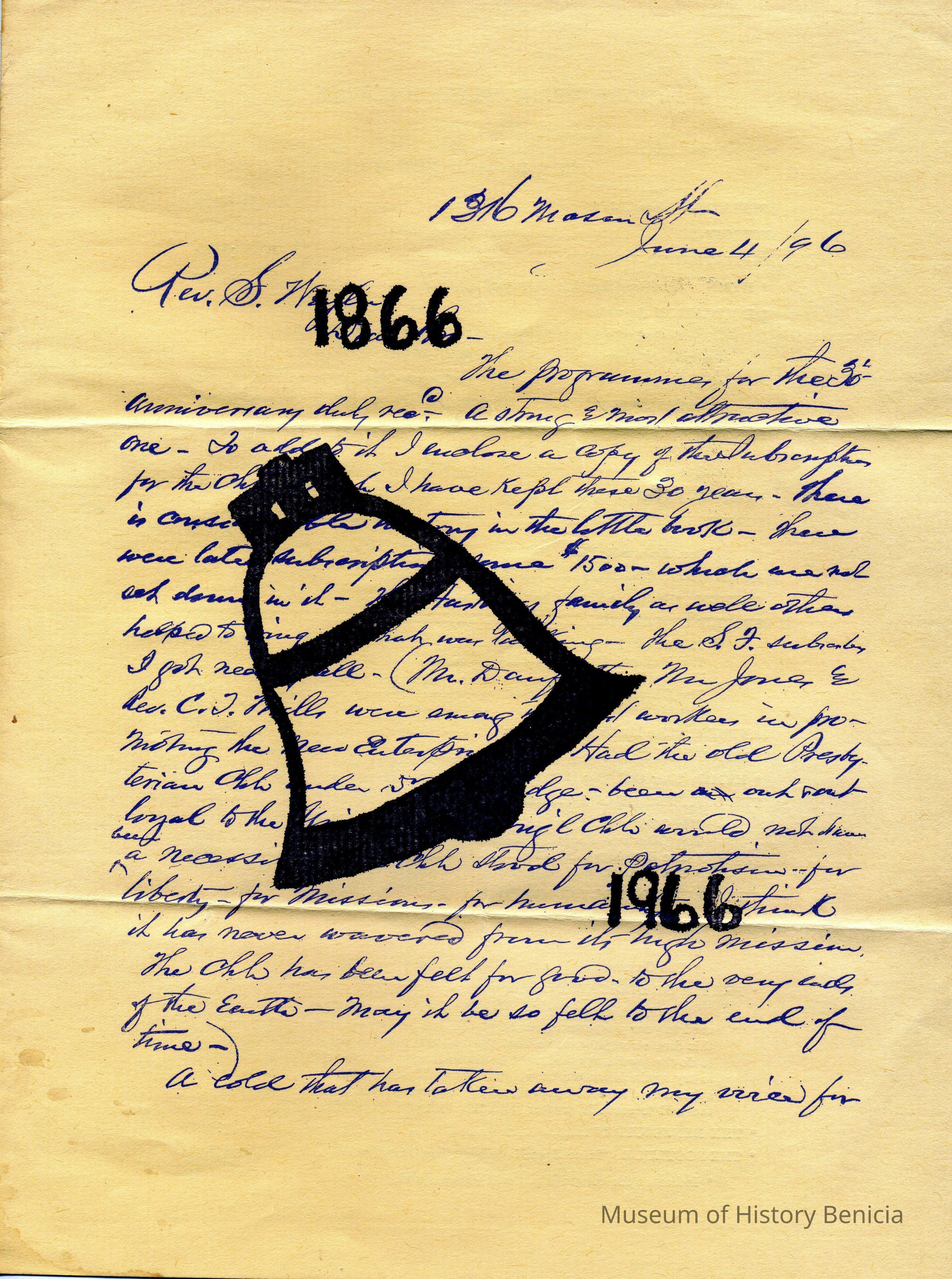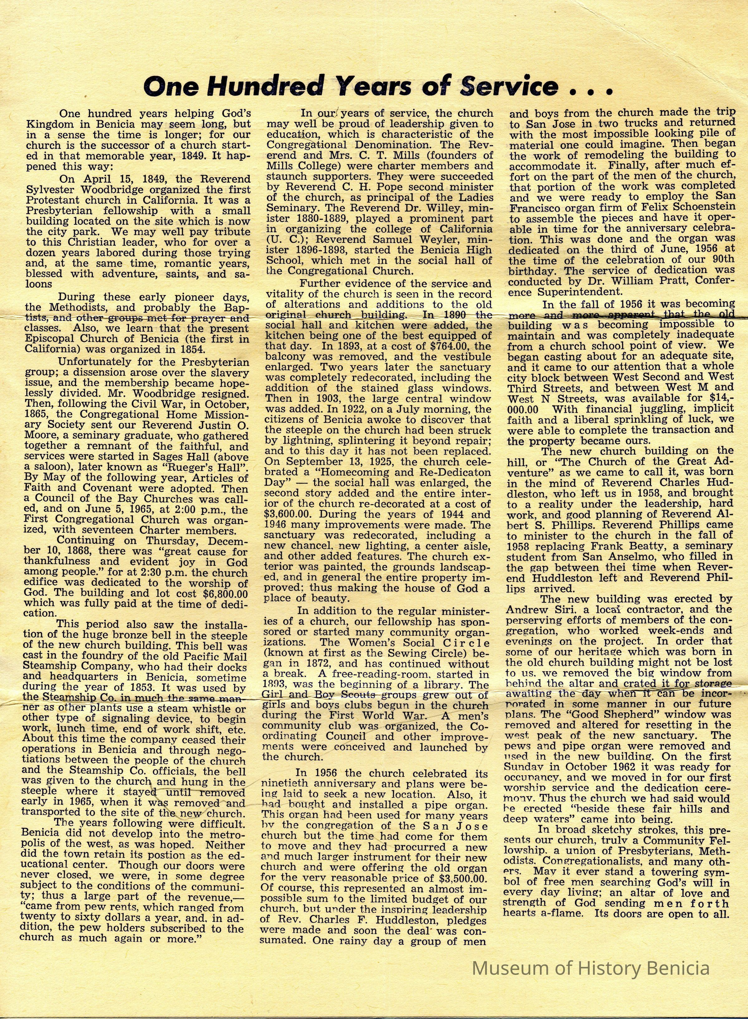 A program for the celebration of the 100th anniversary of the Congregational church in Benicia. The pastor at the time was Phillip H. Oliver. The service included Hymns and prayer services as well as a re-dedication of the bronze bell owned by the chruch that was cast at the foundry of the Pacific Mail Steamship company in Benicia about 1853. The back of the program contains a history of the church and its predecessors.Collection