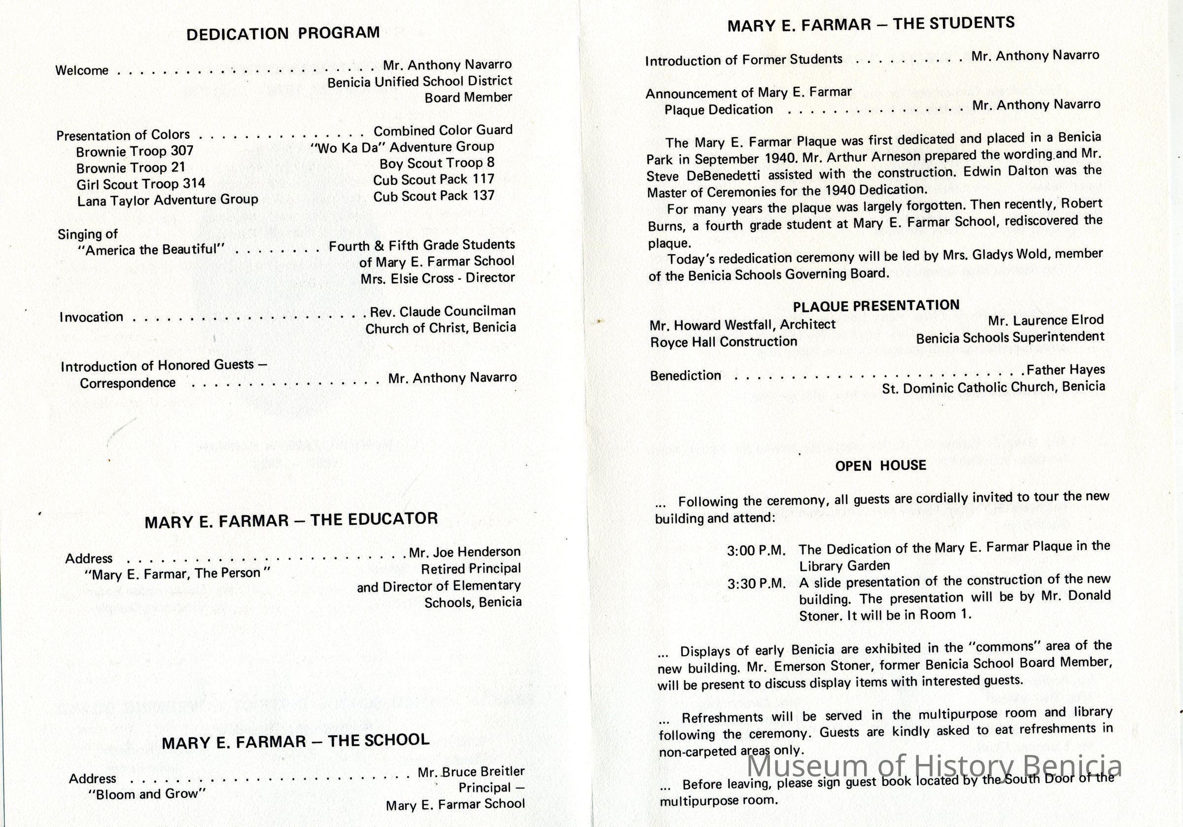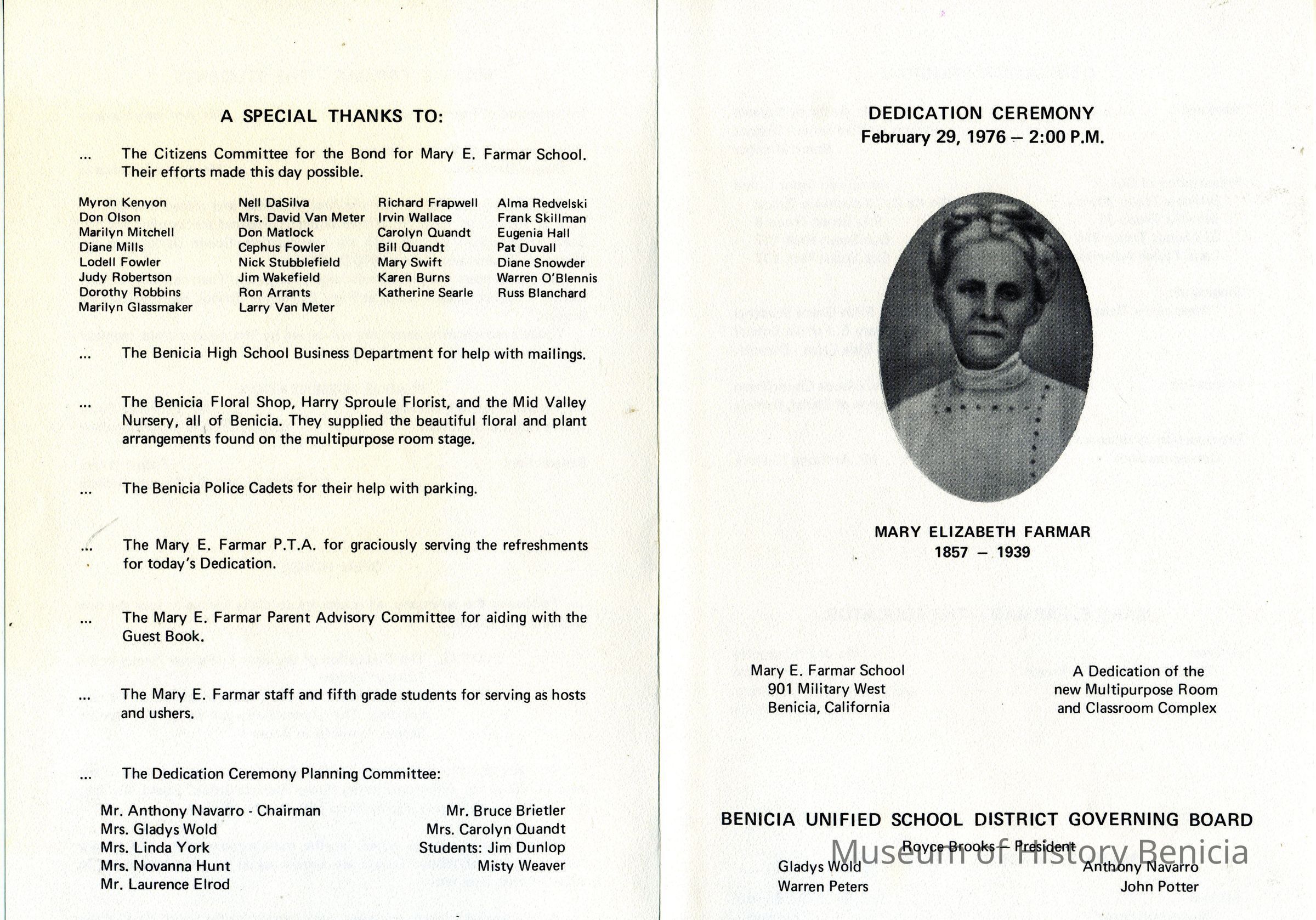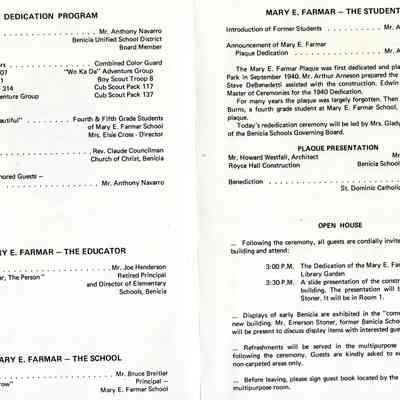 This is the program for the dedication ceremony at Mary Elizabeth Farmar schoo on 02/29/1976. It is to dedicate a new multi-purpose room and classroom complex at the school.Collection