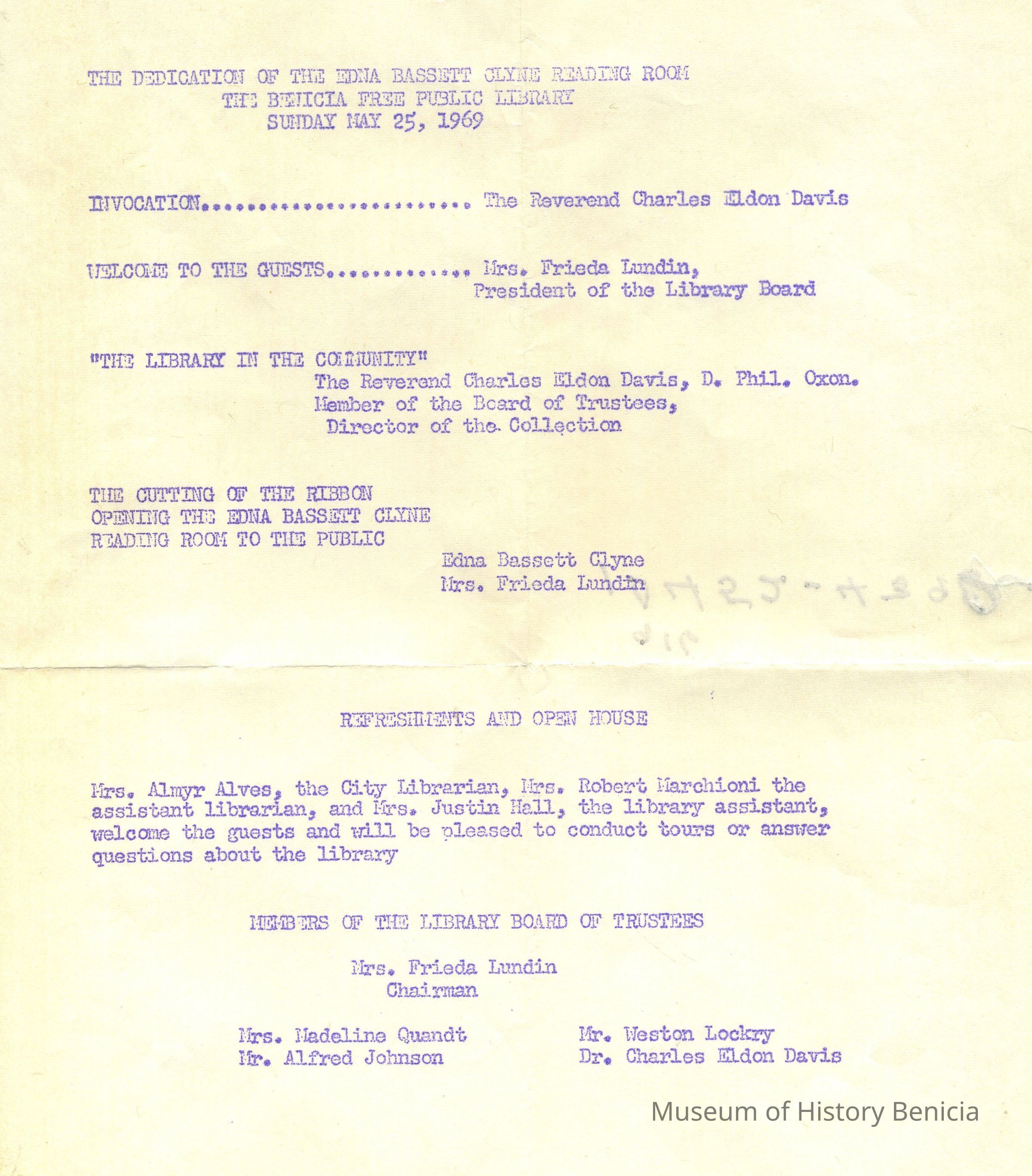 The Dedication of the Edna Bassett Clyne Reading Room