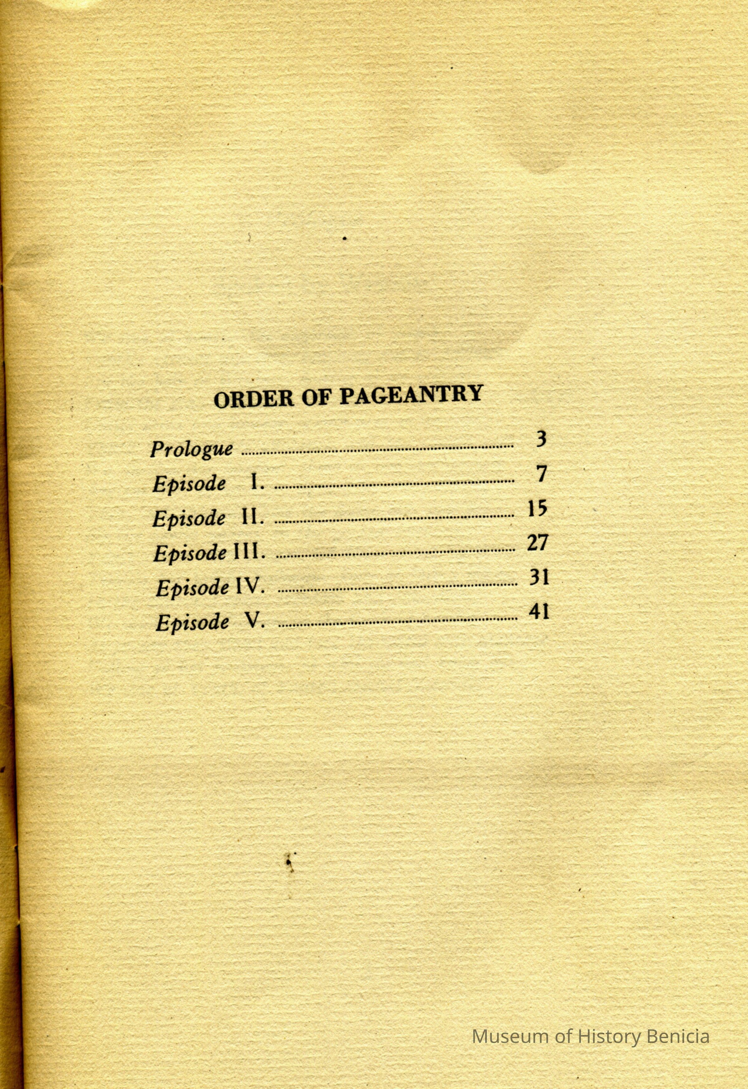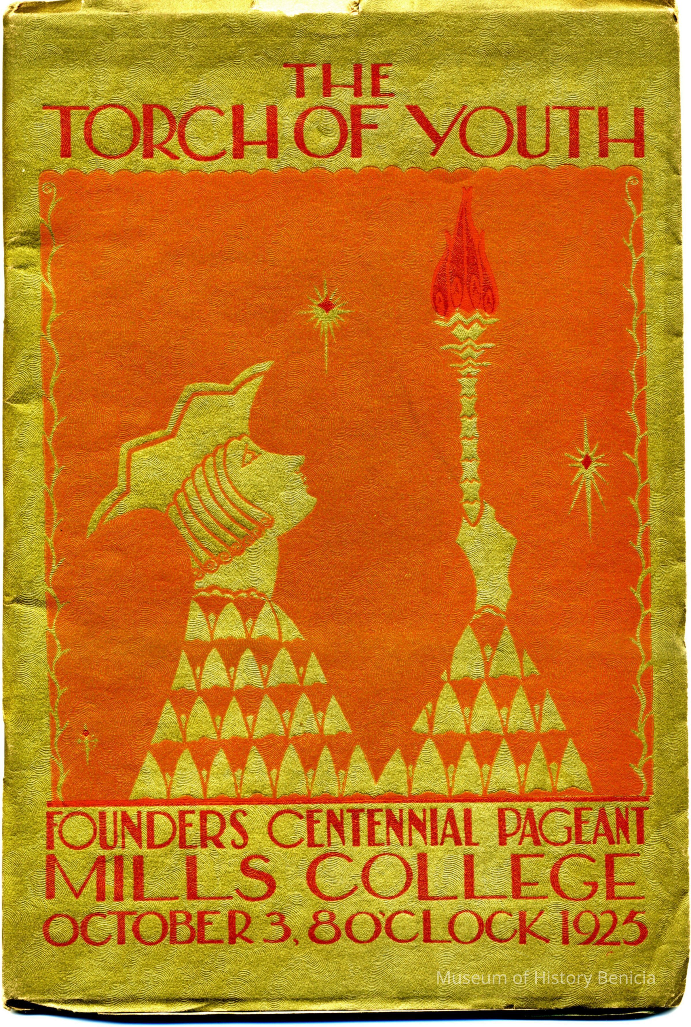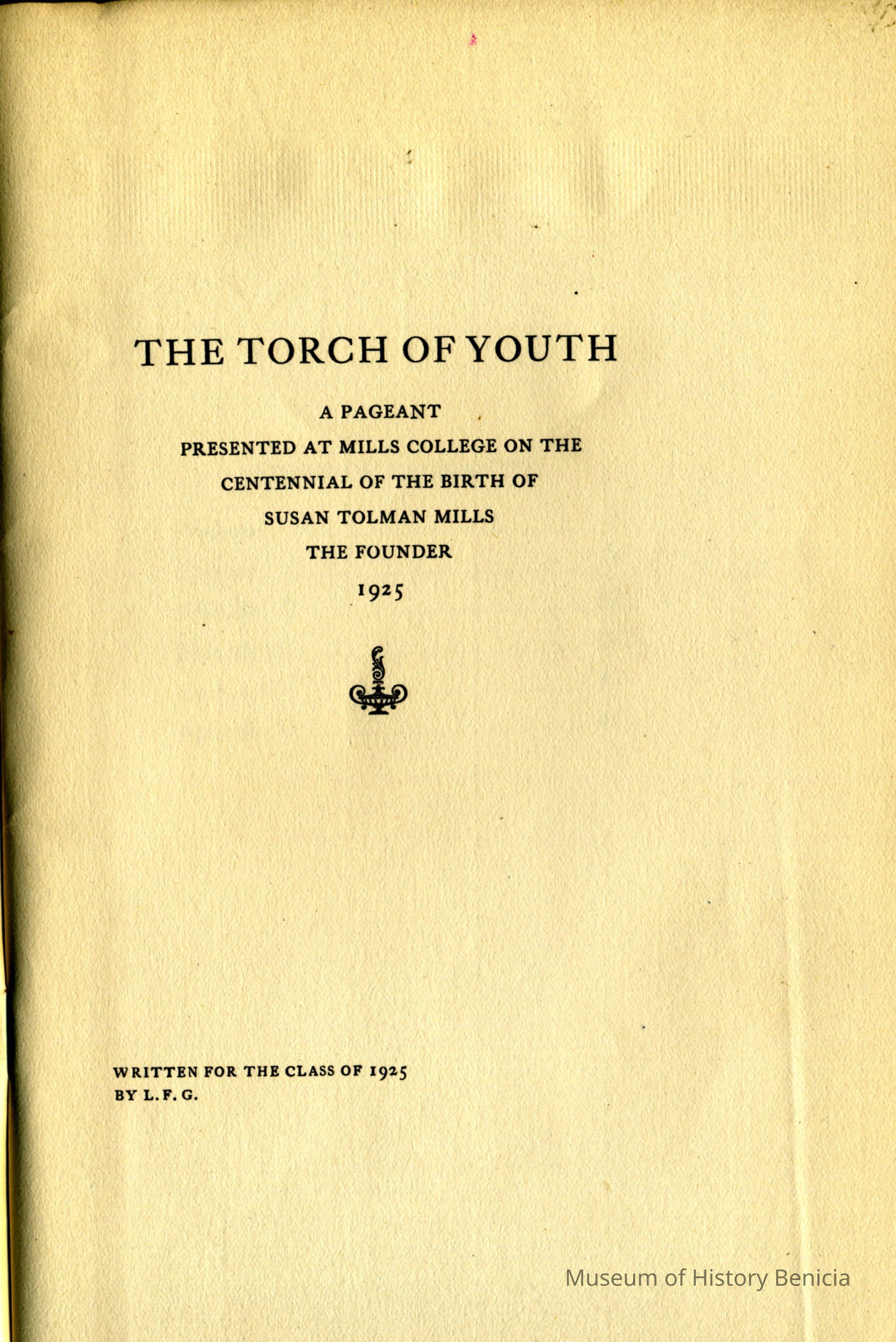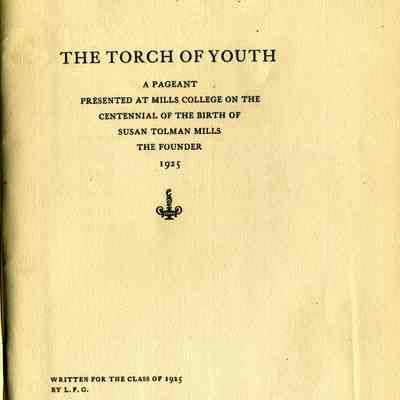 This is a program for the "Founder's Centennial Pagent" of Mills College in 1925. It is called "The Tourch of Youth". It celebrates the birth of Susan Tolman Mlls, the founder of Mills College. It is presented as a poetic play in 5 episodes.Collection