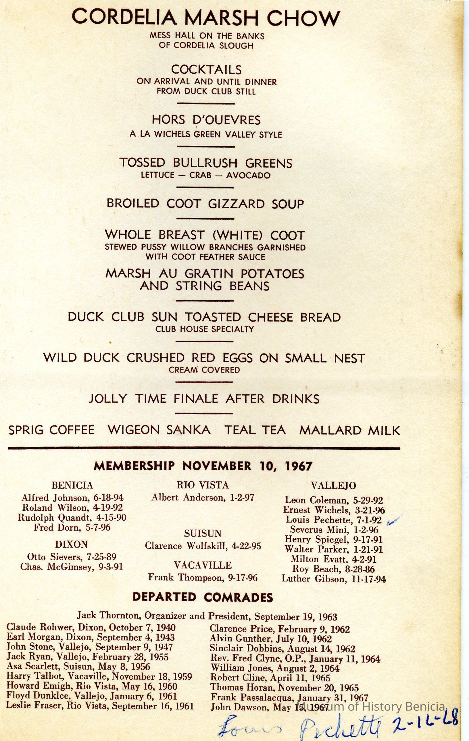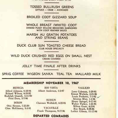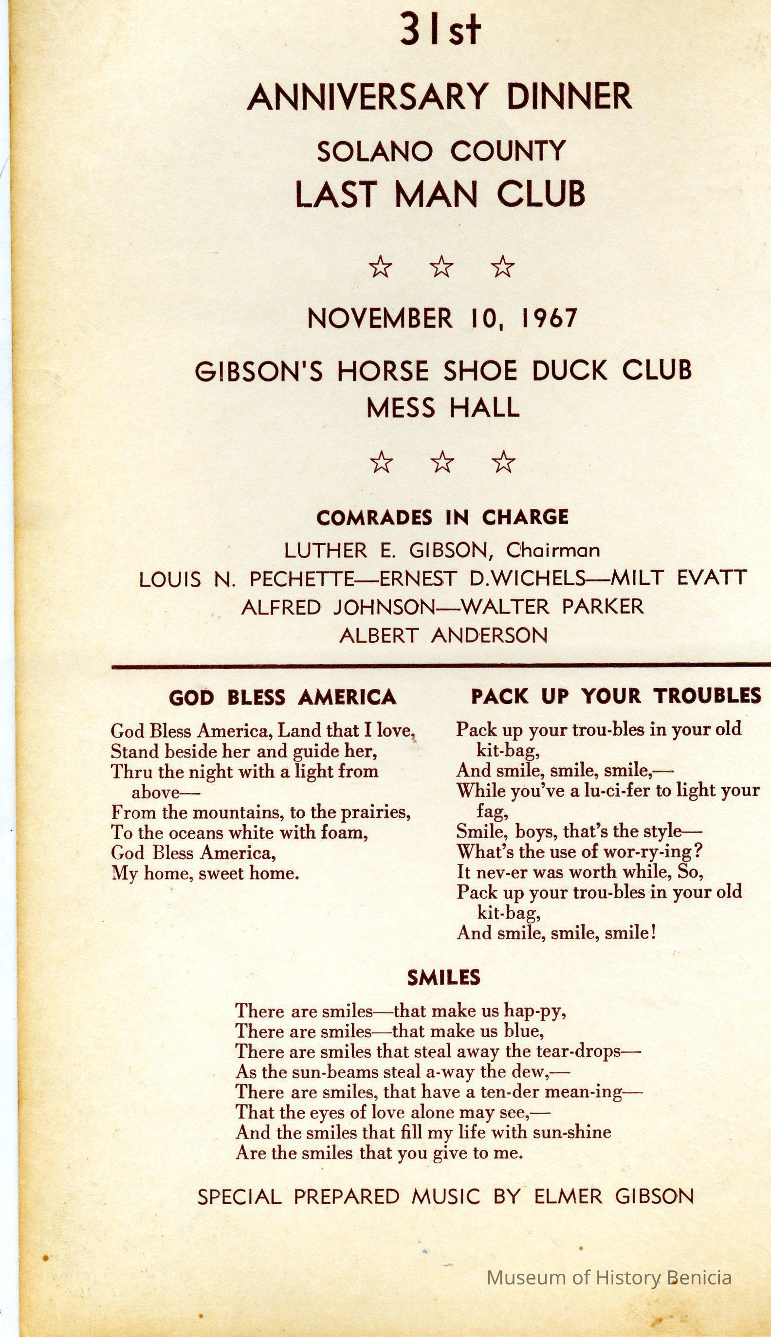 Folded heavy paper program printed in brown on yellow front cover "Solano County 37 Last Man Club Organized Nov. 10th 1937"; Inside: "31th Anniversary Dinner Solano County Last Man Club: "November 10, 1967 / Gibson's Horse Shoe Duck Club / Mess Hall"; includes menu and roster of members and those who have "departed".