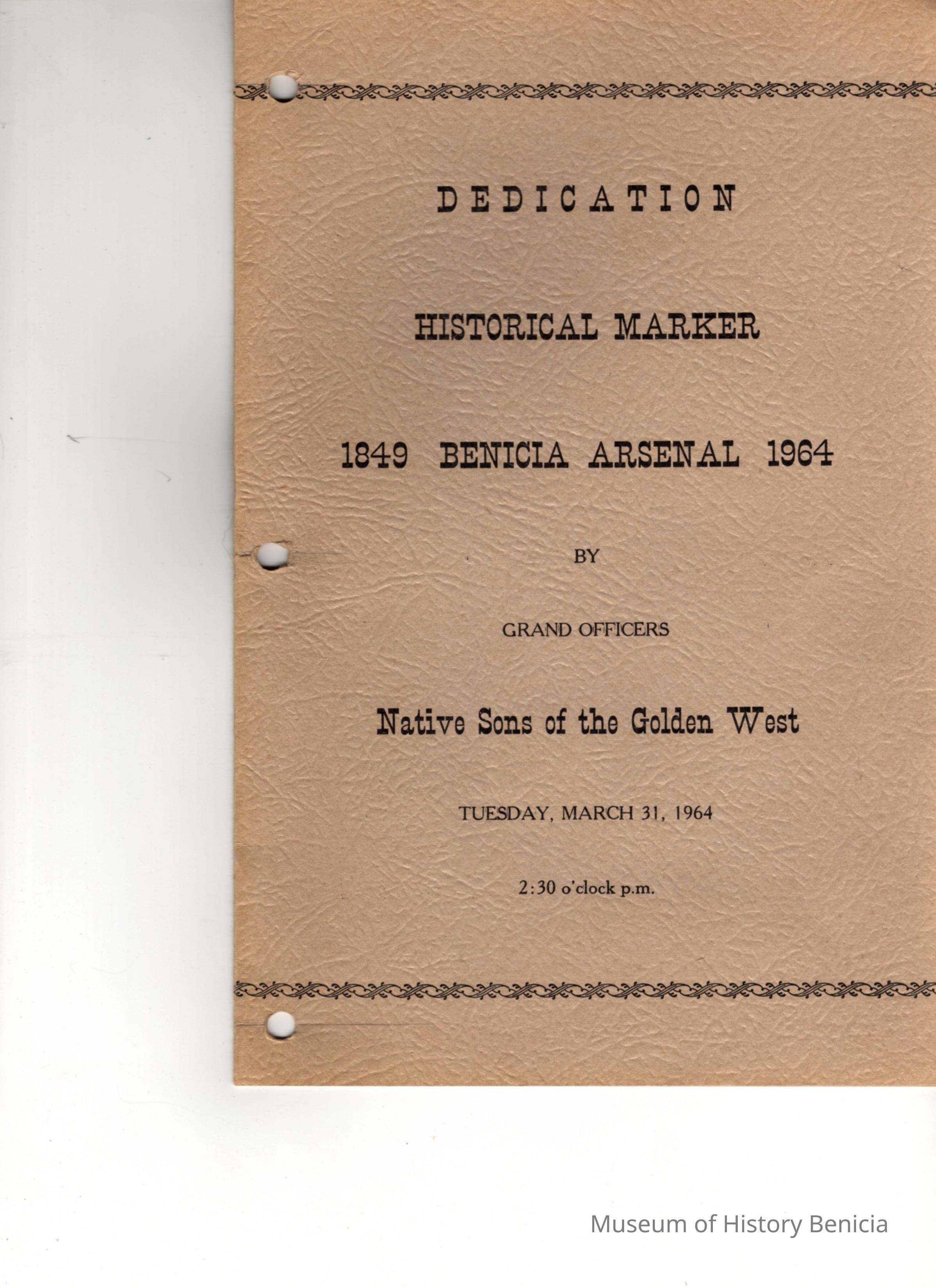 Listed: Program for the Day, committee members, grand officers (N.S.G.W.) and following dinner info 6-1/2" x 10" printed on beige pebbled cardstock, 3 hole punched (someone had in a binder)