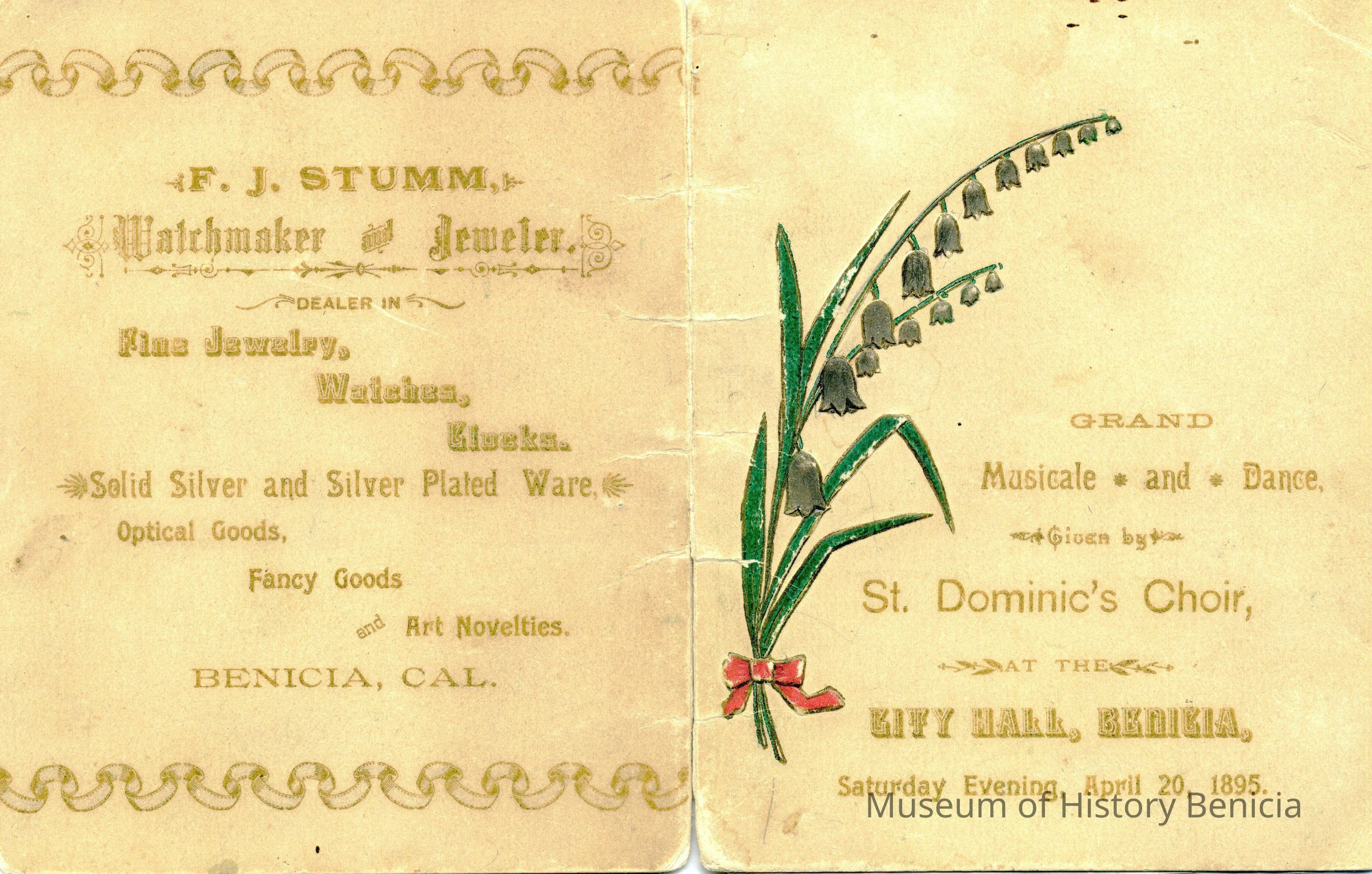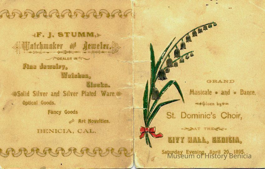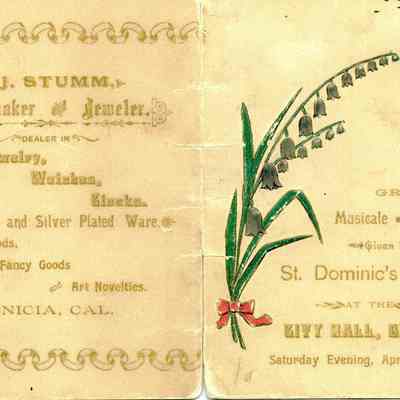This is a program for a "musicale" presented by St. Dominic's Choir in City Hall on Saturday April, 20, 1895. The back has a F.J. Stumm ad. Inside are the participants: