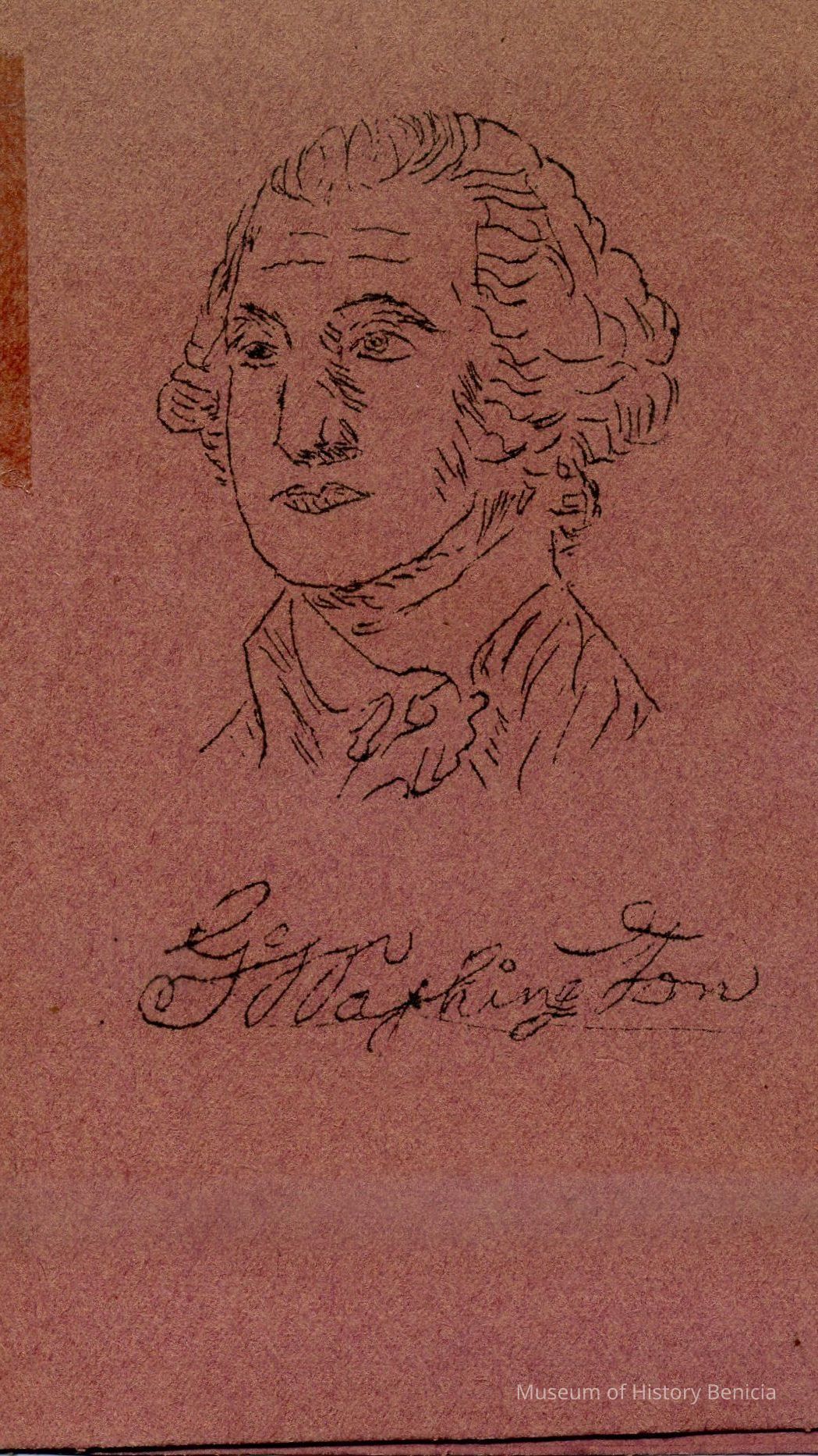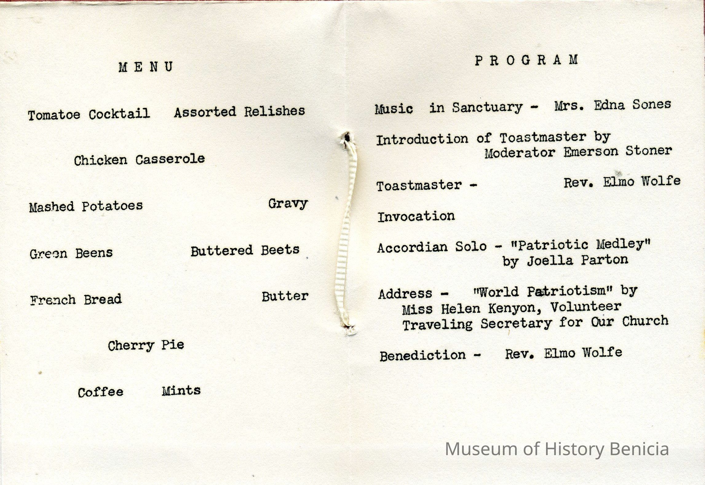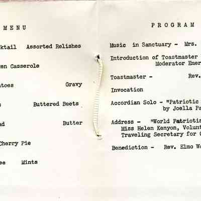 Small mimeographed program for a church banquet; mimeograph paper and construction paper materials; tied at the spine with paper ribbon. The brownish cover has a drawing of a man with the name underneath, George Washington. Page one: First Annual Washington Banquet / Community Congregational Church / Benicia, California February 20, 1948; Page two: the menu; Page three: the program, with the following people taking part: Edna Sones, Emerson Stoner, Rev. Elmo Wolfe, Joella Parton, and Helen Kenyon.Collection