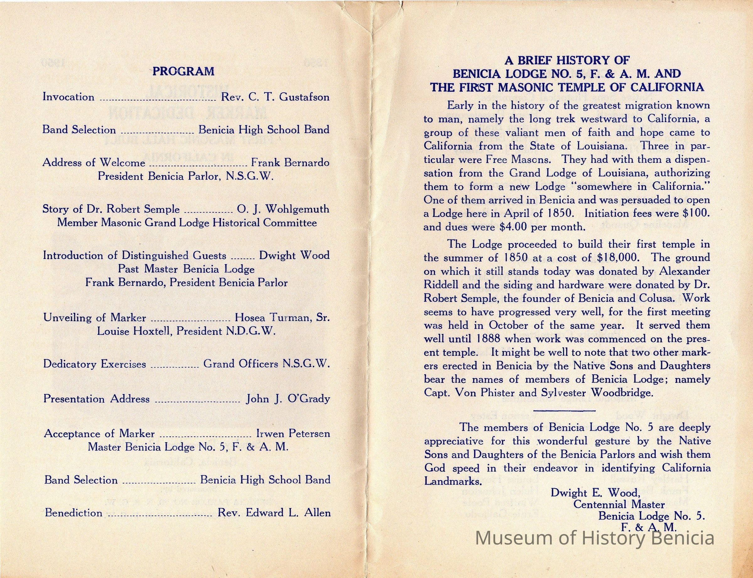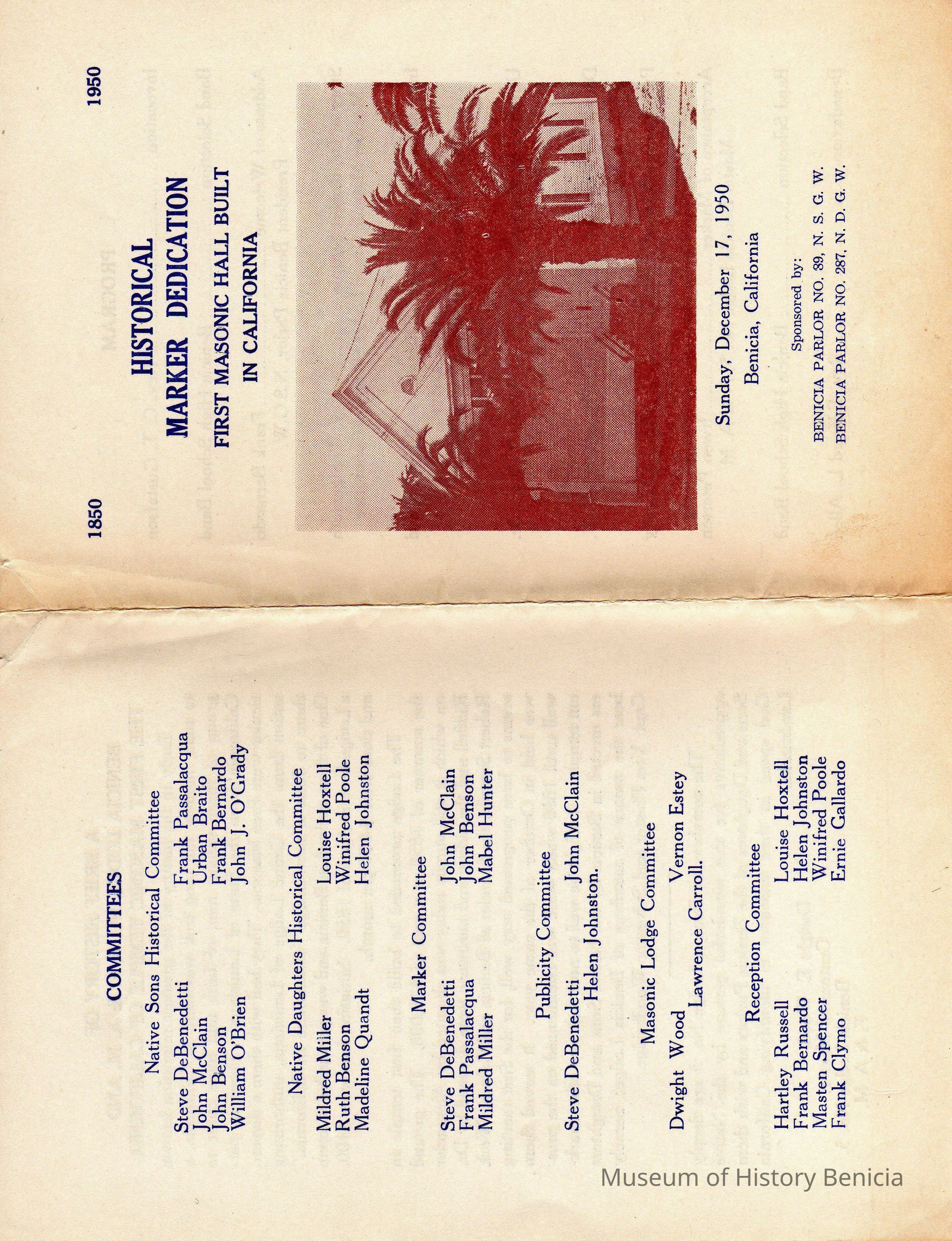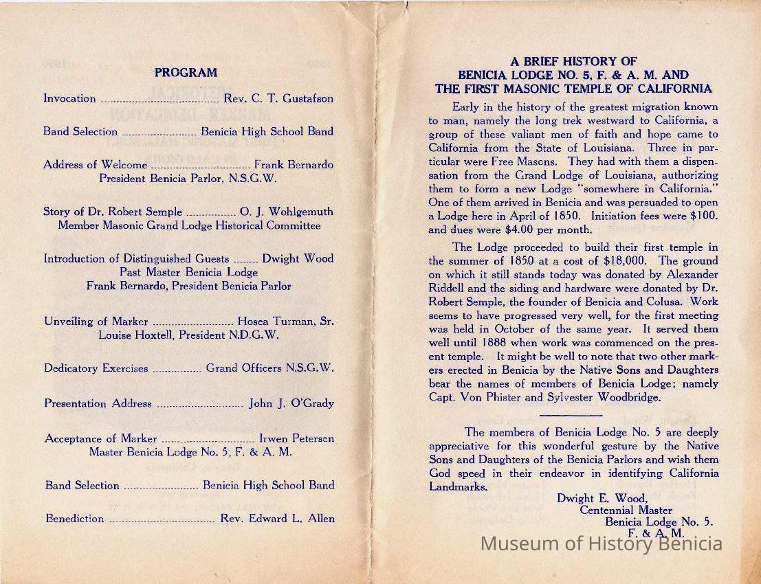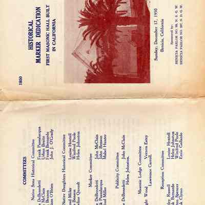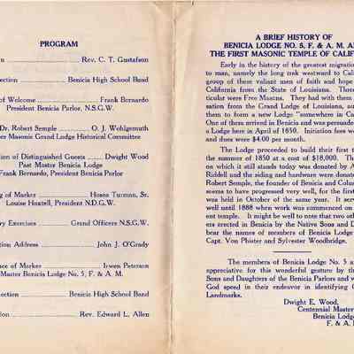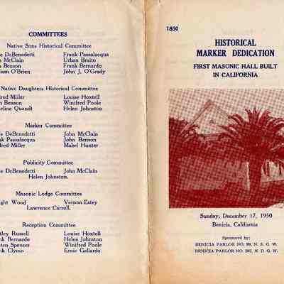 Historical Marker celebration program for the first Masonic Temple in California.