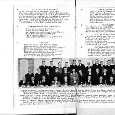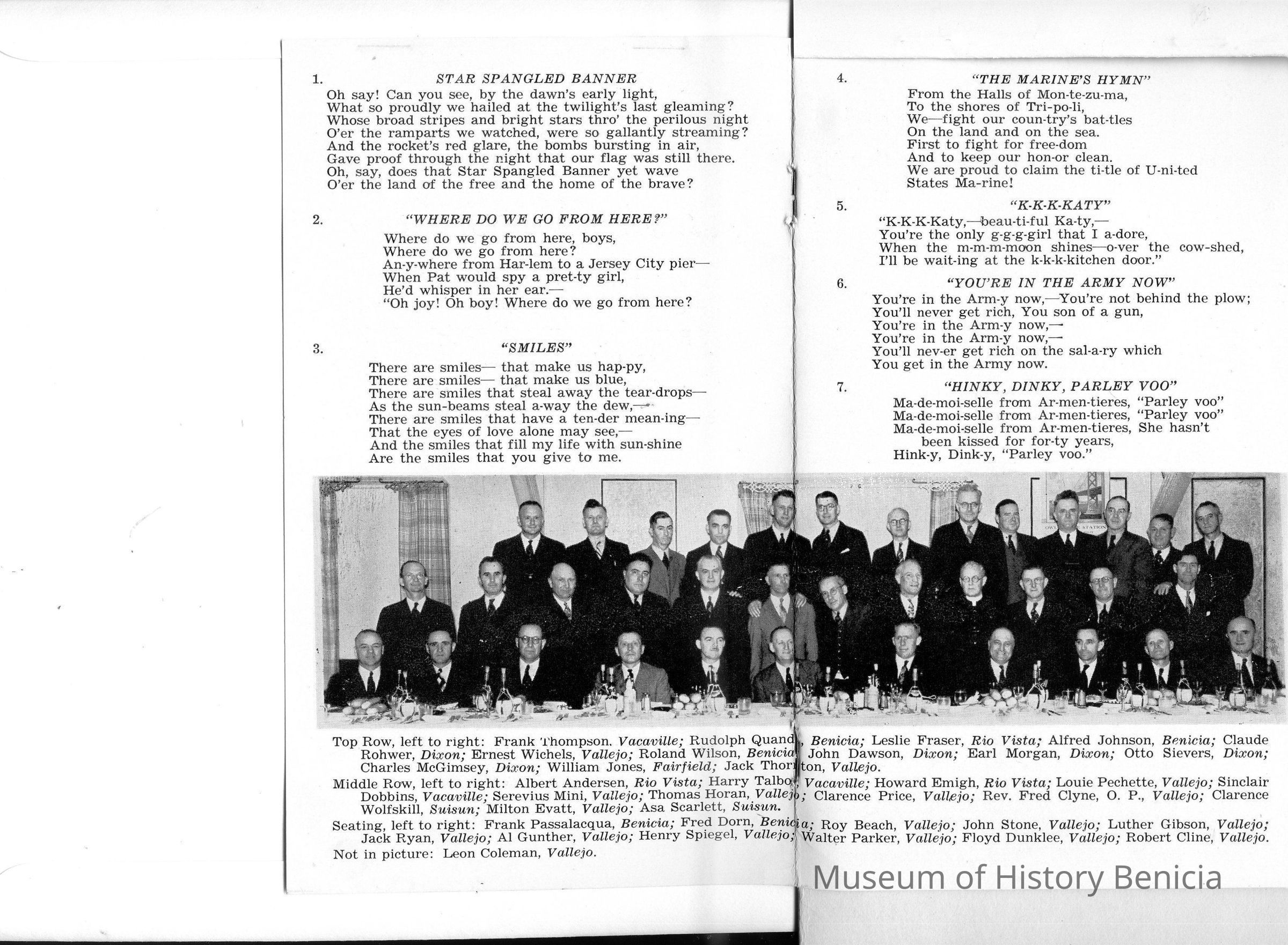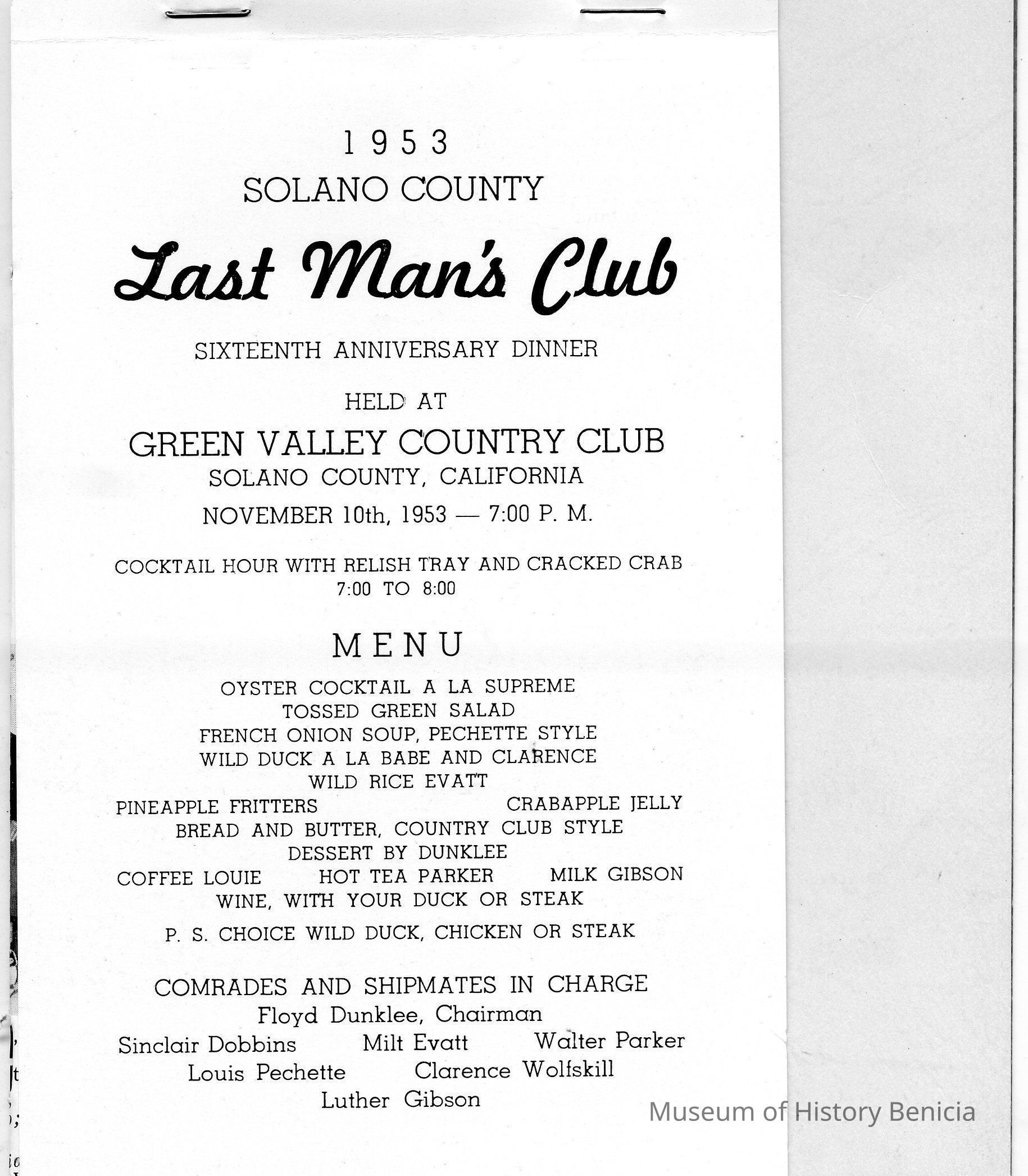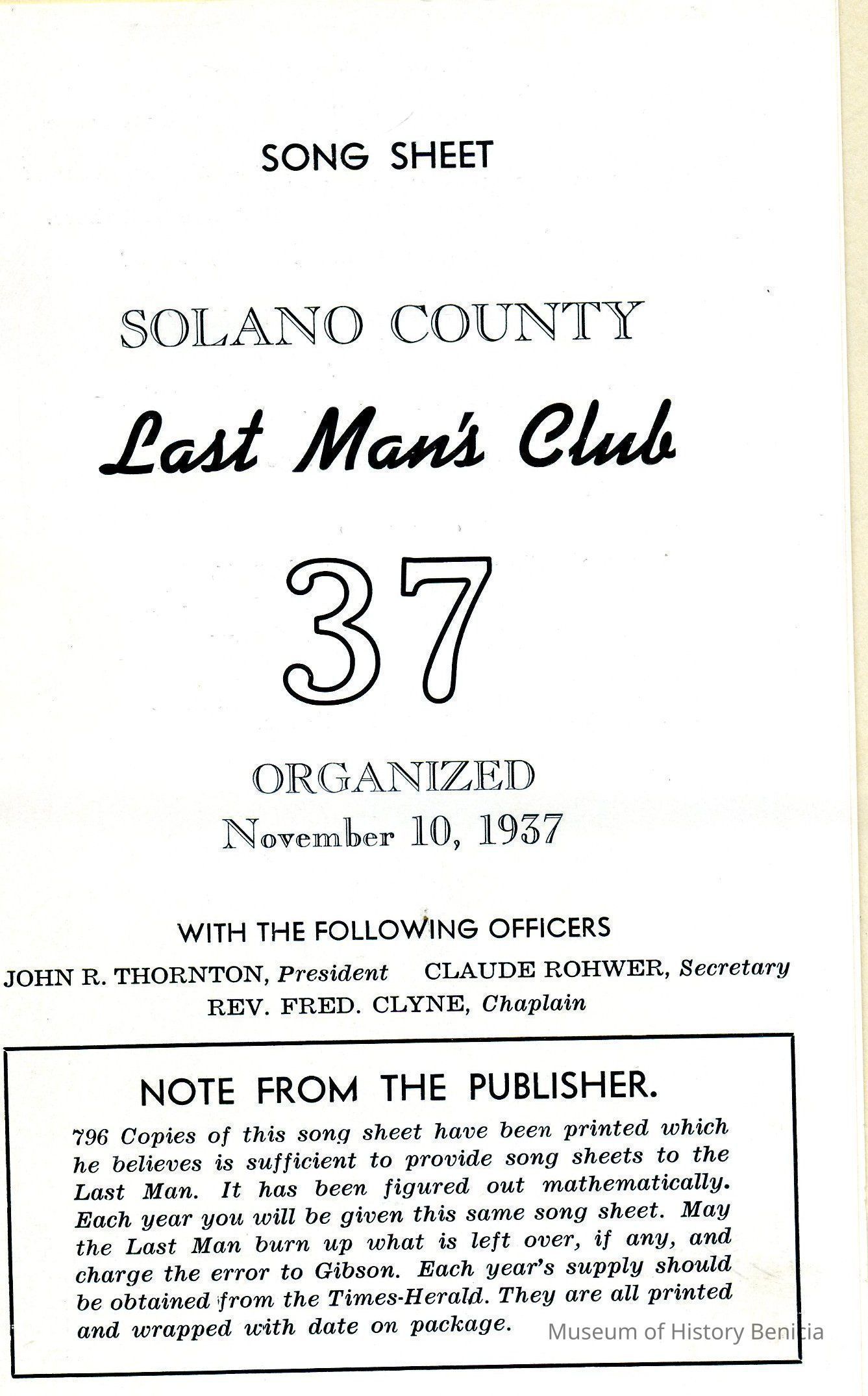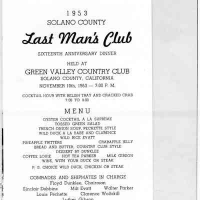 Folded heavy paper program printed in dark brown on light brown front cover "Solano County 37 Last Man Club Organized Nov. 10th 1937"; Inside: "16th Anniversary Dinner Solano County Last Man Club: "November 10, 1953 / Green Valley Country Club"; includes menu and roster of members and those who have "departed". Also has a "Song Sheet" and a photograph witth an identification of all in the photograph.