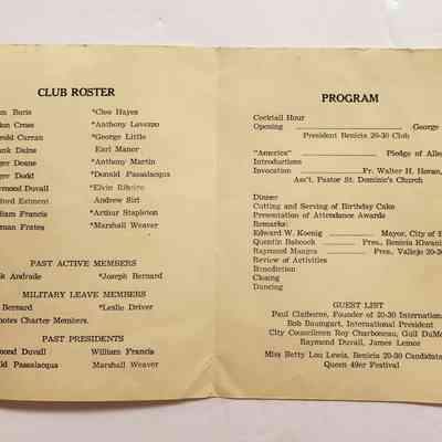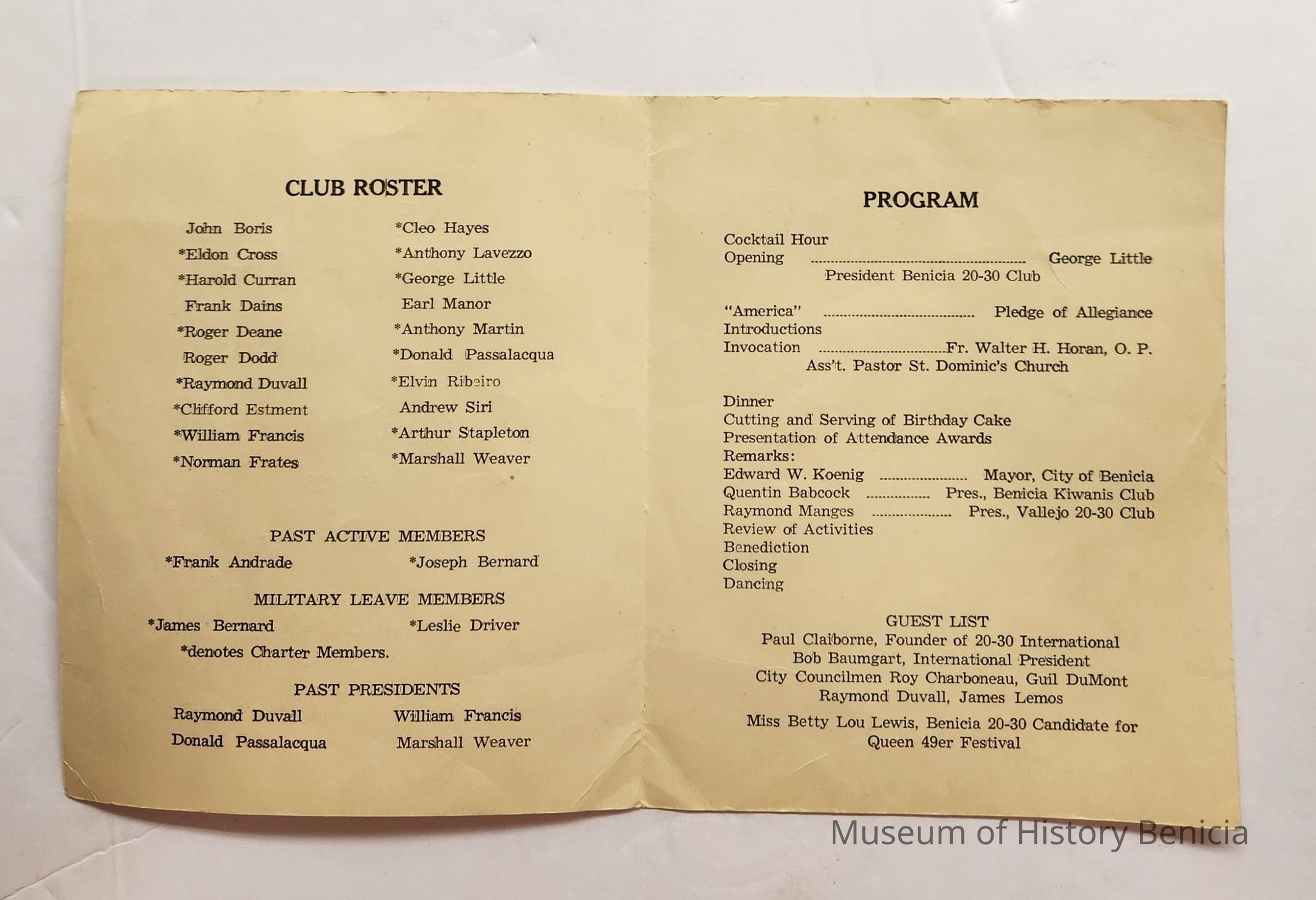 Program for Second Anniversary of the Benicia 20-30 Club Charter. Black ink on beige paper.