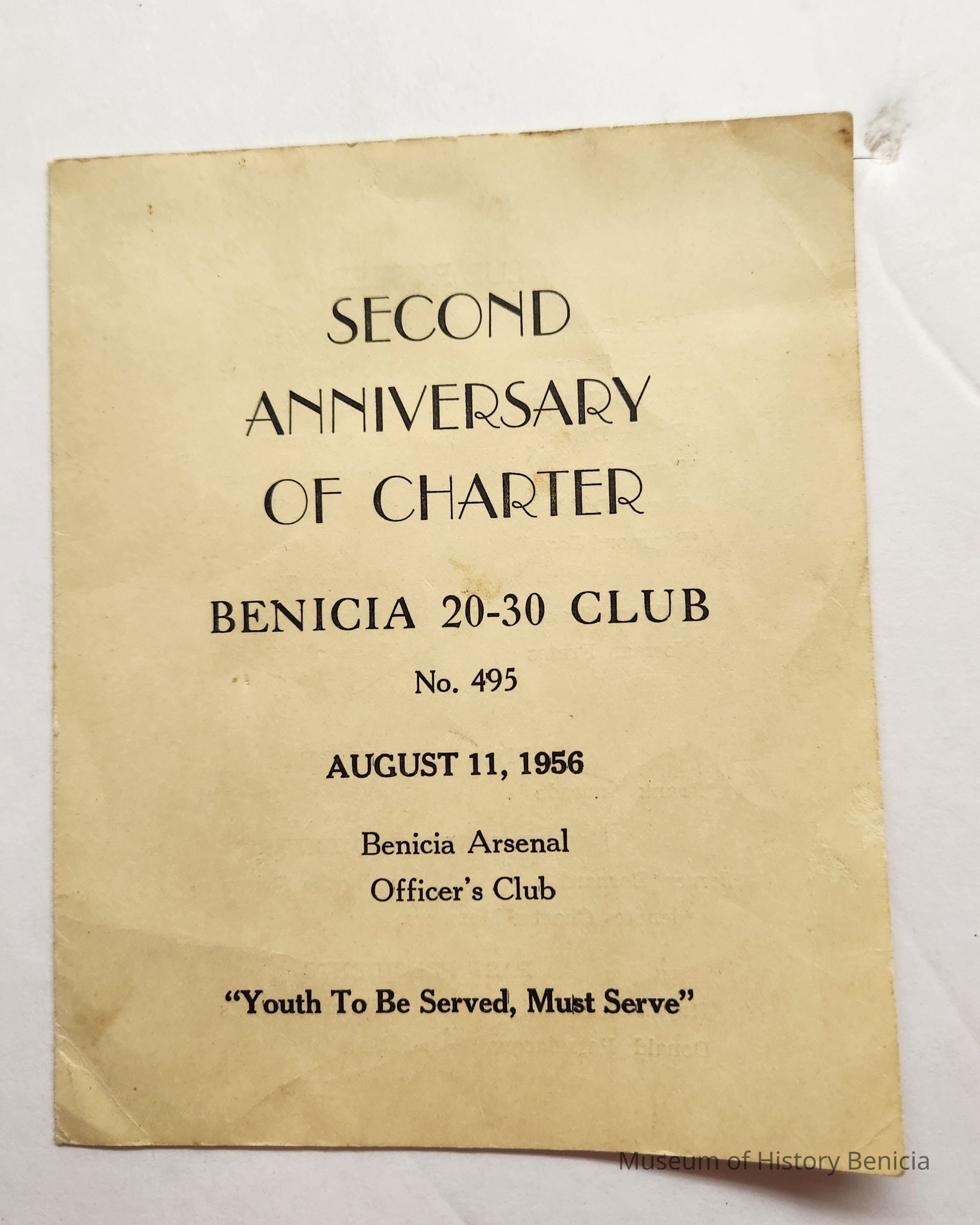 Front: Second Anniversary of Charter Benicia 20-30 Club No. 495 August 11, 1956, Benicia Arsenal Officers' Club.