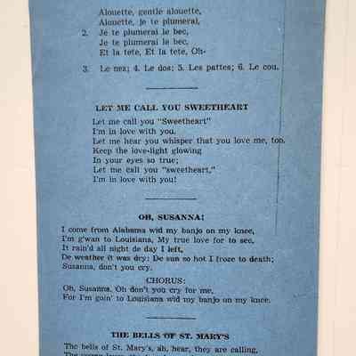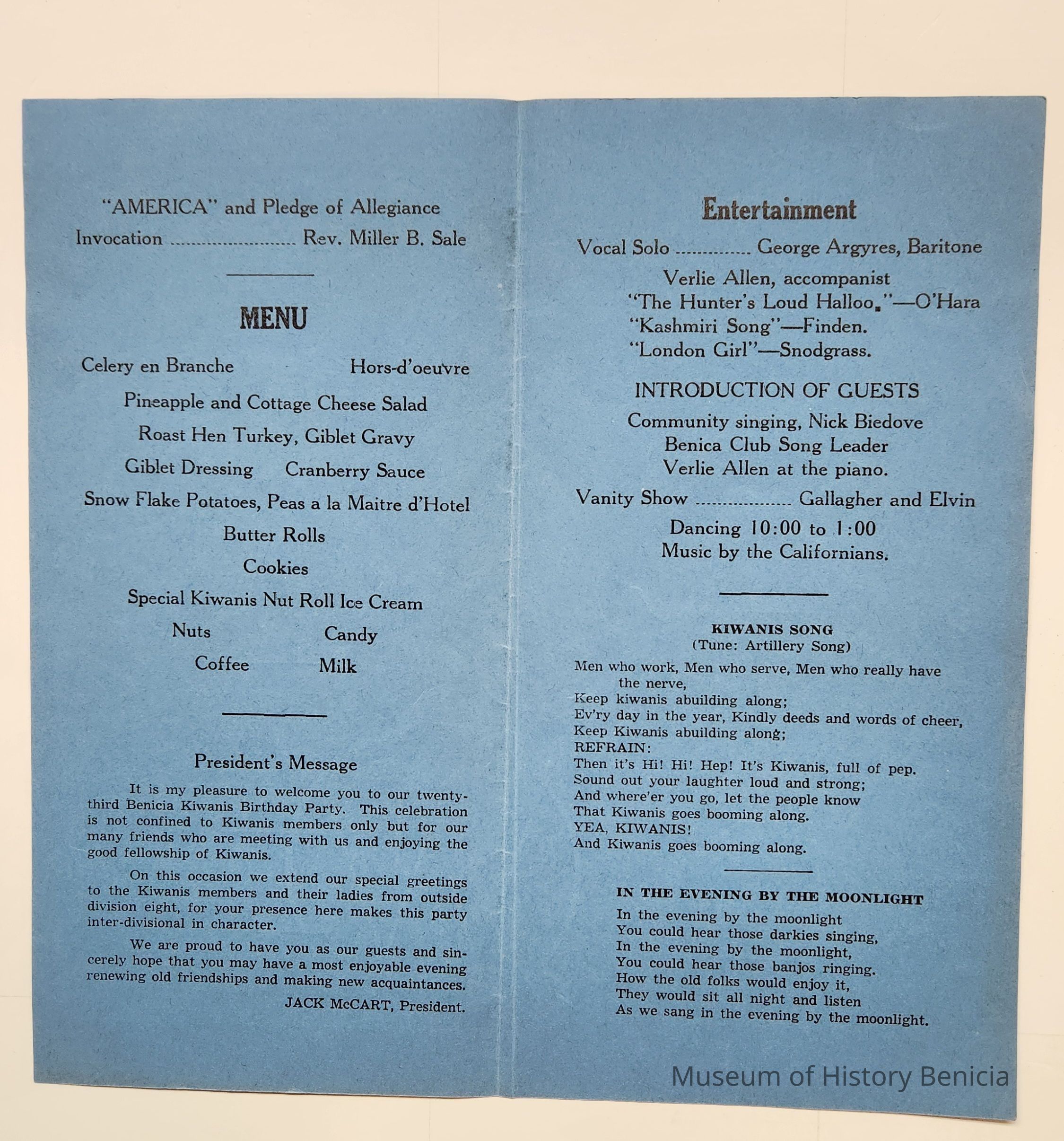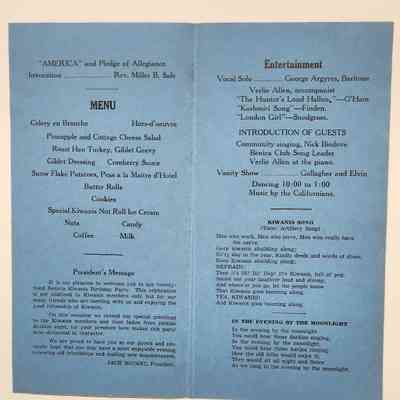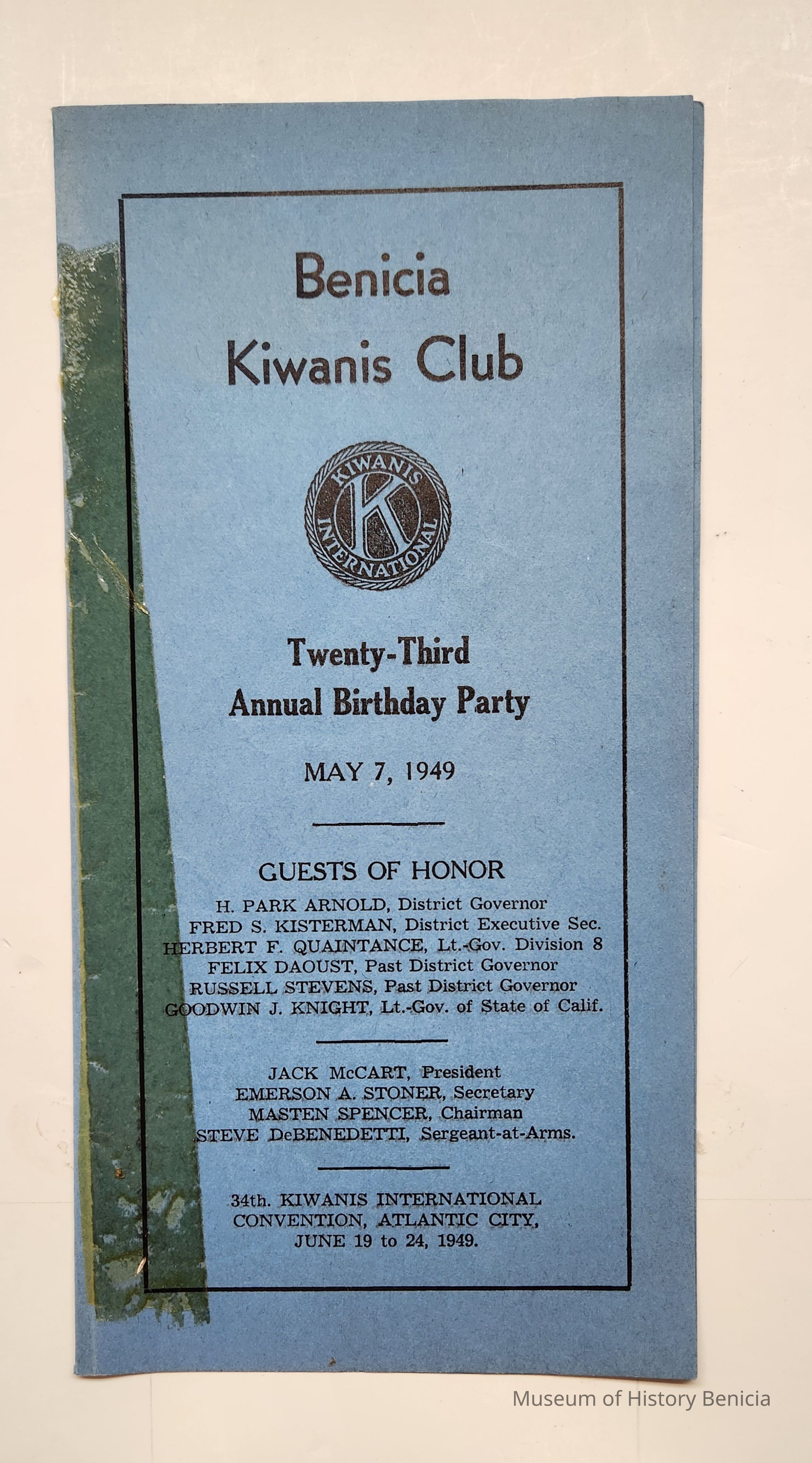 Program for Benicia Kiwanis Club Twenty-third Annual Birthday Part y, May 7, 1049. The cover listed the names of guests of honor and local officers. At the bottom: 34th Kiwanis International Convention, Atlantic Cit y, June 19 to 24, 1949. Inside is the menu, the President's message, entertainment for the event and words to various songs which continue to the back page. Lastly: Kiwanis floral emblem prepared by Frank Passalacqua, Benicia Kiwanis Club. Black ink on blue paper.Collection