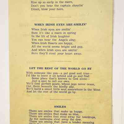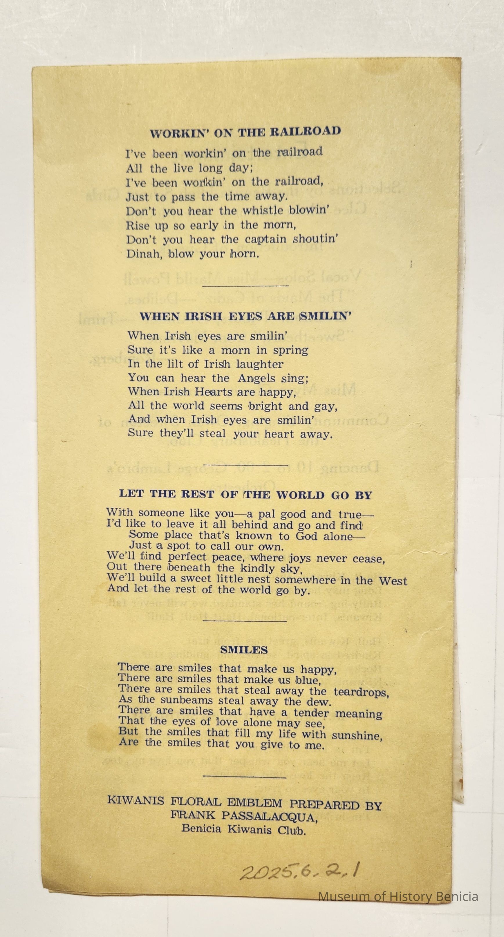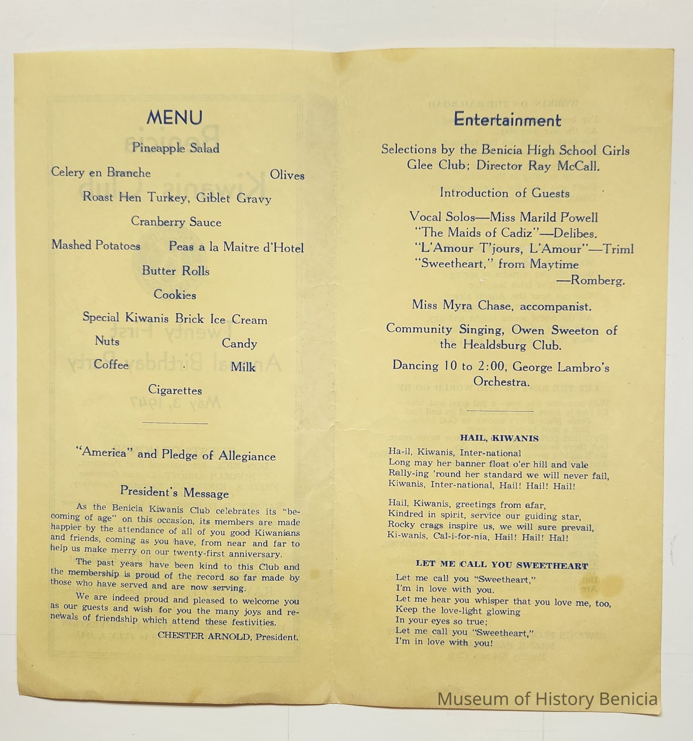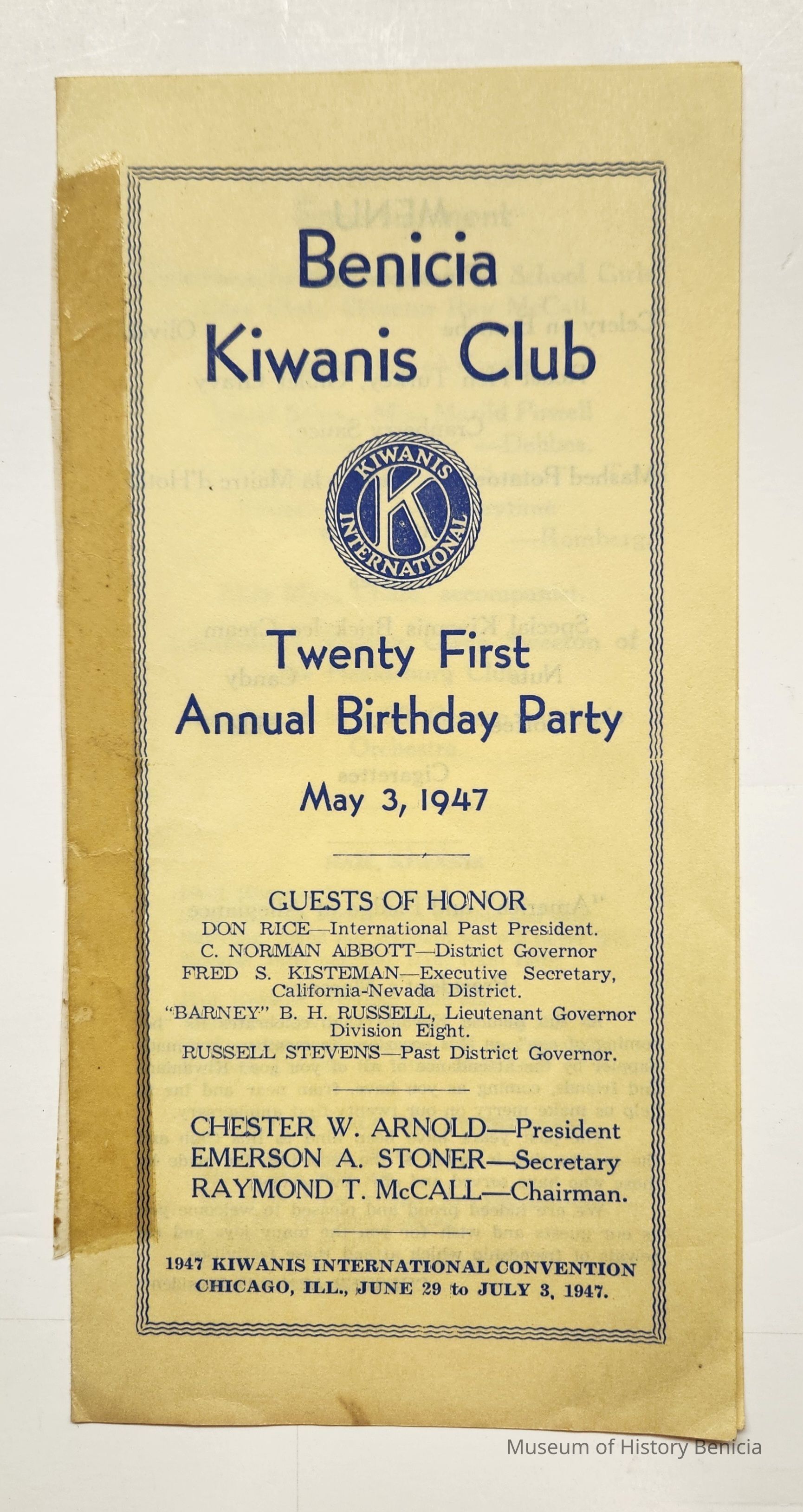 Program from Benicia Kiwanis Club, Twenty First Annual Birthday Party, May 3, 1947. On the cover are the names of the guests of honor and local officers. At the bottom: 1947 Kiwanis International Convention Chicago, Ill, June 29 - July 3, 1947. Inside s the menu, the President's message, the entertainment for the event and words to various songs which continue on to the back page. Lastly: Kiwanis floral emblem prepared by Frank Passalacqua, Benicia Kiwanis Club. Blue in on yellow paper.Collection