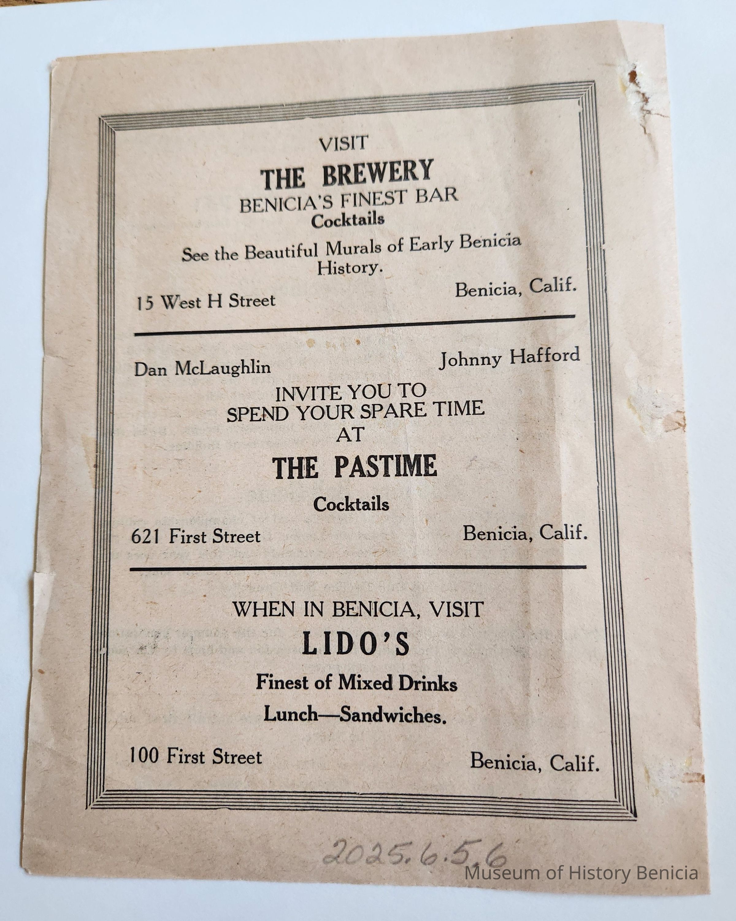 Back: Ads for The Brewery, The Pastime, and Lido's