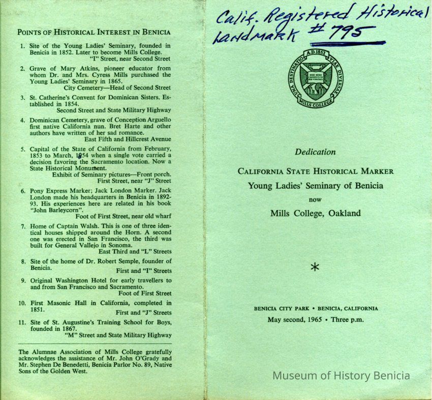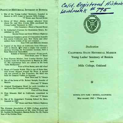 This is a program for the dedication of a California Historical Marker for the Young Ladies's Seminary in Benicia now Mills College, Oakland..Collection