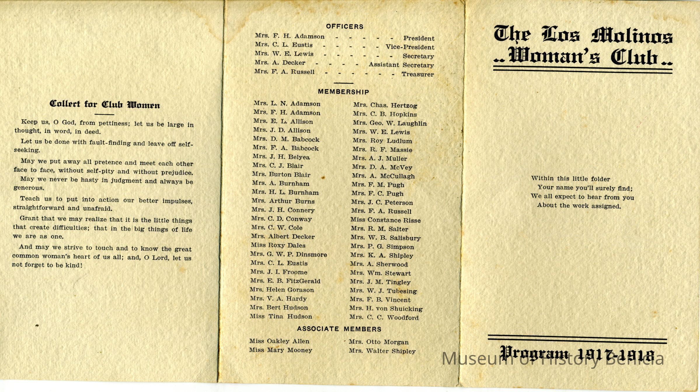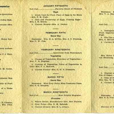 Program for the Los Molinos Women's Club from 1918. (Los Molinos is a district in Tehama county in Northern California.) The program lists the area of study for Home Economics from October, 1917 to June, 1918.Collection
