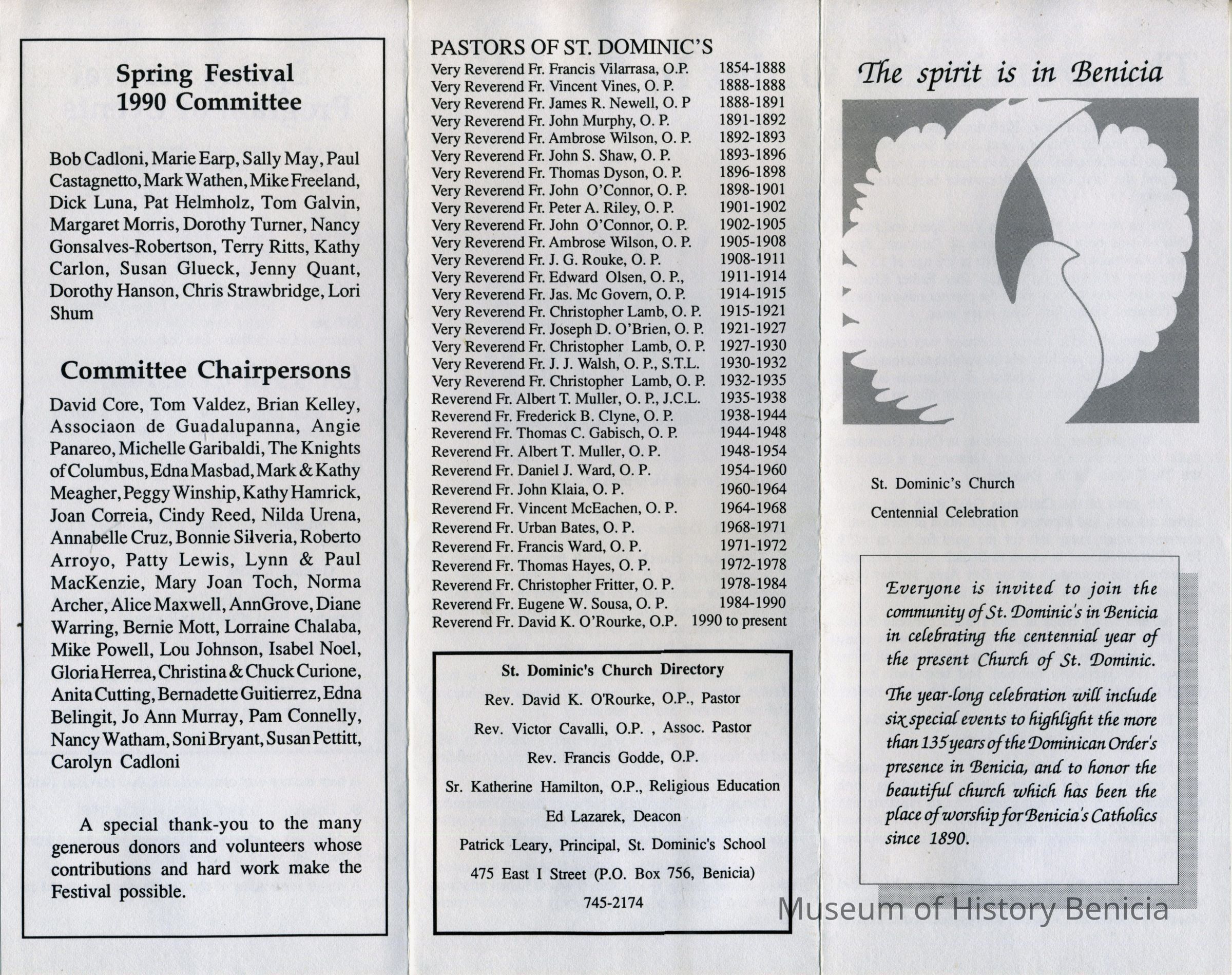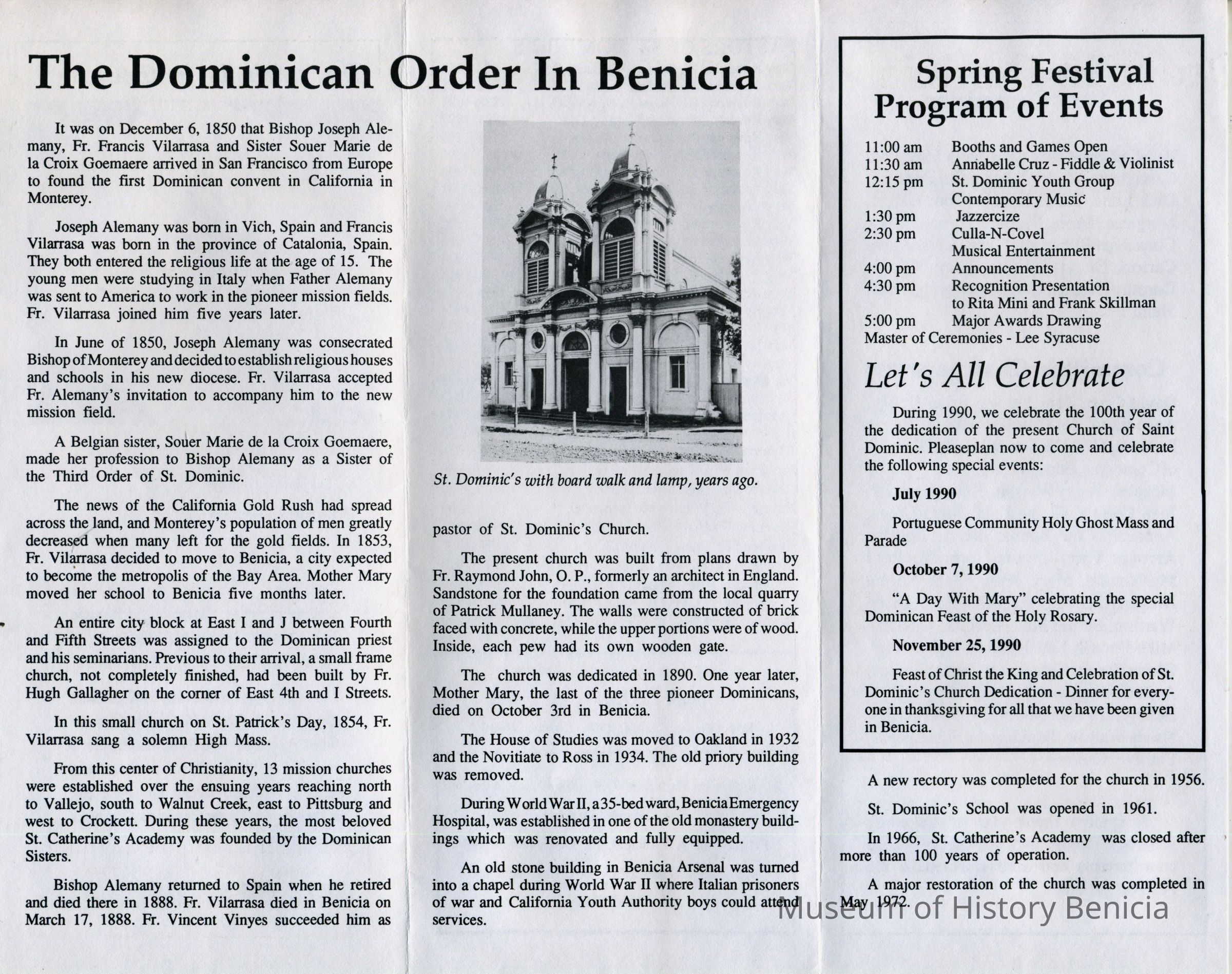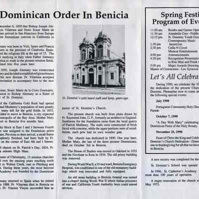 Official Program for St. Dominic's Centennial Celebration. It gives a history of the Dominican Order in Benicia and lists the program of events for various events in 1990. On the back is a list of Pastors of St. Dominic's from 1854 to 1990.Collection