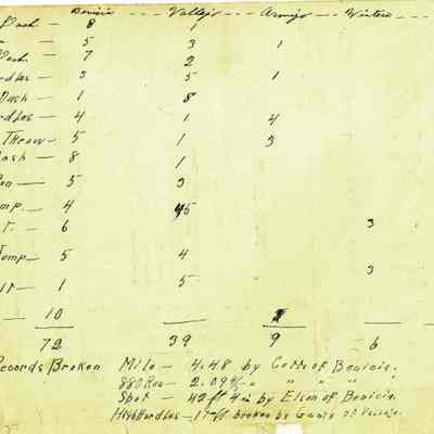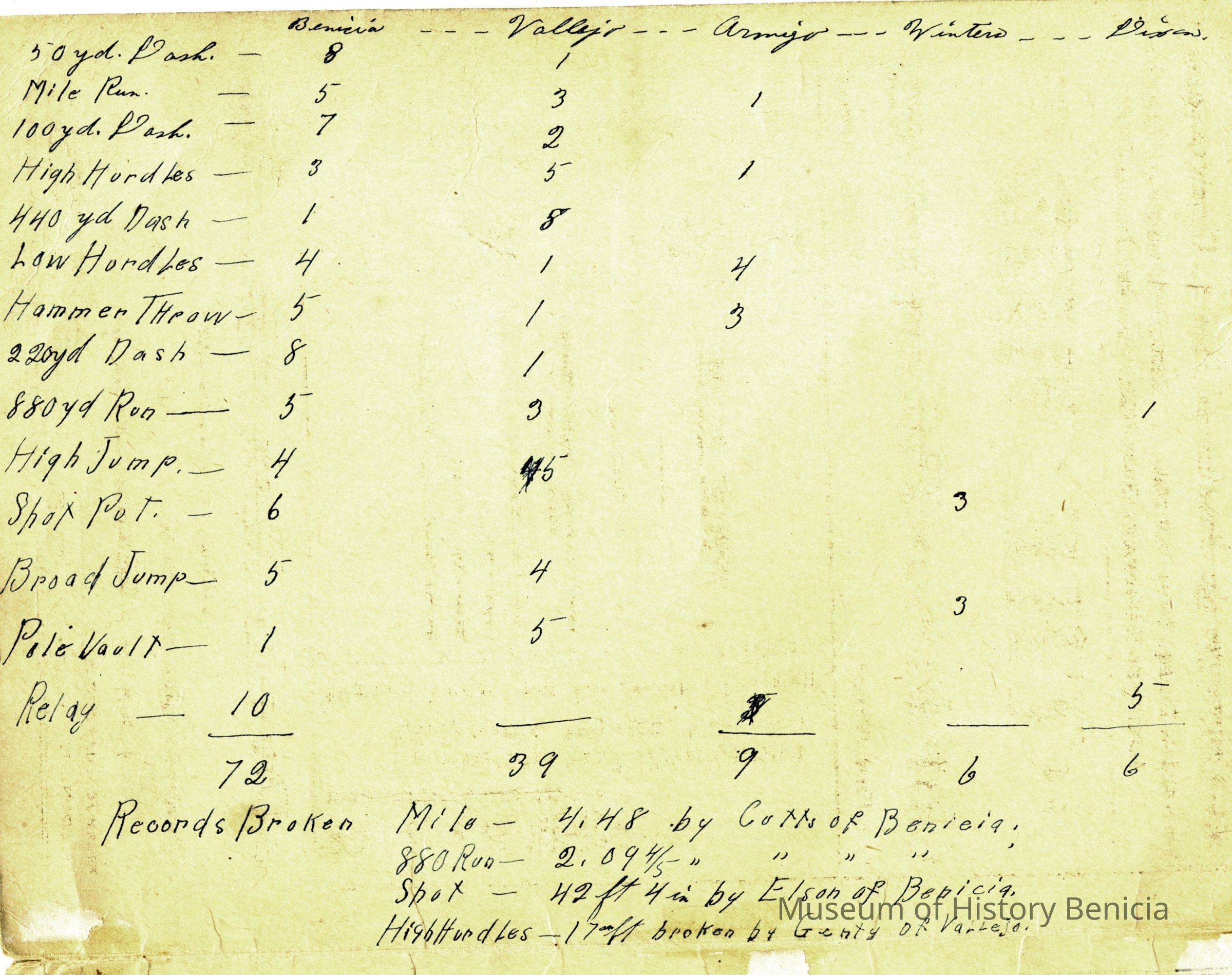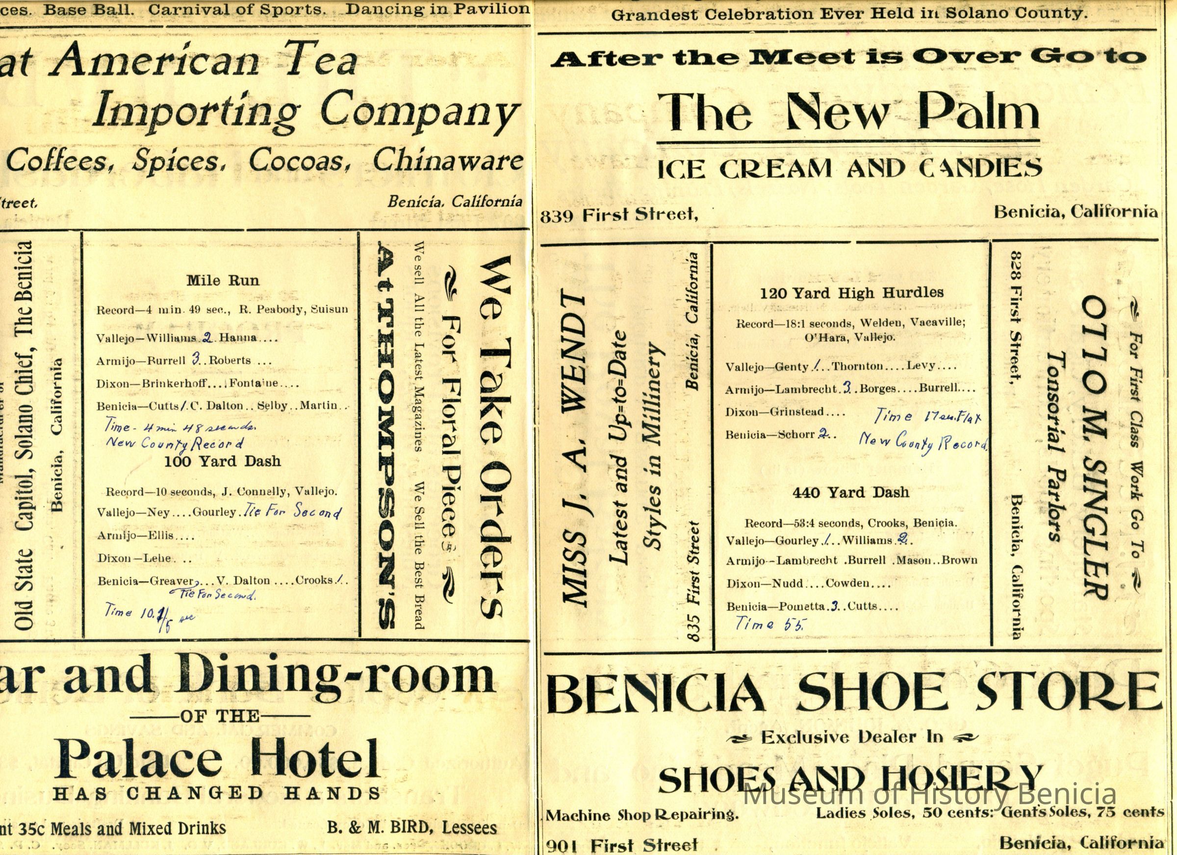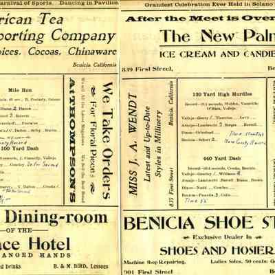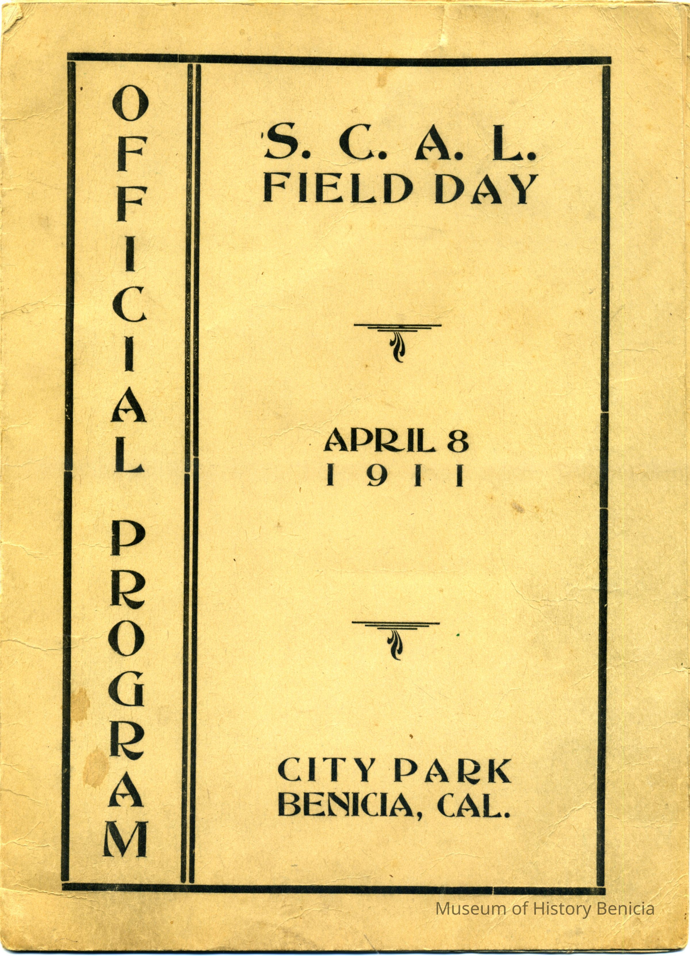 This is a brochure from the S.C.A.L. (Solano County Athletic League) for 1911. It shows the events from that day, the records for each event, and the competitors. Somebody has wriutten in the order of finish and times recorded for each person. It also has numerous advertisements.Collection